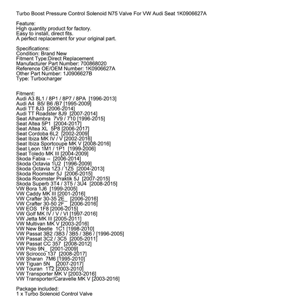 SAFE & SECURE SHOPPING 100% SATISFACTION GUARANTEED FAST SHIPPING Store Categories Store Categories Other eBay Motors Grille You may also like 292PCS Clip For Toyota Fender Wheel Rocker Panel Moulding Retainer Assortment U4 29.44 USD 30.99 USD Free shipping 5% off For Philips 12728 Premium Vision S2 35/35W BA20d +30% Motorcycle Phare Bulb U4 9.64 USD Free shipping Rear Arm Assembly Knuckle Bushing For Toyota Highlander Camry Avalon Lexus U1 U4 31.64 USD Free shipping Fuel Filler Tube Grommet 4002010 for Chrysler Dodge Plymouth 1984-1989 13.65 USD Free shipping Black/Grey checkered Red Mirror Cover for MINI Cooper Hardtop F55 F56 SG U4 32.65 USD Free shipping Diverter Recirculation Dump Valve for VW Seat Skoda 1.8T 06A145710N D1 U4 14.65 USD Free shipping Turbo Boost Pressure Control Solenoid N75 Valve for VW for Audi 1K0906627A TG U4 Product Description Turbo Boost Pressure Control Solenoid N75 Valve For VW For Audi For Seat 1K0906627A Feature: High quantity product for factory. Easy to install, direct fits. A perfect replacement for your original part. Specifications: Condition: Brand New Fitment Type:Direct Replacement Manufacturer Part Number: 700868020 Reference OE/OEM Number: 1K0906627A Other Part Number: 1J0906627B Type: Turbocharger Fitment: For Audi A3 8L1 / 8P1 / 8P7 / 8PA [1996-2013] For Audi A4 B5/ B6 /B7 [1995-2009] For Audi TT 8J3 [2006-2014] For Audi TT Roadster 8J9 [2007-2014] For Seat Alhambra 7V9 / 710 [1996-2015] For Seat Altea 5P1 [2004-2017] For Seat Altea XL 5P8 [2006-2017] For Seat Cordoba 6L2 [2002-2009] For Seat Ibiza MK IV / V [2002-2016] For Seat Ibiza Sportcoupe MK V [2008-2016] For Seat Leon 1M1 / 1P1 [1999-2006] For Seat Toledo MK III [2004-2009] For Skoda Fabia -- [2006-2014] For Skoda Octavia 1U2 [1996-2009] For Skoda Octavia 1Z3 / 1Z5 [2004-2013] For Skoda Roomster 5J [2006-2015] For Skoda Roomster Praktik 5J [2007-2015] For Skoda Superb 3T4 / 3T5 / 3U4 [2008-2015] For VW Bora 1J6 [1999-2005] For VW Caddy MK III [2001-2016] For VW Crafter 30-35 2E_ [2006-2016] For VW Crafter 30-50 2F_ [2006-2016] For VW EOS 1F8 [2006-2015] For VW Golf MK IV / V / VI [1997-2016] For VW Jetta MK III [2005-2011] For VW Multivan MK V [2003-2016] For VW New Beetle 1C1 [1998-2010] For VW Passat 3B2 /3B3 / 3B5 / 3B6 / [1996-2005] For VW Passat 3C2 / 3C5 [2005-2011] For VW Passat CC 357 [2008-2012] For VW Polo 9N_ [2001-2009] For VW Scirocco 137 [2008-2017] For VW Sharan 7M6 [1995-2010] For VW Tiguan 5N_ [2007-2017] For VW Touran 1T2 [2003-2010] For VW Transporter MK V [2003-2016] For VW Transporter/Caravelle MK V [2003-2016] Package included: 1 x Turbo Solenoid Control Valve About Us Shipping Terms Contact Us About Us Bruce & Shark is a company Focus on Motorcycle parts more than 11 years. The design inspiration comes from the awe of the vast sea and worship of the fighting sharks, therefore Bruce & Shark takes a shark as brand logo. Since its inception, we have always put the "customer first" and "top quality" as our principle. We specialized in selling Motorcycle parts and providing customers with various types of high-quality products. Our brand Bruce & Shark has enjoyed good reputation in America, Europe, Japan, Canada and Africa, covering more than 30 countries. Our vision is to deliver high-quality Motorcycle parts products and sincere services to the world. Our main products are motorcycle mounted, fuel pump, stator, windshield, Seat Cover, motorcycle fairing. Welcome to our shop to choose products that are worth more for your Motorcycle! Please Add me to your list of favorite sellers and visit often. Thank you for your business. Shipping Shipping Terms International Buyers – Please Note: 1. Import duties, taxes and charges are not included in the item price or shipping charges. These charges are the buyer’s responsibility. 2. Please check with your country’s customs office to determine what these additional costs will be prior to bidding/buying. 3.Buyers' Information: We strive our best to provide you the most reliable, affordable way of shipping service. But sometimes international delivery is highly depended on the courier company and local customs/duties. If you do not receive your item on time, please sent us ebay message immediately for further assistance. Thank you for your understanding. Terms We stand behind everything that we sell and will do everything possible to assure you are satisfied. When you receive your purchase if you are not 100% satisfied, please sent me ebay message and we will do our best to make you happy. If you still want to return your purchase, simply ship the item(s) back to us and we will refund your original purchase price and the original shipping charge. Buyers are responsible for the postal cost of returning the items. We must be notified of the intent to return your item within 30 days of receiving the item. Items returned must be in the same condition that they were received. How to return 1,Please ask us for return address . 2,Shipping back the package . The RMA#(Return Merchant Authorization Number = Your ebay ID) must be clearly written on the return package ,Otherwise the package will be refused. 3,Sent us the return tracking number. 4,All returns will be inspected prior to a credit being issued. Contact Us Sent ebay message in English If you have any questions, our Customer Service staffs welcome you to sent me ebay message. We strive to answer all questions and resolve any problems as quickly as possible. Business Hours: HongKong Time GMT+8:00 Monday-Saturday 9:00-17:00 Copyright © Bruce&Shark All rights reserved