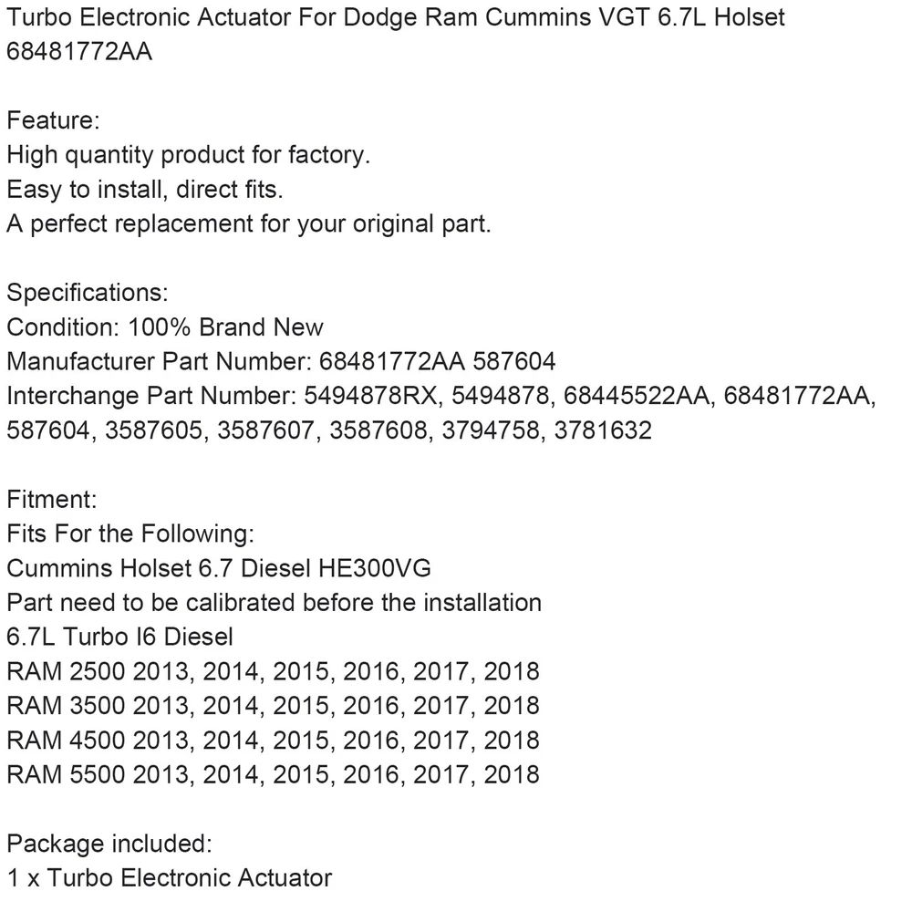 You may also like Boost Solenoid Valve for Ford Focus ST225 N75 RS MK2 Mondeo S-MAX 6M5G-9K378-AA 16.01 USD 16.85 USD Free shipping 5% off Turbo Actuator For Mercedes C-Class W203 W204 S203 S204 G-219 6NW008412-48 93.85 USD Free shipping Turbo Boost Control Solenoid Valve for Vauxhall Insignia 2.0 Diesel 55575611 27.85 USD Free shipping 3.5" Black High Flow Turbo Intake Elbow For GM 6.6L LML Duramax Diesel 11-16 109.85 USD Free shipping Electronic Turbocharger Actuator for Jaguar / Land Rover 2.2D 49477-01214 100.85 USD Free shipping Intake Charge Pipe for BMW M2 M235i 335i 435i N55 F20 F30 RWD 2012-2016 69.85 USD Free shipping Turbocharger Wastegate Actuator 06K145613B Fit For VW Passat B7 1.8 2014-2017 99.85 USD Free shipping Engine Breather Turbo Intake Seal Kit 6420940180 + 6420940580 for Mercedes OM642 13.85 USD Free shipping Turbo Boost Pressure Control Valve for BMW 1 3 5 6 7 X3 X5 X6 11747796338 26.85 USD Free shipping Low Pressure Turbocharger fit Mercedes-Benz W176 W246 C117 X117 X156 A2700902280 35.85 USD Free shipping Turbo Turbocharger For Fiat Viaggio Bravo Ottimo 1.4 T-Jet 55235154 807072 199.85 USD Free shipping Turbo Diverter Solenoid Valve 11658636606 for BMW Mini R55 R56 R57 R58 R59 R60 33.85 USD Free shipping Turbo Electronic Actuator For Dodge Ram Cummins VGT 6.7L Holset 68481772AA Feature: High quantity product for factory. Easy to install, direct fits. A perfect replacement for your original part. Specifications: Condition: 100% Brand New Manufacturer Part Number: 68481772AA 587604 Interchange Part Number: 5494878RX, 5494878, 68445522AA, 68481772AA, 587604, 3587605, 3587607, 3587608, 3794758, 3781632 Fitment: Fits For the Following: Cummins Holset 6.7 Diesel HE300VG Part need to be calibrated before the installation 6.7L Turbo I6 Diesel RAM 2500 2013, 2014, 2015, 2016, 2017, 2018 RAM 3500 2013, 2014, 2015, 2016, 2017, 2018 RAM 4500 2013, 2014, 2015, 2016, 2017, 2018 RAM 5500 2013, 2014, 2015, 2016, 2017, 2018 Package included: 1 x Turbo Electronic Actuator -About US Founded in 2012, VIPJQ have professional development and sales, and are involved in various products, providing customers with various high-quality products. Since its establishment, VIPJQ has always adhered to the service concept of "customer first" and the management concept of "pursuit of quality", and is committed to providing customers with high-quality original designs. We commit to provide you the best innovative, quality products & professional services with competitive prices. We value every customer, and we look forward to providing solutions for your business needs to help your business achieve its goals, please contact us immediately! We are all about you! We are a Japanese seller,but with large warehouse in USA. We are profesional on Auto Parts,Car Parts,Motorcycle Parts,3C,other hot sale items and so on. We aim to provide to customers high quality product and best service. -About Shipment&Returns The item usually will be dispatched within 3 days after you ordered.All are free shipping. And it usually takes 3-5 working days to delivery depends on buyers' address or other majeure on the way. If you are not satisfied with the items and want to return the item,we hope you could message us first,we will give you the return details, we think we could give you the best service to save your time and money.Thank you. -About Feedback&Customer Service If you are enjoy your shopping here,not only enjoy the items but also the service,we are appreciate you could give us a 5-star feedback. If you are not satisfied with the item,before you give us the negative feedback,we hope we could give you the best solution through our commutication. We think we could do it if you give us the chance.Thank you.
