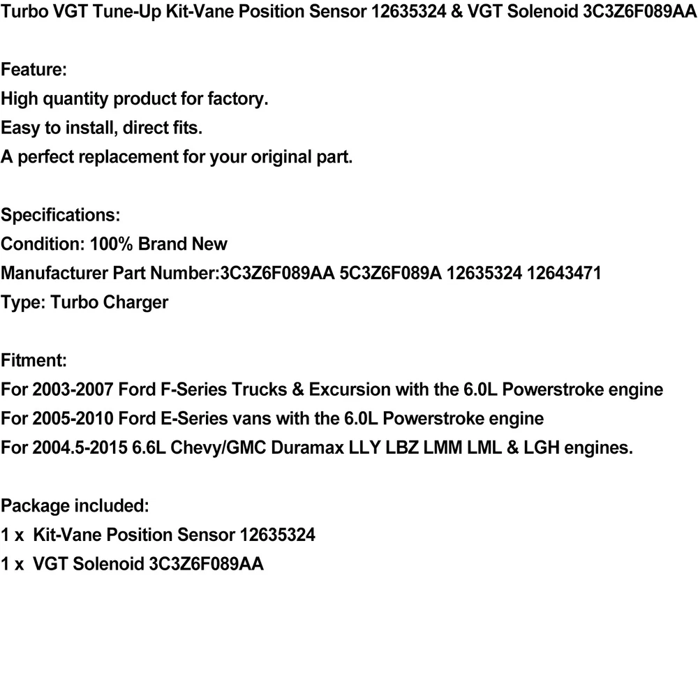 SAFE & SECURE SHOPPING 100% SATISFACTION GUARANTEED FAST SHIPPING Store Categories Store Categories Other eBay Motors Grille You may also like Common Rail Fuel Pump Pressure for Citroen for Peugeot 2.0 HDi 0281002493 U4 54.65 USD Free shipping A/C Climate Control Module Panel 599-216 for Nissan Versa 1.6L 1.8L 27510EL00A 86.65 USD Free shipping Rear Third Stop Light 1Q0945097B For Volkswagen EOS 2006-2016 65.22 USD 68.65 USD Free shipping 5% off Pair Front Bumper Fog Light Grill Grille Fit BMW X5 E70 2007-2010 SG U4 73.65 USD Free shipping Vacuum Pump DS7G2A451CB For FORD C-MAX S-MAX ESCAPE KUGA MONDEO EcoBoost 1.5L U4 102.59 USD 107.99 USD Free shipping 5% off Liftgate Latch Lock Actuator 68070071AD For Fiat 500 Abarth Hatchback 2012-19 U4 55.64 USD Free shipping Turbo VGT Tune-Up Kit-Vane Position Sensor 12635324 & VGT Solenoid 3C3Z6F089AA# Product Description Turbo VGT Tune-Up Kit-Vane Position Sensor 12635324 & VGT Solenoid 3C3Z6F089AA Feature: High quantity product for factory. Easy to install, direct fits. A perfect replacement for your original part. Specifications: Condition: 100% Brand New Manufacturer Part Number:3C3Z6F089AA 5C3Z6F089A 12635324 12643471 Type: Turbo Charger Fitment: For 2003-2007 Ford F-Series Trucks & Excursion with the 6.0L Powerstroke engine For 2005-2010 Ford E-Series vans with the 6.0L Powerstroke engine For 2004.5-2015 6.6L Chevy/GMC Duramax LLY LBZ LMM LML & LGH engines. Package included: 1 x Kit-Vane Position Sensor 12635324 1 x VGT Solenoid 3C3Z6F089AA About Us Shipping Terms Contact Us About Us Bruce & Shark is a company Focus on Motorcycle parts more than 11 years. The design inspiration comes from the awe of the vast sea and worship of the fighting sharks, therefore Bruce & Shark takes a shark as brand logo. Since its inception, we have always put the "customer first" and "top quality" as our principle. We specialized in selling Motorcycle parts and providing customers with various types of high-quality products. Our brand Bruce & Shark has enjoyed good reputation in America, Europe, Japan, Canada and Africa, covering more than 30 countries. Our vision is to deliver high-quality Motorcycle parts products and sincere services to the world. Our main products are motorcycle mounted, fuel pump, stator, windshield, Seat Cover, motorcycle fairing. Welcome to our shop to choose products that are worth more for your Motorcycle! Please Add me to your list of favorite sellers and visit often. Thank you for your business. Shipping Shipping Terms International Buyers – Please Note: 1. Import duties, taxes and charges are not included in the item price or shipping charges. These charges are the buyer’s responsibility. 2. Please check with your country’s customs office to determine what these additional costs will be prior to bidding/buying. 3.Buyers' Information: We strive our best to provide you the most reliable, affordable way of shipping service. But sometimes international delivery is highly depended on the courier company and local customs/duties. If you do not receive your item on time, please sent us ebay message immediately for further assistance. Thank you for your understanding. Terms We stand behind everything that we sell and will do everything possible to assure you are satisfied. When you receive your purchase if you are not 100% satisfied, please sent me ebay message and we will do our best to make you happy. If you still want to return your purchase, simply ship the item(s) back to us and we will refund your original purchase price and the original shipping charge. Buyers are responsible for the postal cost of returning the items. We must be notified of the intent to return your item within 30 days of receiving the item. Items returned must be in the same condition that they were received. How to return 1,Please ask us for return address . 2,Shipping back the package . The RMA#(Return Merchant Authorization Number = Your ebay ID) must be clearly written on the return package ,Otherwise the package will be refused. 3,Sent us the return tracking number. 4,All returns will be inspected prior to a credit being issued. Contact Us Sent ebay message in English If you have any questions, our Customer Service staffs welcome you to sent me ebay message. We strive to answer all questions and resolve any problems as quickly as possible. Business Hours: HongKong Time GMT+8:00 Monday-Saturday 9:00-17:00 Copyright © Bruce&Shark All rights reserved