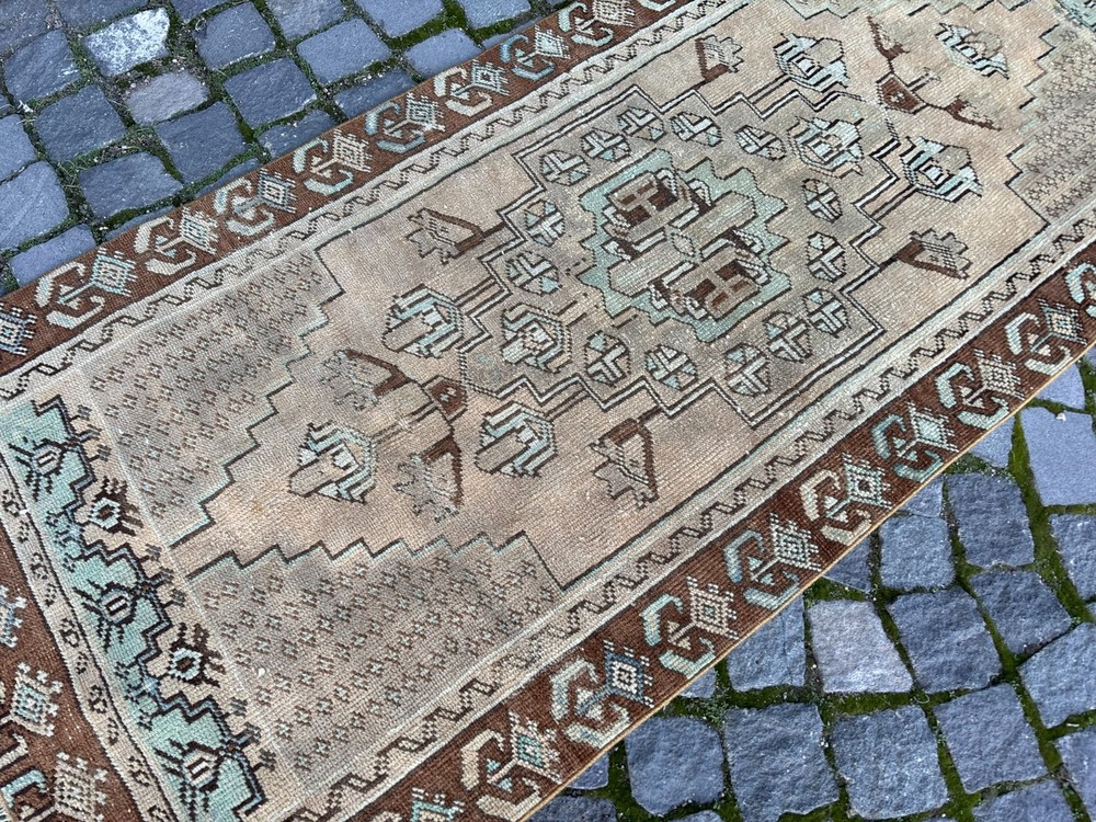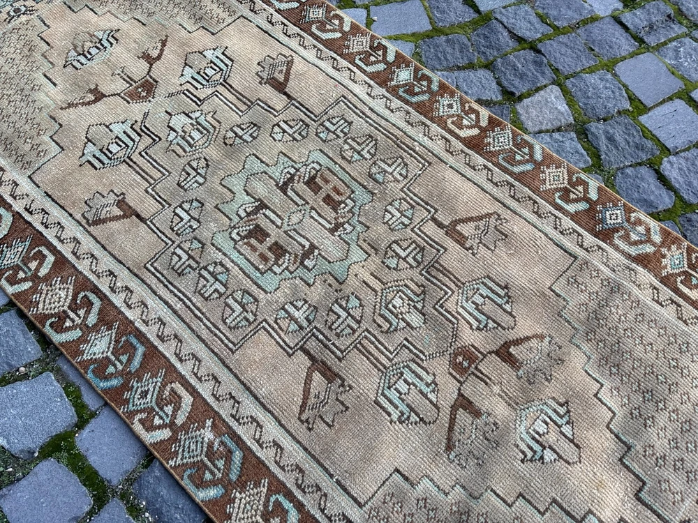 An old (approximately 45-60 years old) hand knotted / hand woven Turkish rug from the Middle Anatolian Region and made of genuine, high quality wool, in natural colors. Our distinguished Antiques and Vintage rugs, each with its own unique story, have been carefully selected from every corner of Turkey. RUG DETAILS * One-of-a-kind vintage rug * Dimensions: 2,7 x 6,2 ft = 33 x 75 inc = 85 x 191 cm * Low pile: approximately 0.2"(0.5 cm) * Dyed with natural dyes * Product code : AA 1499 SHIPPING * Free shipping on all items. * Usually shipped via FedEx or UPS. * Item will be ready for shipment within * Estimated delivery 3-5 business days 1-3 business days with a tracking number. All of our rugs have been professionally cleaned and ready to ship before being listed. These unique vintage rugs have normal wear related to their age. We believe this adds to the authenticity of these hand-woven beauties. We inspect all rugs carefully before Shipping, but in the unlikely event that due to our fault, the goods are not fit for purpose, damaged/defective, or we ship the wrong item, we will issue a 100% refund. We are a team of experienced professionals who are dedicated to ensuring your items arrive safely. Please note that our photos accurately represent the colors of the rug, however it may look different in the light in your home or against different colored floors. We are so excited to share the beauty and art of rugs with you and to see how your personal spaces transform! I do my best to build a great experience in online rug shopping for you, just look at the reviews. Please feel free to write me over conversation if you have any questions about the rug or price. I will be happy to answer to you. Thank you, Yusuf.
