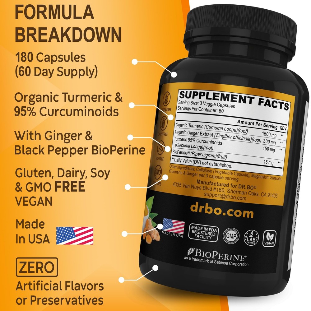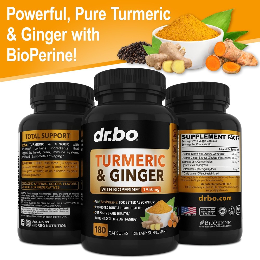 Diet Type: Gluten Free, Vegan, Vegetarian, Plant Based, Keto EAN: 0815444013765 Allergen Information: Gluten Free, Dairy Free, Soy Free, Non Gmo Brand: Dr. Bo ISBN: 0815444013765 UPC: 815444013765 Unit Count: 180.0 Container Type: Bottle Flavor: Unflavored Recommended Uses For Product: Brain Health, Immune Support, Digestive Health Age Range Description: Adult Weight: 0.43 Pounds Special Ingredients: Turmeric, Ginger, Black Pepper, Organic, Natural, Gluten Free Product Expiration Type: Expiration On Package Item Form: Capsule Target Gender: Unisex gtin13: 0815444013765 Type: Does not apply Size: 180 Count (Pack Of 1) Fc Shelf Life: 540.0 Dosage Form: Capsule Indications: Brain Health, Immune Support, Digestive Health Package Dimensions LxWxH: 5.28x2.87x2.83 Inches Item Package Quantity: 180
