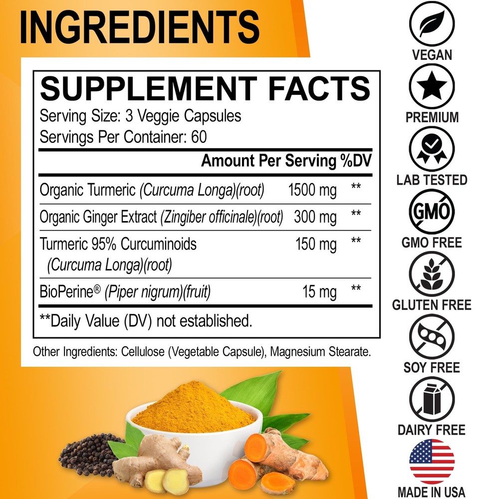 Want knee health & dynamic immune vitamins nutrition knees support plus flexibility & knee support nutrition & organic turmeric supplements? Try ultra pure turmeric with bioperine support complex for adults & kids. Organic herbal curcuma capsules formula made from nature with no gmo, pure tumeric and ginger herb for golden turmeric root key wellness. Extra strength turmeric and ginger supplement for advanced knee support. Premium T3 organic turmeric supplement ginger complex 1950mg with 95% standardized curcuminoids & 15mg BioPerine black pepper & max absorption. Turmeric BioPerine ginger for max absorption. BioPerine a patented black pepper helps up to 2000x better absorption than pure turmeric capsules. Ginger Tumeric and Curcumin for knee health. Add turmeric and ginger supplement with black pepper BioPerine rather than just tumeric and curcumin supplements alone for extra strength knee health support. Organic knee support for men women adults & kids. Turmeric Curcumin with black pepper is a organic knee turmeric ginger supplements super antioxidant. Support with turmeric powder with curcuma longa. Men & women turmeric and ginger supplement. Organic turmeric capsules for the best quality ginger turmeric supplement. 1950mg per 2 capsule serving organic turmeric curcumin with BioPerine supplement ginger capsules. Vegetarian Tumeric and Ginger supplements with BioPerine black pepper extract ginger turmeric supplement for extra strength knee support. High potency turmeric curcumin with bioperine and ginger root capsules. Vegan Organic Tumeric and Curcumin supplements use the best quality tumeric and ginger supplement. High grade turmeric pills the most potent turmeric curcumin with black pepper bioperine. 60 120 180 240 500 mg 500mg 750mg 900 1000 1000mg 1500mg 2000mg 2600 2600mg piperine organica circumin tuneric suplement cumin tumetic tablets caps cucumin turmic tumric supreme tumerick Extra Strength Turmeric and Ginger Supplement: Premium T3 organic turmeric supplement ginger complex 1950mg with 95% standardized curcuminoids & 15mg BioPerine black pepper & max absorption BioPerine & Ginger for Max Absorption: BioPerine, a patented black pepper, helps up to 2000x better absorption than just pure turmeric capsules; ginger tumeric and curcumin for knee health Knee Support: Turmeric Curcumin with black pepper is an organic knee supplements super antioxidant; turmeric powder with curcuma longa; men & women turmeric and ginger supplement Organic Turmeric Capsules: 1950mg Organic Turmeric Curcumin with BioPerine supplement ginger capsules; tumeric and ginger supplements with BioPerine black pepper ginger turmeric supplement High Potency: Vegan Organic Tumeric and Curcumin supplements use the best quality tumeric and ginger; high grade turmeric pills, the most potent turmeric curcumin with black pepper bioperine