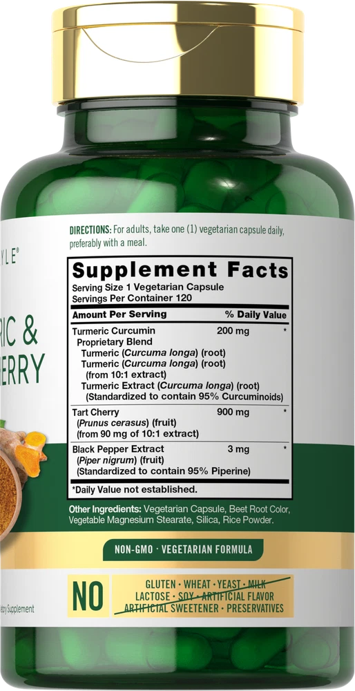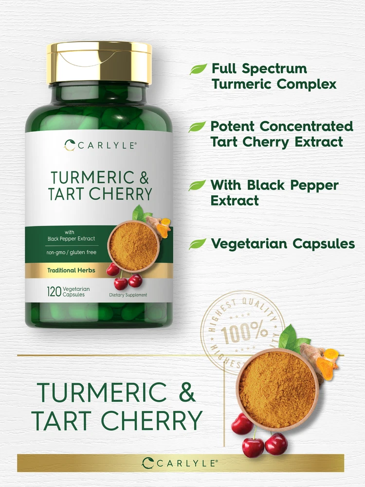 Powerful Traditional Herbs: Known for its iconic gold appearance, Turmeric is a traditional Ayurvedic herb with powerful curcuminoid compounds derived from its roots. Tart cherry is also packed with nutrients, containing naturally occurring vitamins, minerals, and antioxidants. Together these traditional herbs provide superior antioxidant support for your nutrition plan. Carlyle Turmeric & Tart Cherry: Get a double dose of nutrition with Carlyle Turmeric & Tart Cherry! This premium herbal supplement features a 200 mg Turmeric Curcumin Blend, plus Tart Cherry and Black Pepper Extract, all in one vegetarian capsule. We test our herbs for purity and potency, providing a gluten-free and non-GMO formula that works well with any daily routine. Rooted in Wellness: Our expertise in sourcing the purest ingredients combined with advanced technologies makes us proud to deliver premium, honest supplements at the best value. Carlyle Turmeric and Tart Cherry is a testament to our commitment to excellence, made with powerful ingredients rooted in wellness. Thanks for choosing us in your pursuit of living healthy.