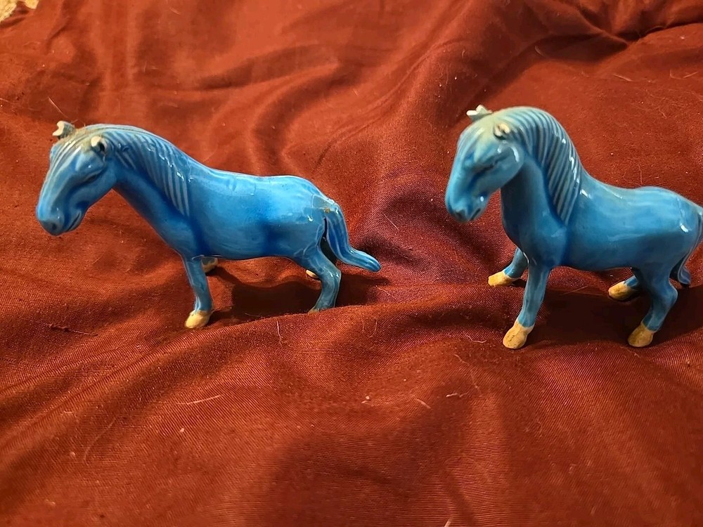 The product is a set of two Chinese miniature porcelain horse figures in a striking turquoise blue color. These figures feature a motif of horses and are likely crafted in China, showcasing Chinese culture and artistry. The intricate details and craftsmanship of these figurines make them a unique addition to any collection of Asian antiques or figurines and statues. Unfortunately, both horses have chipped ears so I am pricing accordingly.