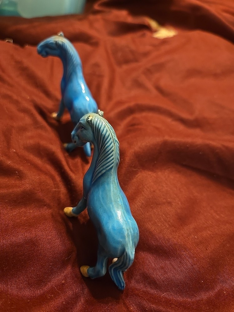These stunning turquoise blue porcelain horses are a beautiful display of Chinese craftsmanship! The intricate details and vibrant color make them stand out, perfect for collectors or as elegant decor. Though they have minor chips on the ears, their charm and artistry still shine—great value for such unique pieces.