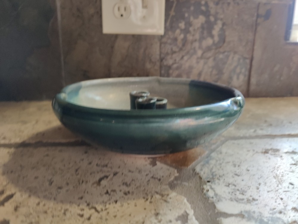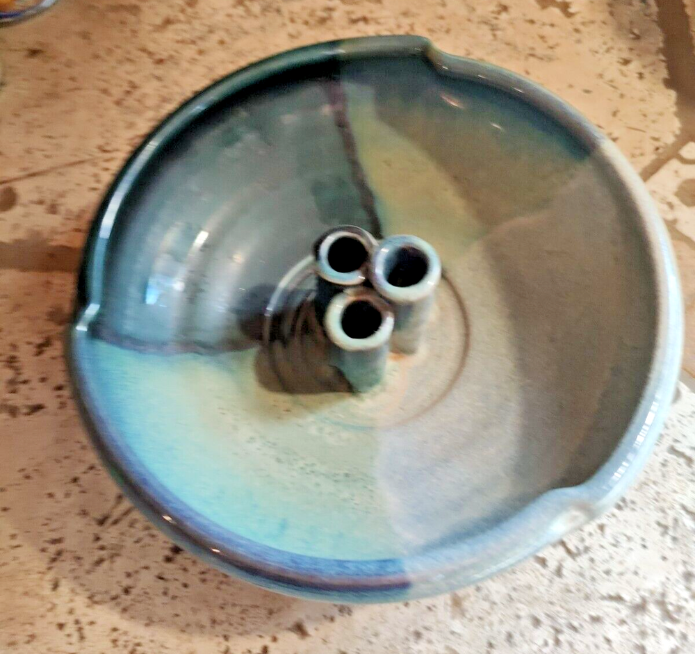 Turquoise Blue Pottery Flower Frog Bowl 8” Wide Artist Mark on the Bottom