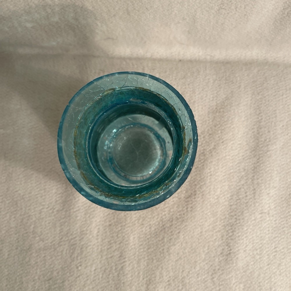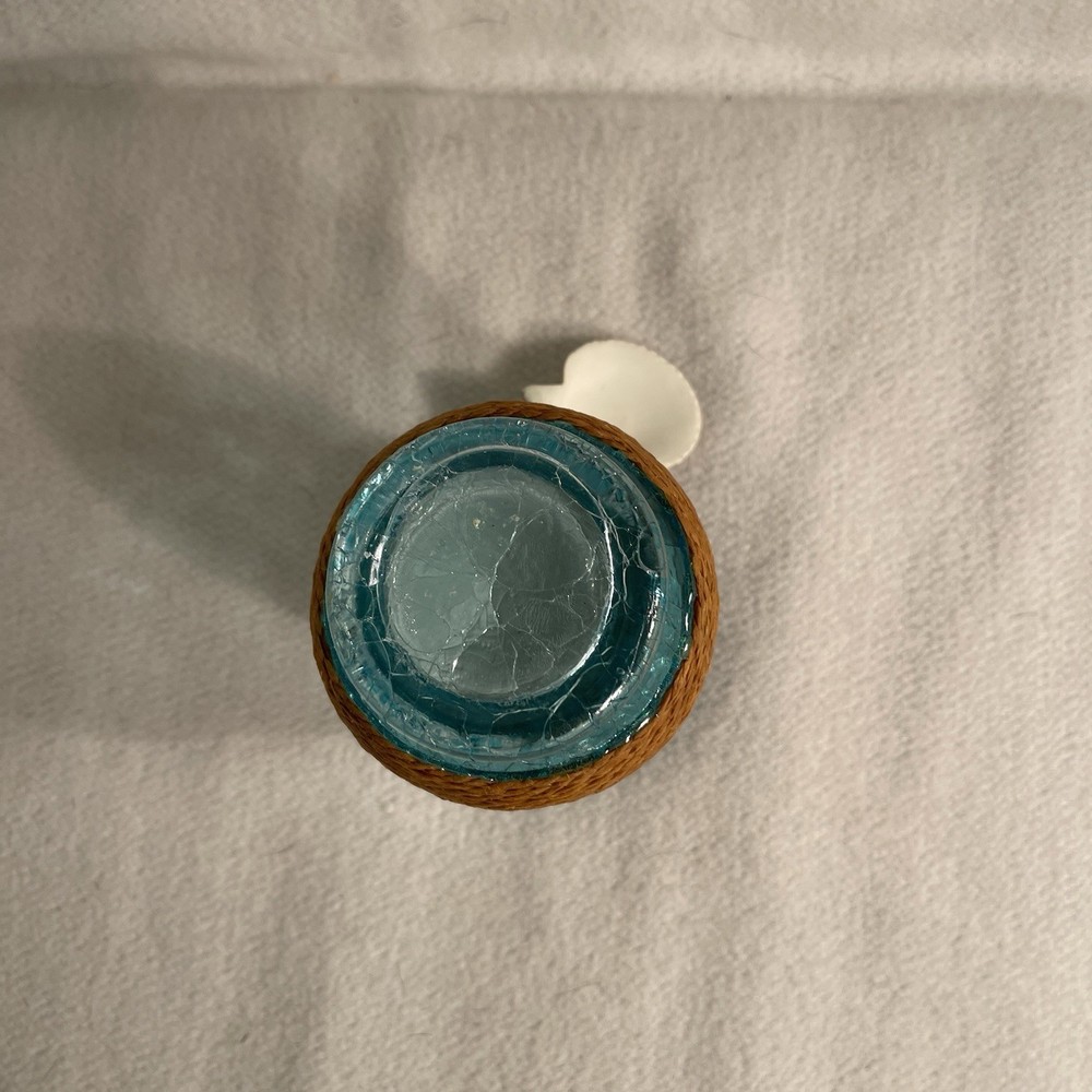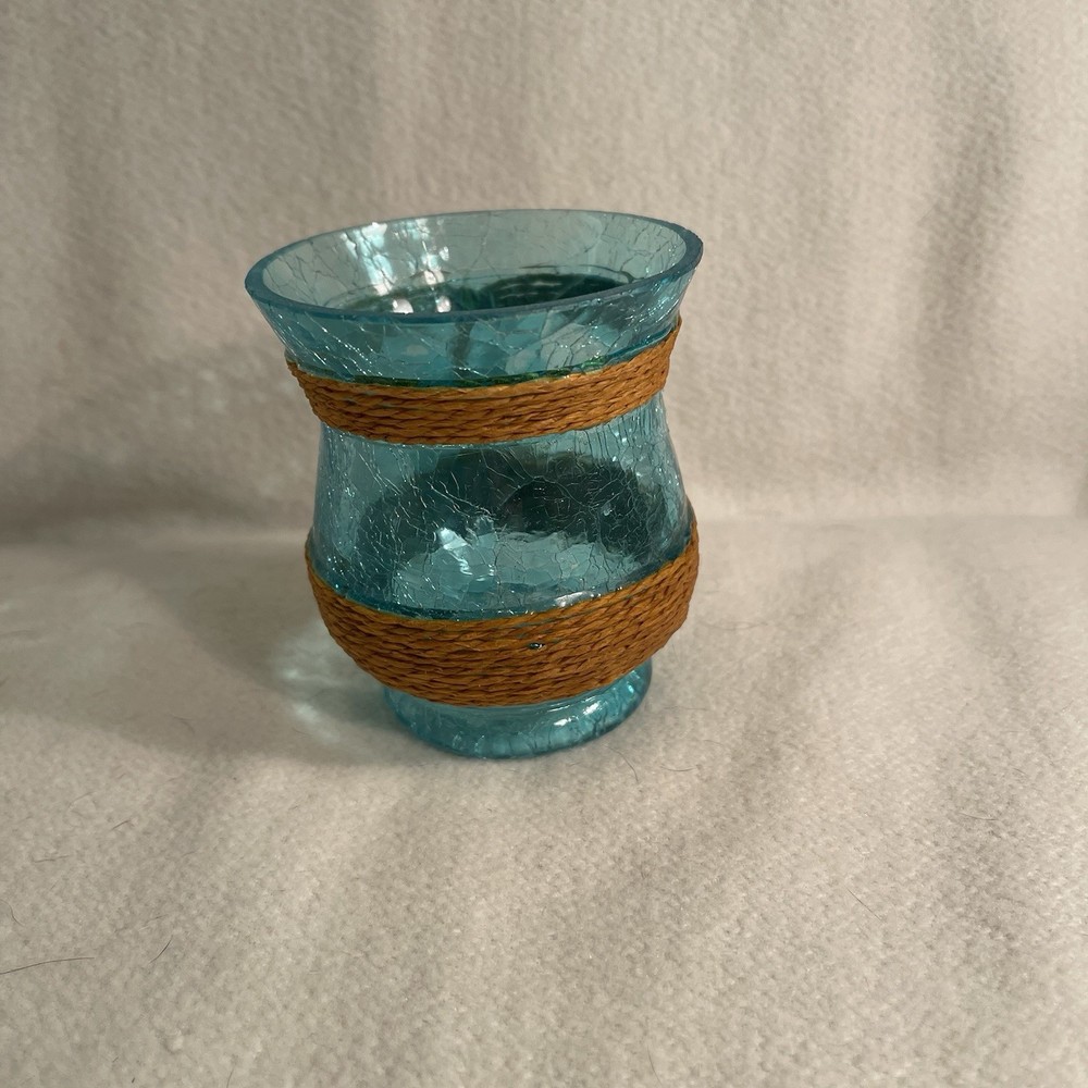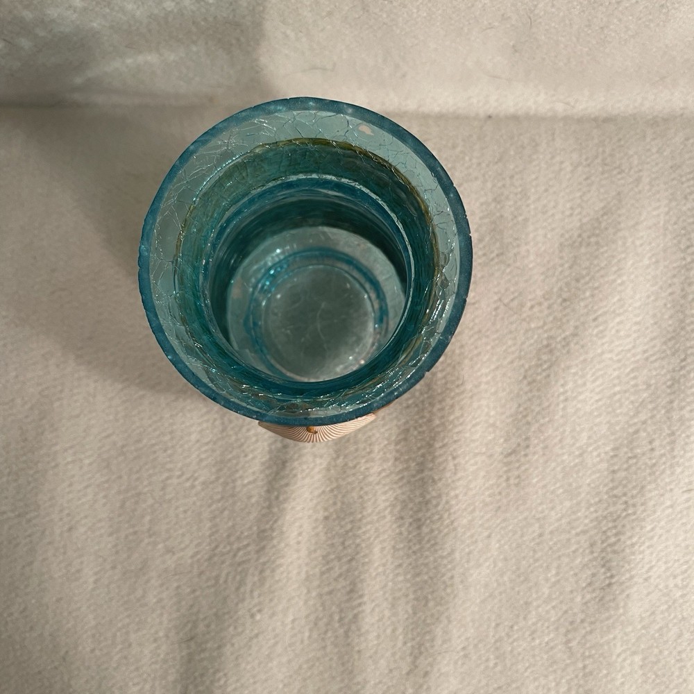 Add a touch of the ocean to your home decor with this beautiful Turquoise Crackle Glass Votive Holder. The all-over blue color and seashell pattern make it perfect for any nautical-themed room. The holder is suitable for mini candles and features a rope accent for added texture. This original candle holder is made of glass and weighs 8.7 oz. It has a crackle finish and measures 3.5 inches in height and 3 inches in width. The holder is a great addition to any collection of decorative collectibles and is sure to be a conversation starter. Excellent condition. No chips or cracks.