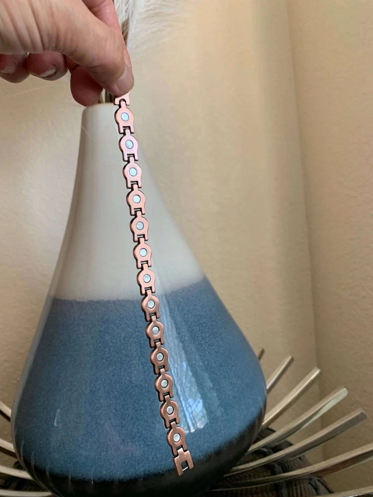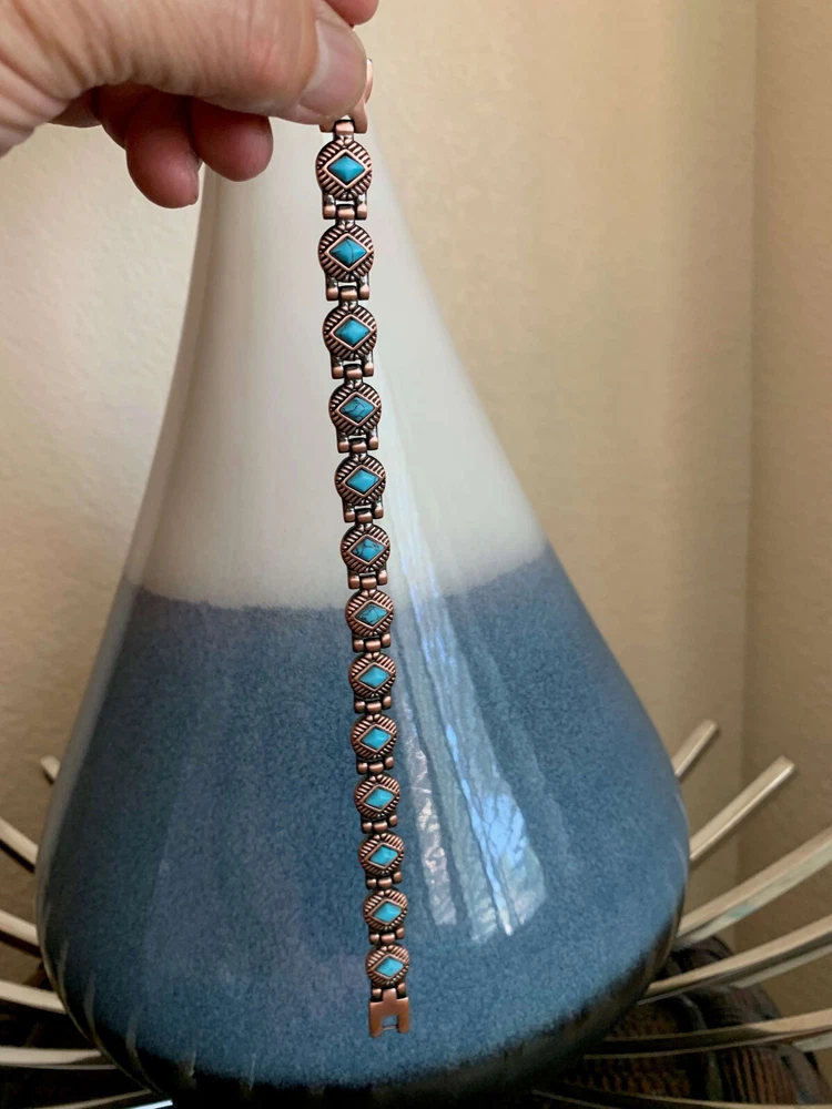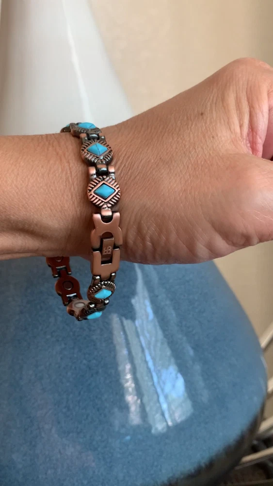 KEY TO GOOD HEALTH IS GOOD CIRCULATION...It works like Acupuncture without the needles! Rare Turquoise & Magnets & Copper for Healthy New Year's Gift for yourself and your loved ones... * BEST LOOKING, highest quality, Stylish Modern European Design and Precision Hand-Crafted Bracelets. Just wear it, it looks great and its therapeutic, what more could you ask for? Treat yourself and your loved ones. * Relieves Aches and Pain, Helps Arthritis pain, Improves Circulation, Reduces Inflammation, Boosts Immunity, Improves Balance, Stress & Anxiety relief (Makes you feel better) * 14 magnets and bio elements with 5,000 Gauss power! Pure 100% Copper bangle bracelet with strongest Neodymium magnets. (70,000 Gauss Total) * KEY BENEFITS- Our bracelets may help increase balance, strength, flexibility, and energy as well as increase blood circulation to help relieve aches and pain. It may help healing process and induces sense of well-being. It's perfect for people with active life style like runners, playing golf or sports. Great gift for yourself and your loved ones. Perfect Gift for everyone! Try it, love it or 60 days money back