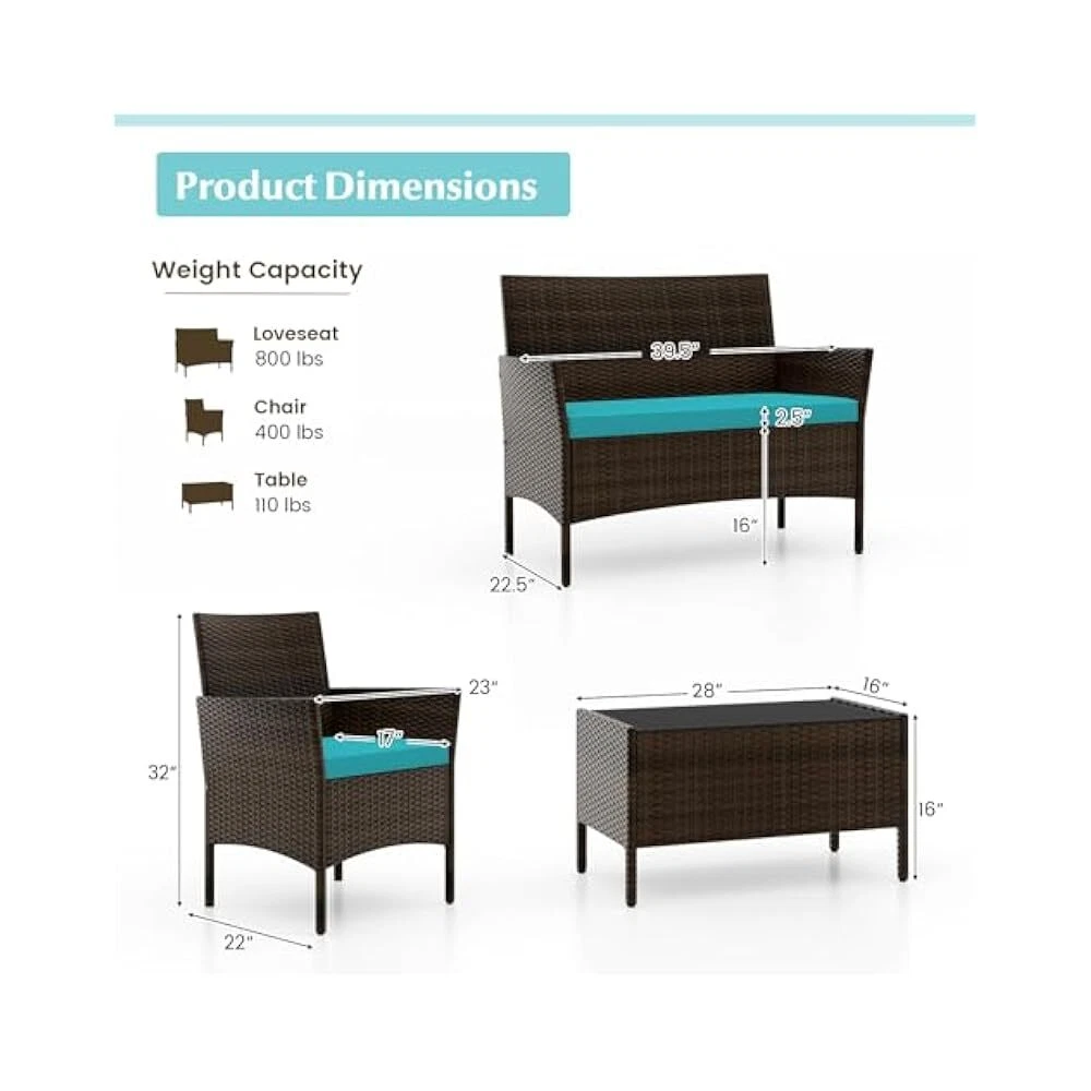 STORE NEW ARRIVALS ADD TO FAVORITE VIEW FEEDBACK Stylish Turquoise Patio Set, Rattan Loveseat, Chairs & Glass Coffee Table Description 4-Piece Patio Furniture Set – Create Lasting Family Memories Outdoors! This 4-piece patio furniture set provides a comfortable and stylish outdoor space for your family to relax and connect. Featuring a loveseat, wicker chairs, and a tempered glass coffee table, this set is perfect for backyards, porches, or any outdoor area. Crafted with durable rattan, this set offers long-lasting enjoyment for years to come. As a father and son caregiver, I understand the value of quality time, and this set provides the perfect setting for those precious moments. Enjoy conversations, family meals, or simply unwind in the fresh air. This set is designed for easy maintenance, allowing you to spend more time enjoying your outdoor space and less time on upkeep. It’s a value-for-money investment that will enhance your outdoor living experience and become a cherished part of your family’s routine. Create a welcoming atmosphere for family and friends with this beautiful and functional patio set. This set offers a reliable and comfortable outdoor experience for your family and guests. Enjoy the sunshine and create lasting memories with this durable and stylish furniture set. Product Features Comfortable and stylish outdoor space Includes a loveseat, wicker chairs, and a tempered glass coffee table Crafted with durable rattan Easy maintenance Value-for-money investment Creates a welcoming atmosphere Reliable and comfortable outdoor experience Technical Specifications Set Pieces 4 Components Loveseat, Wicker Chairs, Coffee Table Material Rattan, Tempered Glass ABOUT US We offer the best prices around on high quality products. Our E-store includes media such as books, movies, music and games while offering electronics, toys, sporting apparel, clothing, tools, general home, garden items and more. SHIPPING We are always working hard to ensure your package arrives as soon as possible. Please understand that some factors like weather, high postal traffic, and the performance of shipping companies are outside of our control. For shipping outside of the continental USA, we only use eBay's Global Shipping Program.The item is shipped to KY and then sent to the rest of the world. International customers are responsible for all duties and taxes. Continue to check out in order to calculate costs for shipping the item to your country. Messages regarding eBay's Global Shipping Program MUST be directed at eBay EXCLUSIVELY. RETURNS We offer a 30-Day Return Policy on items which you are not completely satisfied with. You have the option for a full-refund or an exchange of the item. No returns are available on items shipped outside of the USA. CUSTOMER SATISFACTION We try our very best to make sure every customer is completely satisfied. If there's a problem, message us! We're happy to help. WE ACCEPT Copyright © 2021 AutoDS. | All Rights Reserved