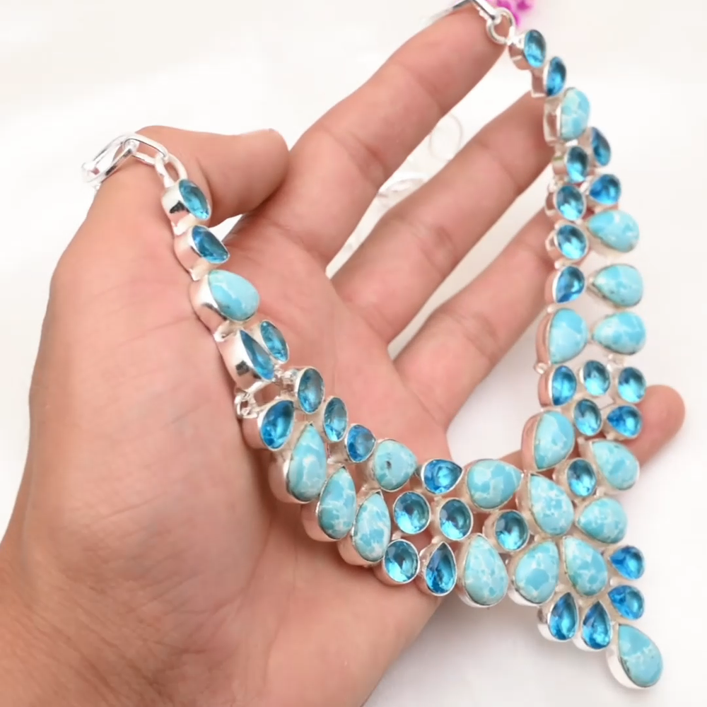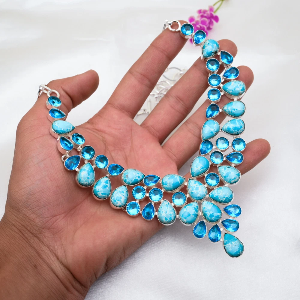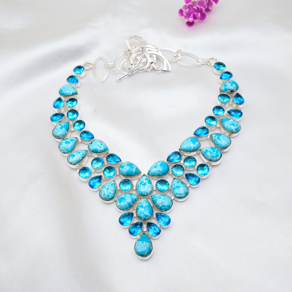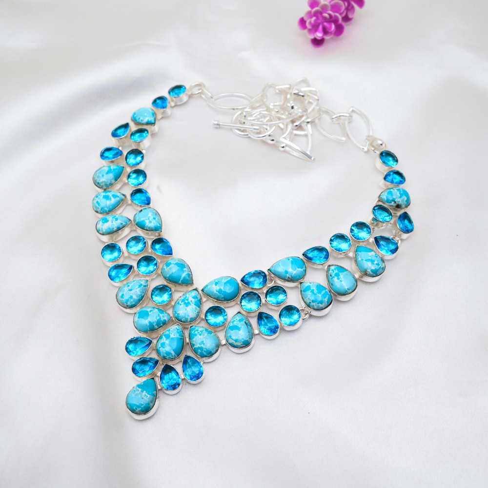 HomeTurquoise and Blue Topaz Gemstone Necklace in Handmade 925 Sterling Silver Jewelry Gift