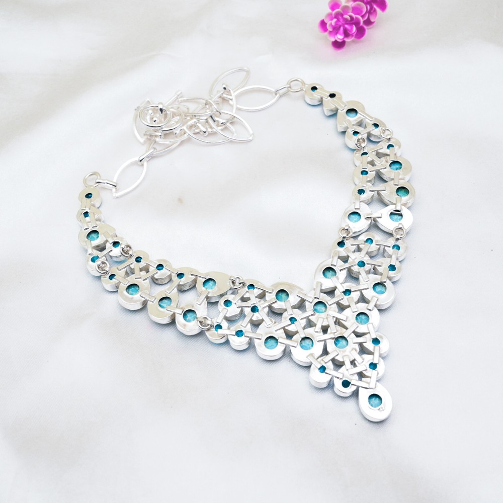 Number of Diamonds:N/ACountry of Origin:IndiaDiamond Clarity Grade:N/ADiamond Color Grade:N/AColor:SilverNumber of Gemstones:51Country/Region of Manufacture:IndiaTheme:Beauty, Bohemian, Ethnic, Halloween, LoveClosure:Same As PictureTotal Carat Weight:10 carat and aboveMain Stone:TurquoiseMetal Purity:925Necklace Length:18 Inches With Adjustable ChainMain Stone Color:BlueFeatures:HandmadeType:NecklaceMetal:Sterling SilverBase Metal:Sterling SilverBrand:HandamdeCollection:HandmadeMain Stone Shape:PearSetting Style:BezelChain Type:Same As PictureOccasion:Anniversary, Birthday, Christmas, Engagement, Father's Day, Mother's Day, Valentine's Day, WeddingMaterial:Stone, GemstonePendant Shape:Same As PictureSecondary Stone:Blue Topaz, TurquoiseCertification:N/ACut Grade:Very GoodMain Stone Treatment:Not EnhancedColored Diamond Intensity:N/APendant/Locket Type:CharmMain Stone Creation:Lab-CreatedStyle:Necklace