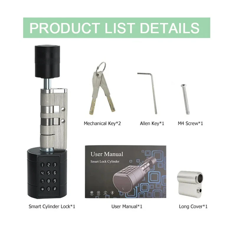Features 1. Multiple methods of unlocking Tuya App,Bluetooth, fingerprint, card, mechanical key unlock; easy to use it whether children or older. Never worry forget to bring the key. 2.APP remote control This keyless entry door lock allows you to check the visitor records on Tuya APP Lock, see which visitor at what time unlocked the door, enhance the security level of your home. When the door lock and gateway are used together, the APP can be used to remotely control the unlocking. 3. With G2 gateway Works with Smart Alexa or Google Home, smart home combined with the Gateway provides the most convenient experience by simply asking your smart speaker Alexa to lock or unlock our lock. For iOS and Android phone, If add a gateway G2 can connect to wifi, and work with Alexa and Google Assistant (Noted: Only USA/Canada/UK/Australia/France/ltaly/Brazil/India can support the Alexa and only the English country support the Google Assistant.) 4. Mechanical keys and emergency power supply (USB) can be used when the door lock is out of power 5. Easy to install and use Only 3 minutes to diy install without breaking the door or changing the door body and no professional installer required; 6. Suitable for most doors Adjustable length cylinder lock, 99% of world doors to compliance; easy replacement of existing lock cylinder. Different door thickness of accessories are not the same,please contact our salesman when placing an order