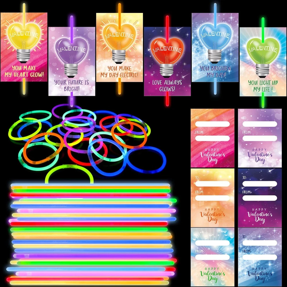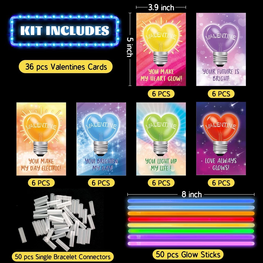 Tuzuaol 36 Pack Valentines Day Gifts for Kids Classroom School Classroom Exchange Valentines Cards with Glow Sticks for Party Favors Product Details Color: White Material: Paper, Plastic Brand: Tuzuaol Unit Count: 36.0 Count Theme: Love Item dimensions L x W x H: 6 x 0.6 x 8 inches Occasion: family Item Weight: 0.39 Kilograms Manufacturer: Tuzuaol UPC: 768788462747 Age Range (Description): Kid Product Dimensions: 6 x 0.6 x 8 inches Item Weight: 13.6 ounces Country of Origin: China Item model number: 85246 Manufacturer recommended age: 5 years and up Super Value Valentines Cards for KidsFun Valentine glow sticks card Set includes 36 cards(6 designs) and 50 glow sticks in 8 colors with 50 single bracelet connectors. DIY a Valentines day card for kids with glow stick and exchange the novel valentines gift for kids is a good way to encourage kids to express love and thankful to families, friends and classmates. Valentines Day Cards for Classroom SchoolOur Valentine's Day cards for kids classroom are beautifully printed on both sides with clear and bright patterns. Valentines cards in 6 designs, each design has a special punchline of greeting. You light up my life", "Love always glows", ect. Kids can sign the name on the cards backside where printed with "To"and "From". With this unique design of the Valentines day cards, the kids will surely be excited to give them or to their friends. Glow in the Dark FunFirst bend the card. Then insert the glow stick. Bend and shake to activate.The glow sticks include 8 colors: red, orange, yellow, green, blue, purple, pink and light blue. You can also use the included connectors to form glow bracelets and necklaces. Light up the night with these fun and vibrant glow in the dark party favors! High Quality & SafetyThe Valentines day cards for kids are made of premium paper, super sturdy. The glow sticks are made of flexible plastic and safe materials, which can ensure up to 6 hours of glowing light. These nontoxic and non leaking glow in the dark party favors are safe and fun for kids. Valentine Party Favors for KidsValentines day cards for kids glow sticks are perfect for Valentine's Day classroom exchange gifts, party favors, Valentine giveaways, goodies/candy bag fillers, Valentine gifts, Valentine party favors supplies!