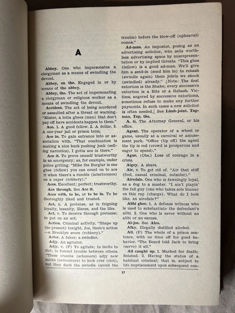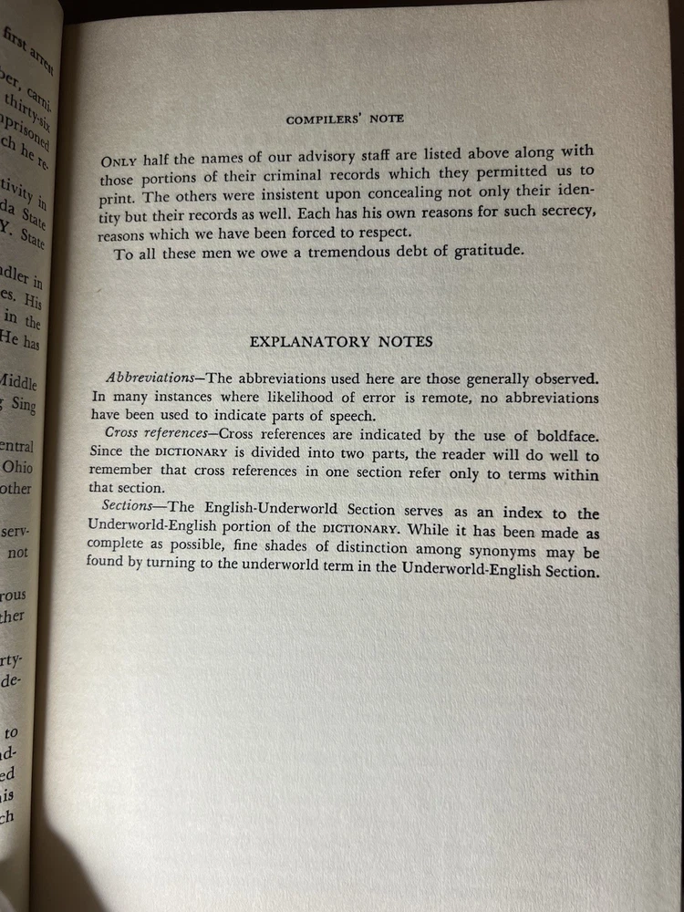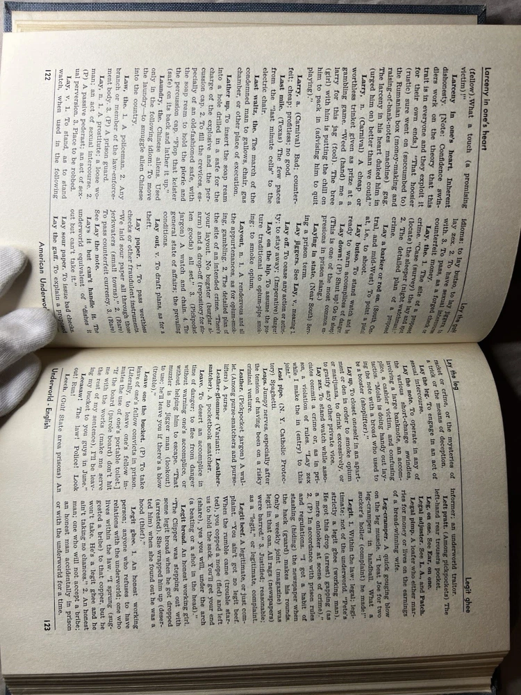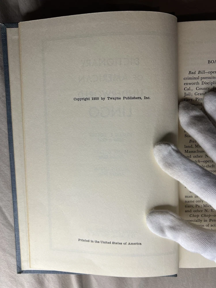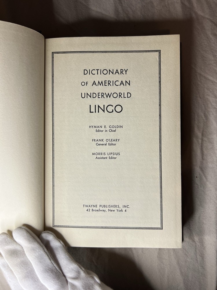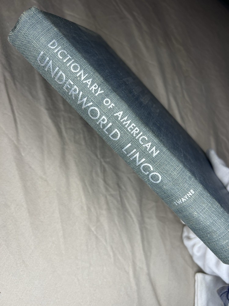 Dictionary of American Underworld Lingo Published by Twayne Publishers, Inc. (1950) A fascinating and highly collectible reference documenting American criminal, prison, and underworld slang as recorded in the mid-20th century. This work is frequently cited in studies of criminology, sociology, linguistics, and American subcultures. 🔍 Details: • Hardcover blue cloth binding • Published 1950 by Twayne Publishers, New York • Printed in the United States • Classic mid-century typography and layout 📖 Condition: • Binding tight and secure • Cloth boards clean with light age wear • Pages clean and legible • Small pencil markings on front endpaper only (see photos) • No highlighting, no missing pages 🎯 Ideal for: Collectors of crime history, linguistics, slang dictionaries, noir-era Americana, or academic reference works. A solid, original example of an increasingly hard-to-find reference title.