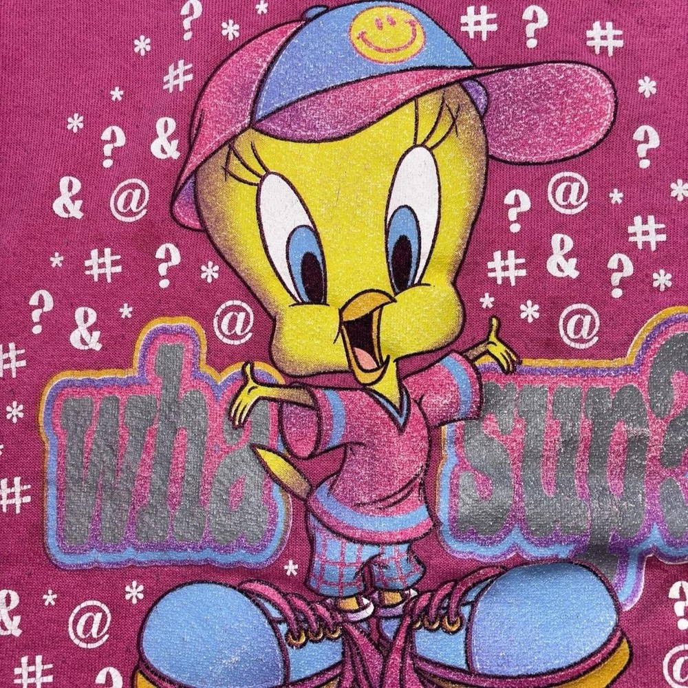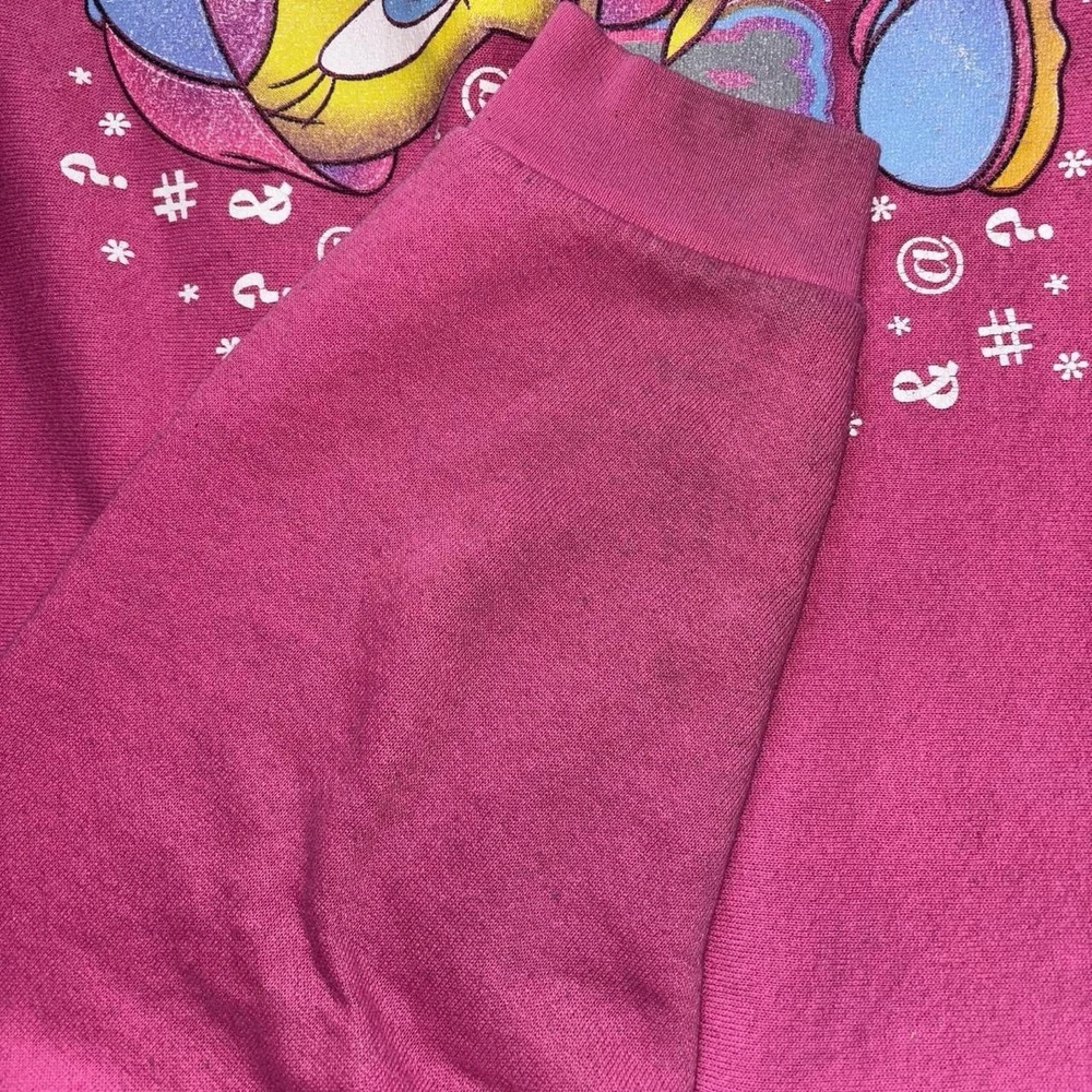 This Tweety Bird Looney Tunes Pink Vintage Sweatshirt is an oversized L or XL (tag has been cut). The vintage design with “Was Up?” graphic adds a touch of nostalgia to the 90s cartoon theme, making it a fun and comfortable addition to any wardrobe. There is some notable staining particularly on the sleeves. There is some pilling throughout as is to be expected for a used 90s item. Please see all pictures for item details and overall condition! From a smoke free and fur free home.