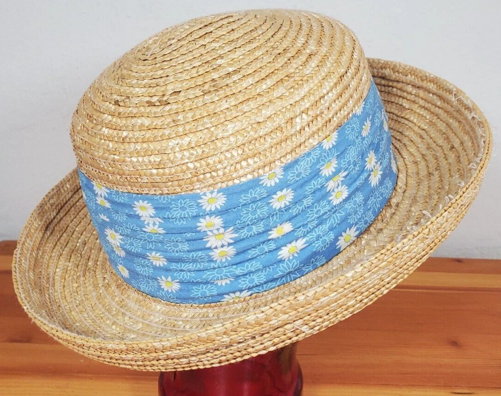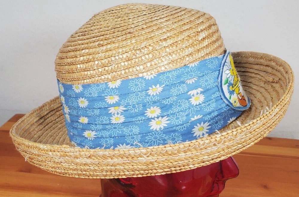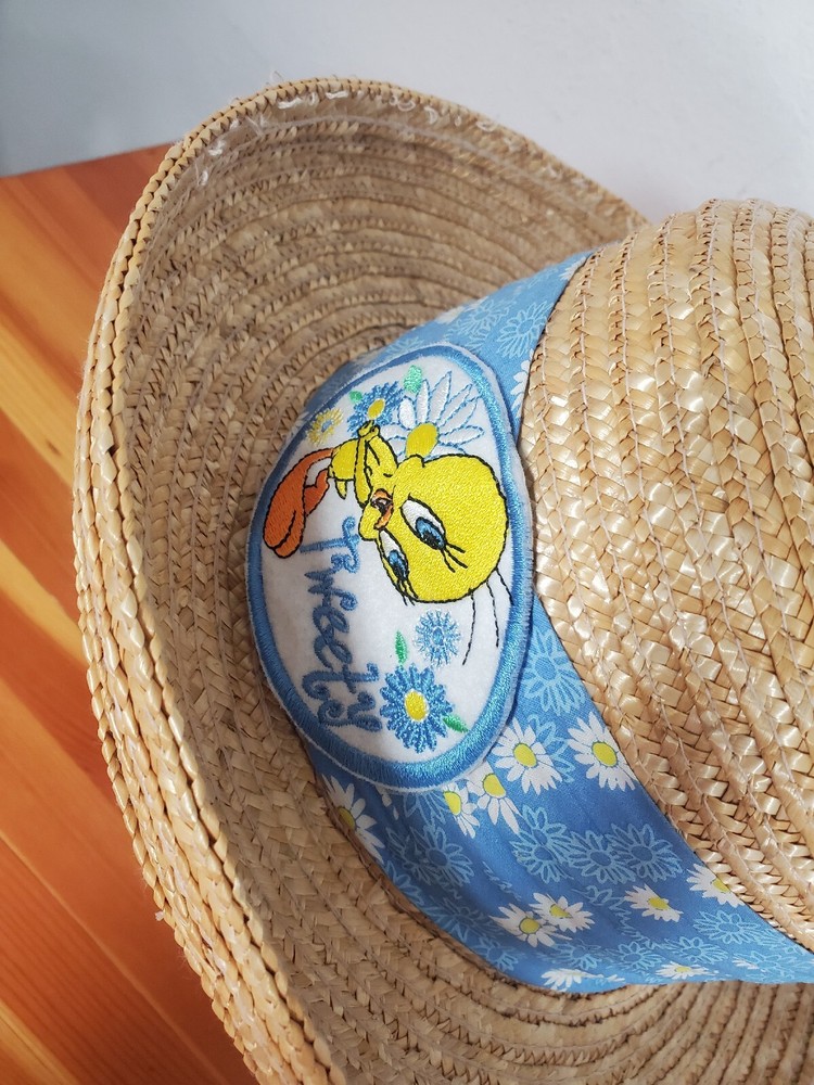 Material: Straw Accents: Tweety Bird patch and blue floral band. Style: Sun Hat Color: Beige Theme: Bird Brand: Looney Tunes Character: Tweety Seller Notes: “See pictures. Varied colors in straw strands can be seen.” Size: 6 7/8 Department: Women