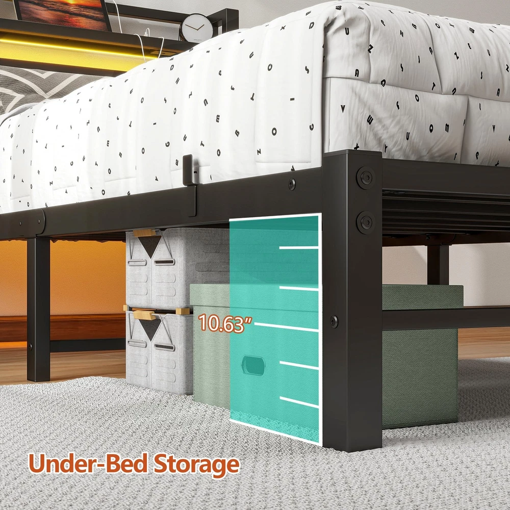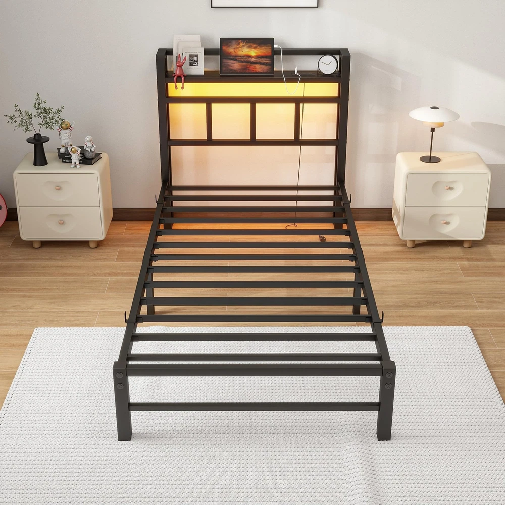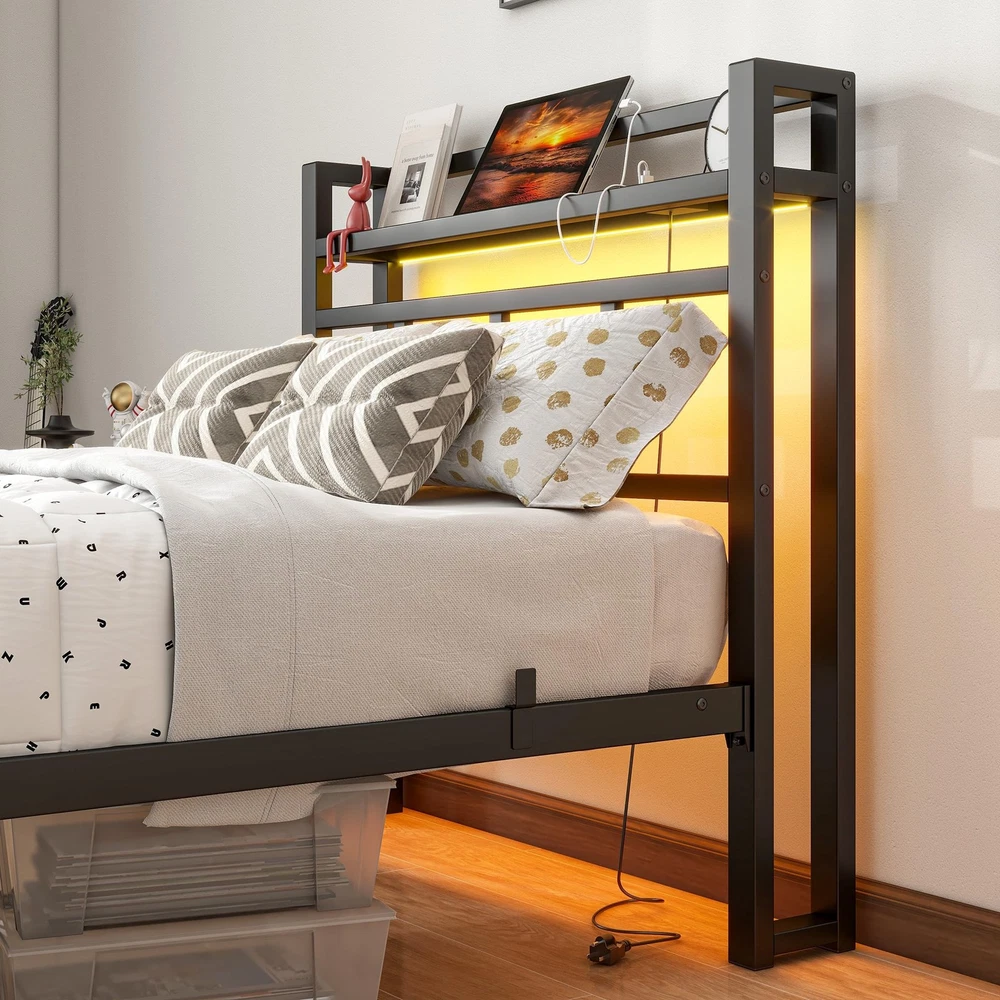 Single Bed Frame with Storage Headboard,Twin Bed Frame with Charging Station and Lights Package contains: 1 x Bed Frame 1 x Charging Station 1 x Lights 1 x Enough Screws 1 x Instruction Manual 【Multi-functional Bed Frame:】The twin lights bed frame supports the headboard RGB lights, from gentle shimmer to party color, steady soft light to constant flashing color light. Multiple bed frame lighting modes create a wonderful ambiance to your liking and make the night colorful! 【Headboard Storage Shelves with Charging Station:】The black twin bed features convenient headboard shelves and charging station,which is easily charge your , , or other gadgets and offering easy access to essentials and extra space to showcase your favorite decor, such as phones, glasses, and books within easy reach. 【Sturdy Metal Slat Platform:】The single bed frame with headboard is made of high-quality metal and multiple legs for stability and durability; offer great mattress . No spring needed. 【Under-Bed Storage: 】Under thoughtfully designed of our metal bed frame,there is a 10.6-inch under-bed storage maximizes space, providing you maximize bedroom space and keep your room neat and tidy for belongings and effortlessly contributing to a neat and organized bedroom. 【Easy to assemble】The twin bed frame with storage comes flat-packed in for easy home assembly.All parts with clearly label,easy to assemble with very clear instructions for installation.the manual for standing towel rack for quick installation. 【Worry 】 Our bed frame come with worry-after-sales with parts. If you have any questions, please feel to ,we will reply to you within 24 hours.