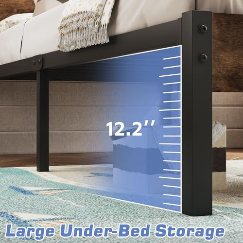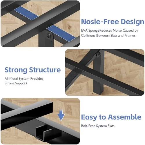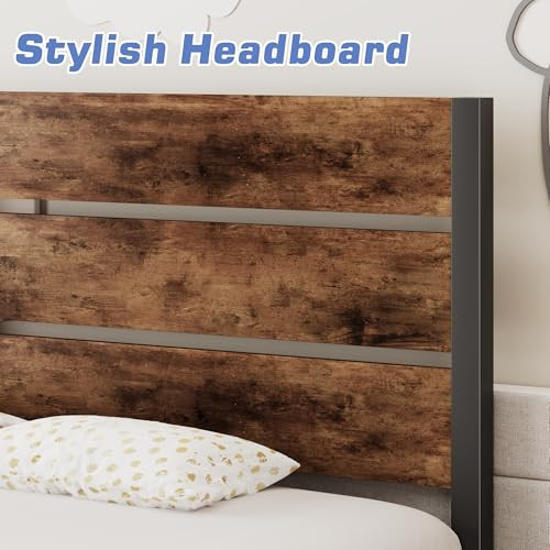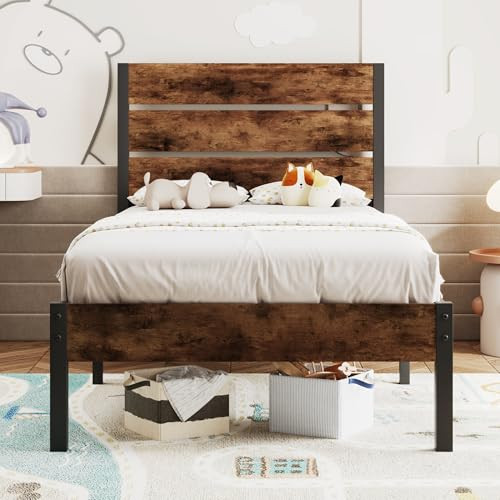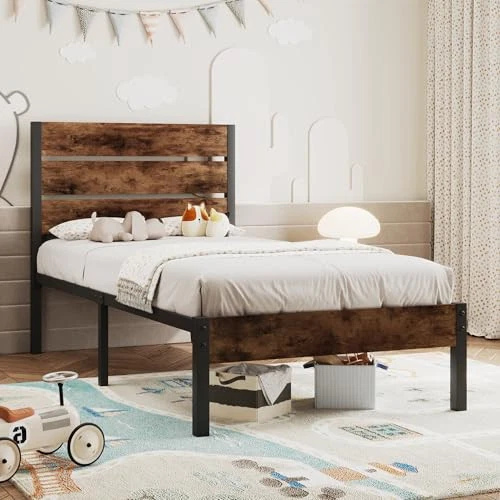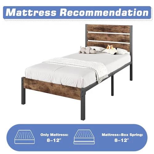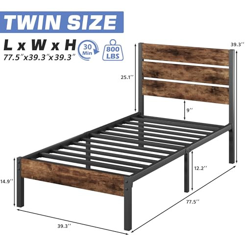 1. This twin bed frame is sturdy, stylish, and super easy to assemble—no tools needed! The rustic brown finish looks great, and the sturdy metal frame stays totally silent, even with movement. Love the extra storage space underneath, and no box spring required. Arrived fast, packed well, and feels super durable. Perfect upgrade for any bedroom!