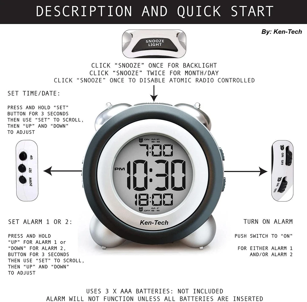 Store New Arrivals Add to Favorite View Feedback Contact Twin Bell Digital Alarm Clock - Very Loud Alarm Clock for Heavy Sleepers and the Hearing Impaired. Battery Operated Dual Alarm Blue Backlight. for Teens and Senior Citizens by Ken-Tech - White (-T-4689) Description Item model number -T-4689 Style Classic Number of Items 1 Power Source Battery Powered Country of Origin China Operation Mode Atomic Theme Vintage Are Batteries Included No Room Type Kitchen Batteries required Yes Product Dimensions 4.5"W x 4.5"H Shape Round Age Range (Description) Kid Alarm Clock Yes Number of Batteries 3 AAA batteries required. Indoor/Outdoor Usage Indoor Item Weight 8.1 ounces Special Feature Snooze, Temperature, Alarm, Radio Display Type Digital Clock Form Twin Bell Mounting Type Tabletop Color White Watch Movement Automatic Batteries 3 AAA batteries required. Size T4689- Twin Bell Loudest Alarm - For deep sleepers, kids, the elderly, and hearing impaired. So loud it is obnoxious! Up to 100db with Flashing Blue Light Easy to Use - big digital display with blue backlight . Check the time during the day and at night Easy to set - Dual Alarms: Setup 2 different Alarms Eg. 1 to wake up and 2 to start your homework ( Press and hold "UP" to set Alarm 1, "DOWN" for Alarm 2 Classic Old Fashioned Vintage Retro and Modern Fashion Design! Great for bedrooms, or your kitchen! Portable Design to travel with! Uses 3 AAA batteries (Not included) Loudest Alarm - For deep sleepers, kids, the elderly, and hearing impaired. So loud it is obnoxious Easy to Use - big digital display with blue backlight . Check the time during the day and at night Easy to set - Dual Alarms: Setup 2 different Alarms Eg. 1 to wake up and 2 to start your homework Classic Old Fashioned Vintage Retro and Modern Fashion Design Great for bedrooms, or your kitchen Portable Design to travel with Uses 3 AAA batteries (Not included) Sets Time Time Zone Automatically Using a Radio Controlled Atomic Signal, this clock will automatically adjust the accurate time and time zone based on your location. (Note: May not always work due to factors our of our control such as building interference, or radio interference) NOTE: When first using the clock will search for a Radio signal, the BUTTONS WILL NOT FUNCTION DURING THIS TIME. THIS IS NORMAL. Simply hit Snooze once to disable the atomic radio receiver, or please wait till the syncing completes (usually 30 seconds to a few minutes) ABOUT US We offer the best prices around on high quality products. Our E-store includes media such as books, movies, music and games while offering electronics, toys, sporting apparel, clothing, tools, general home, garden items and more. SHIPPING We are always working hard to ensure your package arrives as soon as possible. Please understand that some factors like weather, high postal traffic, and the performance of shipping companies are outside of our control. We offer free shipping to the lower 48 states and ship within 2 business days of payment, usually sooner. We do not accept P.O. Boxes. Please provide a physical address. For shipping outside of the continental USA, we only use eBay's Global Shipping Program.The item is shipped to KY and then sent to the rest of the world. International customers are responsible for all duties and taxes. Continue to check out in order to calculate costs for shipping the item to your country. Messages regarding eBay's Global Shipping Program MUST be directed at eBay EXCLUSIVELY. RETURNS We offer a 30-Day Return Policy on items which you are not completely satisfied with. You have the option for a full-refund or an exchange of the item. No returns are available on items shipped outside of the USA. PAYMENT We accept PayPal. CONTACT US This page content is yet to come Please ad us to your favorite seller and visit again later Thank You CUSTOMER SATISFACTION We try our very best to make sure every customer is completely satisfied. If there's a problem, message us! We're happy to help. WE ACCEPT Copyright © 2021 AutoDS. | All Rights Reserved