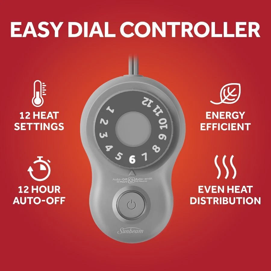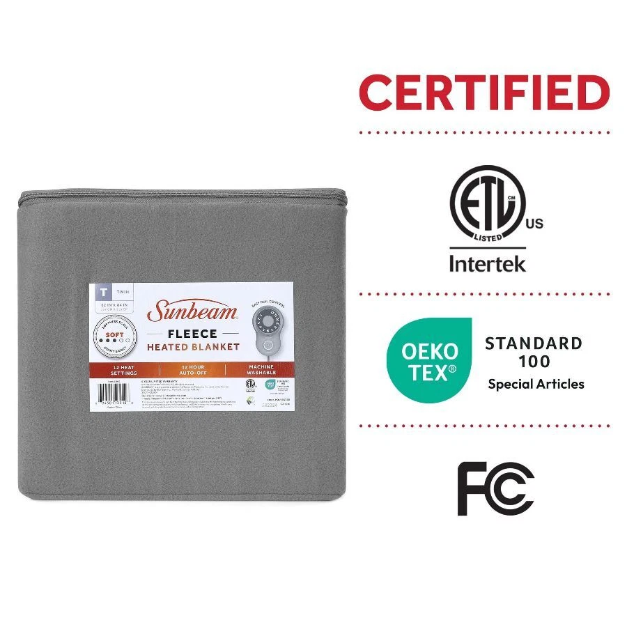 Sunbeam Gray Fleece Electric Heated Blanket wraps you in cozy warmth, perfect for those chilly nights. Indulge yourself with its soft and cozy material, wrapping you in warm comfort all night long. Available in Twin, Full, Queen and King size, in gray fleece color, this stylish electric blanket makes a great addition to any bedroom décor. The electric blanket comes with a user-friendly dial controller that offers 12 personalized heat settings, allowing you to find the perfect temperature for your comfort. Plus, the 12-hour auto shut-off and overheat protection features ensure added safety and peace of mind. The premium heated wires use advanced technology that senses and adjusts for even heat distribution. When ready to clean, simply detach the controller and place in the washing machine and dryer for easy care. It stays soft wash after wash. Sunbeam is an American brand trusted for over 125 years in electric home appliances. All Sunbeam electric bedding products are ETL certified. On Dec 26, 2024 at 19:35:06 PST, seller added the following information: