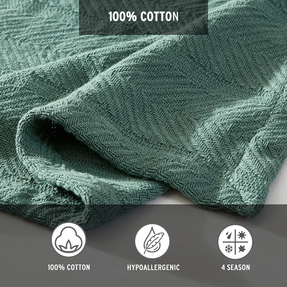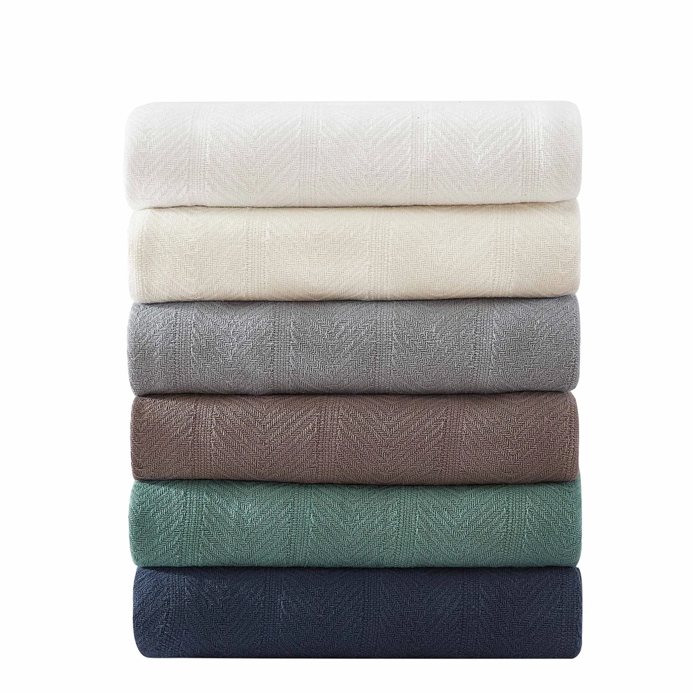 Add an extra layer of warmth to your bedding ensemble with the Herringbone Cotton Blanket. Available in several gorgeous colorways, this stylish cotton blanket will seamlessly coordinate with any bedroom décor. The high quality, ultra cozy construction offers comfort and is perfect for any room in your home. Featuring a subtle allover herringbone design, the yarn dyed cotton blanket can be used alone or layered onto your bed for the colder winter months. Blanket is machine washable for easy care. Twin blanket dimensions: (90"L x 66"W). Full/Queen blanket dimensions: (90"L x 90"W). King blanket dimensions: (90"L x 108"W). INCLUDES: (1) twin blanket MATERIAL: 100% Cotton FEATURES: Herringbone weave stitch and hemmed on all sides. Light-weight and durable for long lasting, year round use DIMENSIONS: 66" x 90" CARE INSTRUCTIONS: Machine washable for easy care. Machine wash cold, separately. Delicate cycle. Tumble dry low. Do not bleach. Please note 100% Cotton Blankets will produce lint over the first few launderings, this is normal and does not take away from the quality of the blanket