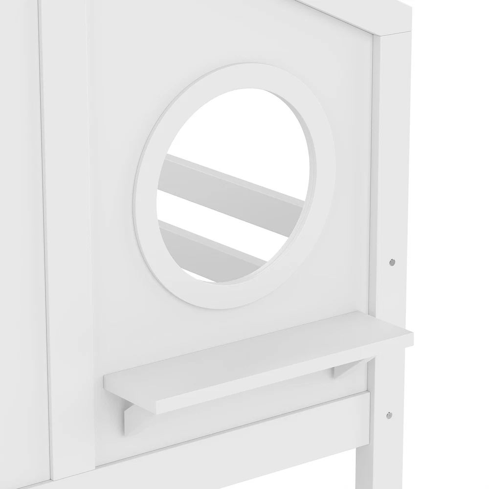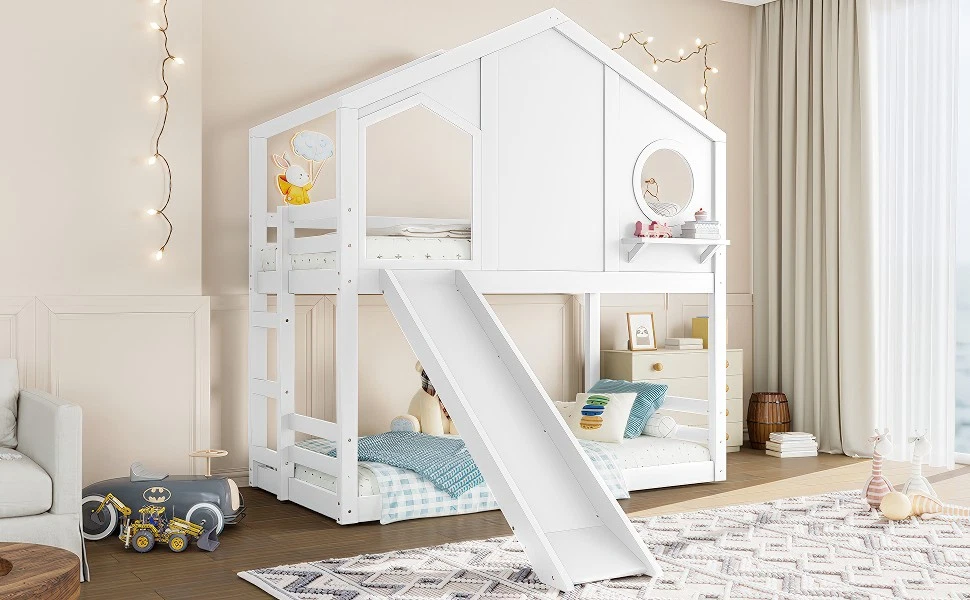 Twin House Bunk Bed w/Slide & Storage Shelves,Wood House Loft Bed w/Window White Features 【Playful House Design for Kids】This twin house bunk bed features a charming roofline and a built-in window, creating a fun and cozy play-and-sleep environment. Its childlike design sparks imagination and makes bedtime more enjoyable for kids. 【Fun Slide for Daily Play】Built with an engaging slide, this house bunk bed adds extra excitement to your child’s room. Kids can start their morning with playful energy, making the bed both a sleeping space and a mini playground. 【Solid Wood Construction】Crafted from high-quality solid wood, this bunk bed is sturdy, durable, and designed for long-term use. The stable frame and reinforced structure ensure a safe and reliable sleeping experience for children. 【Built-in Storage Shelves】Equipped with convenient storage shelves, the bed offers extra space for books, toys, and decorations. It helps keep your child’s room organized while maximizing floor space. 【Easy Assembly with Clear Instructions】All parts, tools, and a step-by-step illustrated manual are included. The straightforward design allows parents to assemble the bed quickly and efficiently. Descriptions Description Bring creativity and practicality together with this twin house bunk bed with slide and storage shelves, the perfect centerpiece for any child’s bedroom. Designed with a charming house-shaped roof and an adorable built-in window, this bunk bed creates a playful and cozy atmosphere where kids can sleep, imagine, and play freely. Kids will love the fun slide, adding excitement to everyday routines and turning their room into a joyful indoor playground. The solid wood construction ensures long-lasting durability and dependable stability, giving parents peace of mind. Along the side, built-in storage shelves offer a smart and accessible place for books, toys, and favorite decorations—helping maintain a clean and organized space. With all tools and detailed instructions included, assembling this child-friendly bunk bed is simple and convenient. Functional, safe, and full of childlike charm, this house bunk bed transforms any room into a warm and imaginative haven for kids. Weight & Dimensions Product Type Wood House Bunk Bed Color White Size Twin over Twin Material Pine Wood+Plywood+MDF Overall Product Dimension 78.7”L*41.3’’W*82.7”H Overall Product Weight 135.36 LBS Recommend Mattress Thickness of Bed 6’’ Weight Capacity 300 LBS for Upper Bed, 11 LBS for Shelf Number of Package 2 Package Dimension & Weight Please refer to the Specification Level of Assembly Full Assembly Needed Eligible for Hardware Packs Yes Country of Origin Vietnam Note All the pictures are taken by actual samples, slight chromatic aberration may occur due to lighting or display.