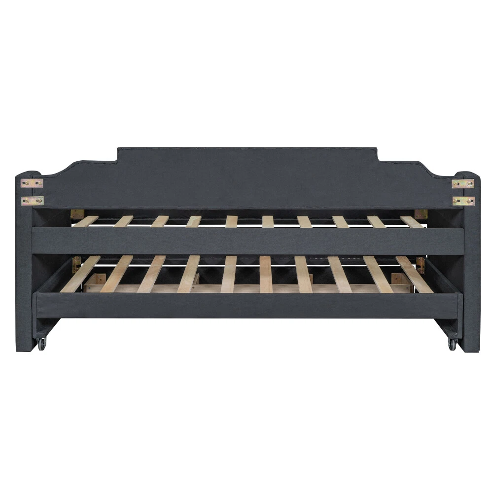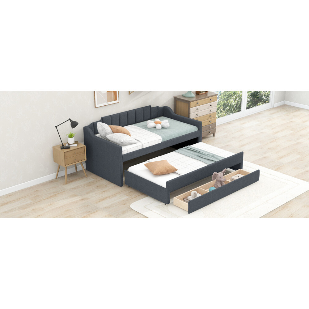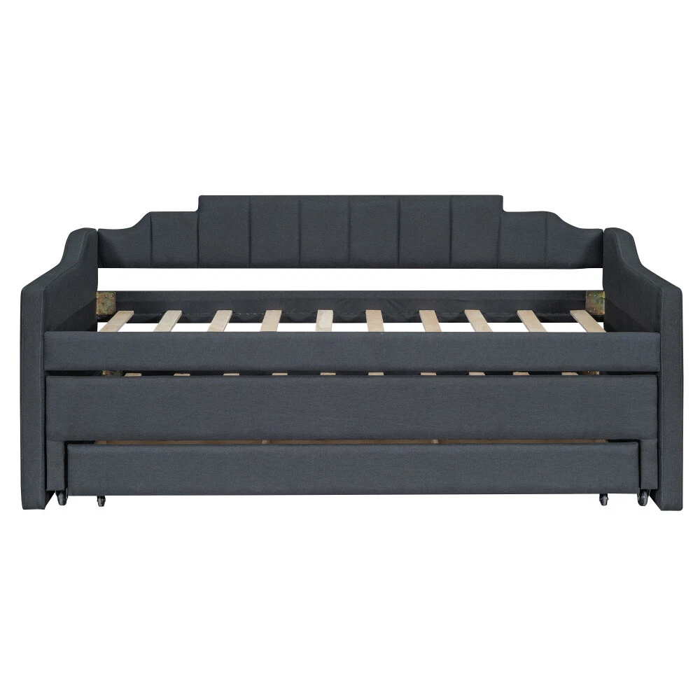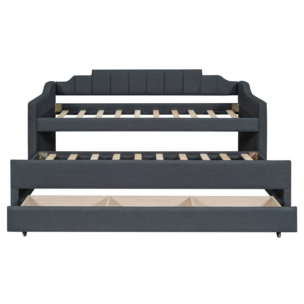 [Simple Design] This daybed with trundle and drawers is designed with a clean silhouette and a hue of elegance. It gives any room a spark of style that's both modern and timeless. [Modern Style] This daybed frame with rails in two sides not only can be a bed to be placed in your bedroom but also is ideal to be a sofa or seat in your living room. [Solid Construction] This daybed is crafted from pine wood and MDF and features a linen-blend upholstery awash in a solid finish.The construction ensures both a lifetime of use, and a sturdy frame with a backrest which won't wobble. [Trundle and Drawers] Best of all, it includes three lower drawers for keeping spare linens, clean clothes, games, and more.And with a trundle for entertaining guests or friends. [Easy Assembly] All parts, tools and instructions are shipped straight to your door in efficiently packed boxes for simple set-up that takes less than an hour with a friend's help. Twin Size Upholstered Daybed with Trundle and Three Drawers,Grey Playing the part of sofa and bed, daybeds are a fantastic solution for smaller spaces (think: studio apartments, guest rooms, home offices, etc.). They offer a cozy spot to curl up with a good book or catch a quick catnap, and they provide convenient sleeping arrangements for overnight guests during sleepovers and beyond. This daybed is crafted from pine wood and MDF and features a linen-blend upholstery awash in a solid finish. Best of all, it includes three lower drawers for keeping spare linens, clean clothes, games, and more.And with a trundle for entertaining guests or friends. Dimensions Overall Product Dimension 81''L*40.8''W*35.5''H Package Dimension Please refer to the Specification Daybed Dimension 75''x39'' Trundle Dimension 74.5''x39'' Total Height 35.5'' Daybed/Trundle Slats 10/10pcs Overall Product Weight 150lb Each Bed Weight Capability 250lb Daybed/Trundle Mattress Thickness 6''