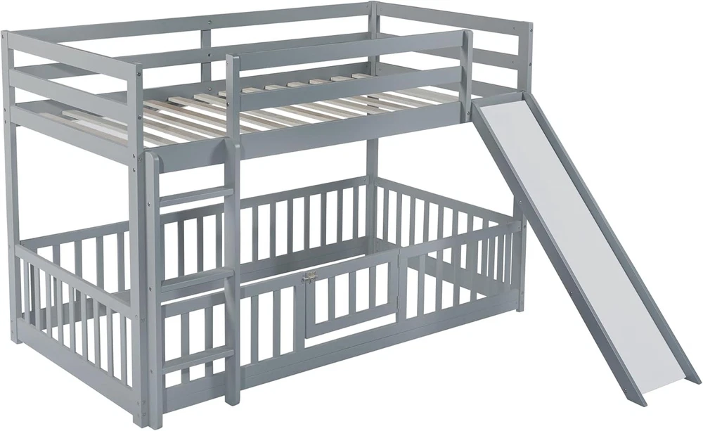 Product Description About this item [Bunk Bed with Slide]This kids bunk bed has built-in ladders and slides, It is not only a bunk bed, but also a kids play place, in addition, the slides and ladders are convertible, they can be placed left or right. [Bunk bed for Kids]- There is no bed slats in the lower bed, it is an open-row design, you can use it as a bed, or a child's play space,reading place and so on. Use your imagination to create your own fun space. [Floor Bunk bed with Fence and Door]: This wooden bunk bed under the bed has a circle of fences, there is a small door that can be opened and closed, which increases the interest of the bed, and the fence is detachable, which is convenient for your various need. [Sturdy and Durable Bed Frame]: Crafted with superior quality solid pine wood bed frame, this slide bunk bed frame is sturdy and solid, sturdy wood construction, no squeaks, and wobbles when you are going up or down. 14 plywood slats for upper bunk, no box spring is needed. [Easy to Assemble Bunk Bed Frame]- Bunk beds with slides do not require spring box or bases. The assembly instructions and required tools are delivered together with the bed frame. It is easy to assemble. It takes about 30 minutes for 2 people to assemble together. Twin over Twin Bunk Bed Bunk Bed with Slide and door If you need extra sleeping space or your family love sleepovers, this Twin Over Twin Bunk Bed is perfect for your home. For added extra fun, slide is included and can be put either left or right. This bed has three different assembly methods, the bottom guardrails and the bottom bed can be took off. Easy Assembly This bunk bed is easy to assemble. This bunk bed is shipped in two packages, so if you receive only one package, please be patient and wait for the later one. Also included is an installation manual and a complete set of necessary hardware to guide you through the assembly process. What's more, this bed has three different assembly methods, you the bottom guardrails and the bottom bed can be took off. 3 colors available Detailed display Convertible Ladder and Slide With built-in ladder, it is easy for you to climb up and down from the top bed. Featuring a low slide for you to play, this bunk bed can add fun to you and develop their sense of balance and coordination. The slide and the ladder are convertible, both of them can be put left or right. Bunk bed with slide This bunk bed comes with a slide that will give your kids room to play right at home, and it's sure to be a lot of fun. With door This wooden bunk bed under the bed has a circle of fences, there is a small door that can be opened and closed, which increases the interest of the bed, and the fence is detachable, which is convenient for your various need. Sturdy and Durable Bed Frame Crafted with superior quality solid pine wood bed frame, this slide bunk bed frame is sturdy and solid, sturdy wood construction, no squeaks, and wobbles when you are going up or down. 14 plywood slats for upper bunk, no box spring is needed. Guardrail height 14.4 inches Detailed specifications Material Pine + Plywood + PB Overall Product Dimension 77.4” x79.3” x 51.8” Number of Bed Slats 14 pcs Recommended Mattress Thickness 6 inches or less Bed Weight Capacity Upper: 250 lbs / Bottom: 250 lbs Overall Product Weight 116.8 lbs Country of Origin Vietnam