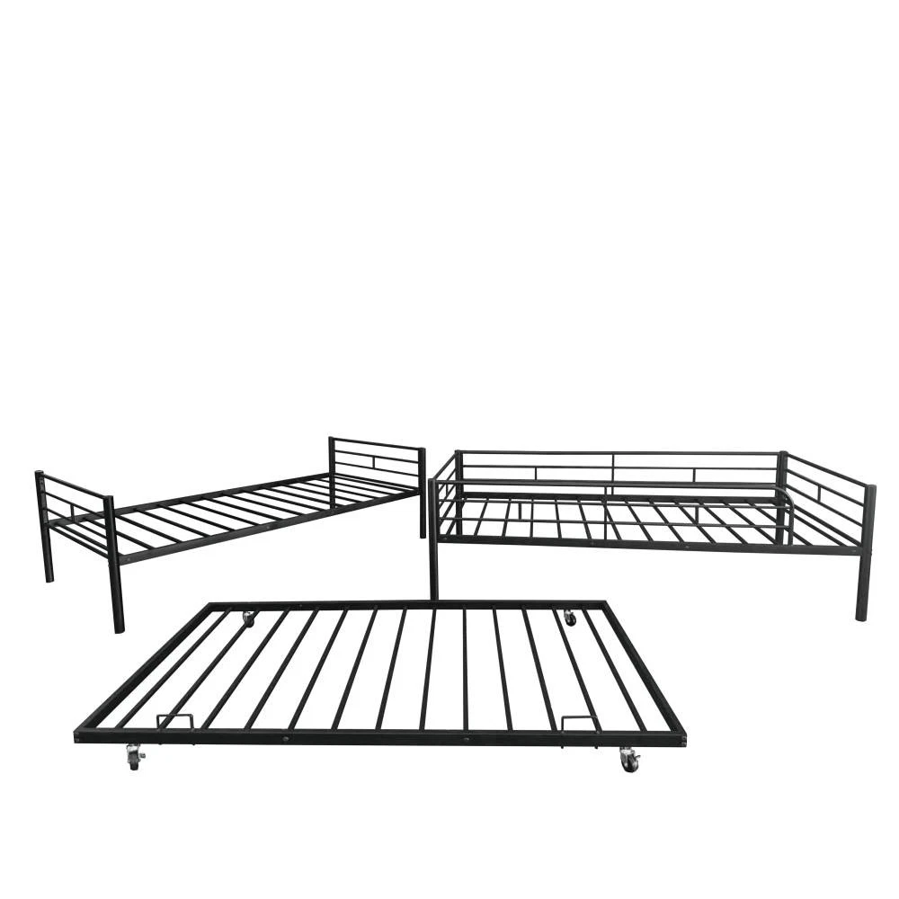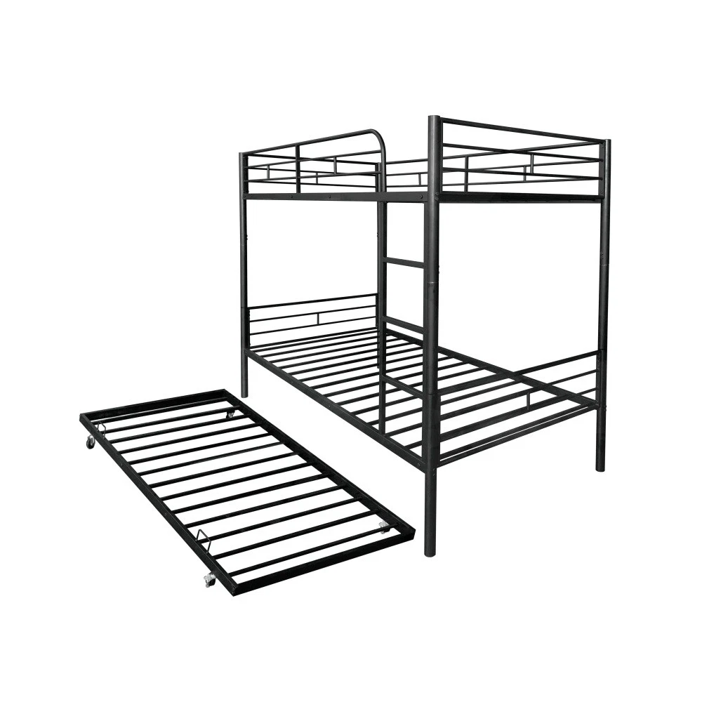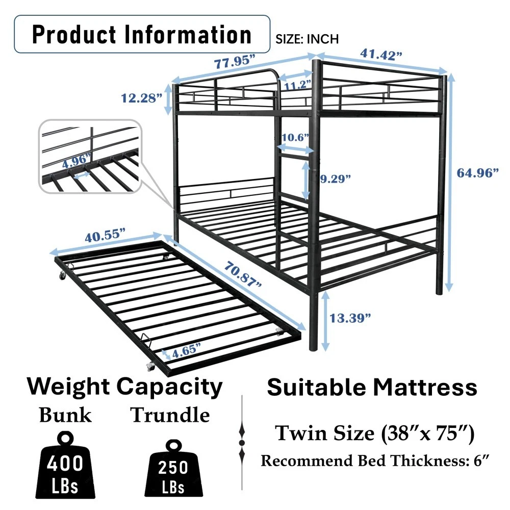 Twin Over Twin Separable Bunk Bed with Trundle - Black Steel Frame (GCC Certified) ✅ 1-Year Manufacturer’s Warranty | ✅ 30-Day Free Return & Exchange Maximize space and flexibility with this multi-functional Twin over Twin separable bunk bed—designed for growing families and small spaces! Crafted with a sturdy steel frame (made in Vietnam) and finished in sleek black, this bunk bed features a built-in trundle, dual-side ladders, and a convertible design that splits into two independent Twin beds. GCC (General Certificate of Conformity) certified for safety, it’s perfect for kids’ bedrooms, guest rooms, dorms, or vacation homes, blending durability, versatility, and peace of mind. 🌟 Standout Features You’ll Love ✅ Convertible Separable Design : Easily split this bunk bed into two standalone Twin beds with simple steps—adapt to changing needs (e.g., kids growing up, room rearrangements, or separate sleeping spaces). No extra tools required for conversion, making it a long-term investment for families. ✅ Built-In Trundle for Extra Sleep Space : Hidden trundle underneath the lower bunk provides an additional Twin sleeping surface—ideal for sleepovers, guests, or siblings. No box springs needed (mattresses sold separately), maximizing room space without sacrificing functionality. ✅ GCC-Certified Safety & Durability : Safety is prioritized! Upper bunk features full-length guardrails to prevent accidental falls, while the robust steel frame (with anti-rust coating) ensures stability and heavy-duty support. Passed GCC safety tests, complying with U.S. standards to protect kids from harm. Metal slats secure mattresses (prevent sliding) and extend mattress lifespan. ✅ Dual-Side Ladders & Space-Saving Design : Ladders on both sides offer easy access to the upper bunk and flexible room layout options. The bunk design saves floor space, and the under-bed clearance (without box springs) provides extra storage for toys, bins, or luggage—keeping rooms tidy. ✅ Fast & Easy Assembly : All necessary tools and a detailed instruction guide are included! Clear labeling and step-by-step directions let you assemble the bed quickly (most users finish in 2-3 hours with 2 people)—no professional skills required. 📐 Detailed Product Specifications Feature Details Product Type Twin Over Twin Separable Bunk Bed with Trundle Color/Finish Black (Steel Frame with Anti-Rust Coating) Material Frame: High-Quality Steel; Slat Support: Metal Slats Bed Sizes Upper: Twin; Lower: Twin; Trundle: Twin Overall Dimensions 77.95”L x 41.42”W x 64.96”H Product Weight 79.70 lbs Weight Capacity Upper Bunk: 200 lbs; Lower Bunk: 250 lbs; Trundle: 150 lbs Safety Certification General Certificate of Conformity (GCC) Compliant Safety Features Full-length upper bunk guardrails, anti-rust steel frame, stable slat support Key Design Features Separable (splits into 2 Twin beds), dual-side ladders, built-in trundle, no box spring required Recommended Mattresses All beds: 6” max thickness (mattresses not included) Recommended Use Kids’ Bedrooms, Guest Rooms, Dorms, Vacation Homes, Small Spaces Package Dimensions 79.53”L x 14.57”W x 7.09”H Package Weight 87.40 lbs Country of Origin Vietnam 📦 Secure Package Contents Heavy-Duty Steel Frame (Upper Twin + Lower Twin Bunk + Trundle) Metal Slat Support Systems (for all three sleeping surfaces) Full-Length Upper Bunk Guardrails Dual-Side Ladders All Assembly Hardware (screws, bolts, brackets) Step-by-Step Assembly Instructions Necessary Assembly Tools 🛡️ Trusted Guarantees for Peace of Mind ✅ 1-Year Manufacturer’s Warranty : We stand behind our craftsmanship! This bunk bed is covered for 1 year against manufacturing defects (e.g., faulty steel parts, broken slats, defective hardware, or anti-rust coating damage). We’ll repair or replace defective parts free of charge. ✅ 30-Day Free Return & Exchange : Not satisfied with your purchase? Return or exchange it within 30 days of delivery for a full refund—no questions asked! We cover all return shipping costs for a stress-free shopping experience. ✅ Responsive Customer Service : If parts are missing or damaged upon delivery, contact us immediately—we’ll reply within 24 hours to send replacements or resolve issues. 🛠️ Assembly & Care Tips Assembly : Lay a soft cloth on the floor during setup to protect the frame and flooring. Tighten all screws gradually for proper alignment—2 people recommended for efficiency. Follow conversion steps carefully if splitting into two beds. Care : Wipe the steel frame with a damp cloth and mild soap to clean; avoid abrasive cleaners that may scratch the anti-rust coating. Check guardrails, ladders, and hardware periodically to ensure tightness. Mattress Note : Mattresses are not included. For safety, use mattresses within the recommended 6” thickness to ensure guardrail effectiveness and trundle functionality. 📝 Important Notes Color Variation : The black anti-rust coating may appear slightly different due to lighting or screen display—refer to the actual product for the most accurate finish. Size Tolerance : Manual measurements may have minor variations (±0.5”), which is normal and does not affect safety or functionality. Weight Limits : Do not exceed stated weight capacities to prevent structural damage. The upper bunk and trundle are designed for children (not adults) due to safety and weight restrictions. This separable bunk bed with trundle is the ultimate space-saving, versatile solution for modern families—combining safety, durability, and adaptability. Backed by a solid warranty and free returns, it’s a purchase you can feel confident about.