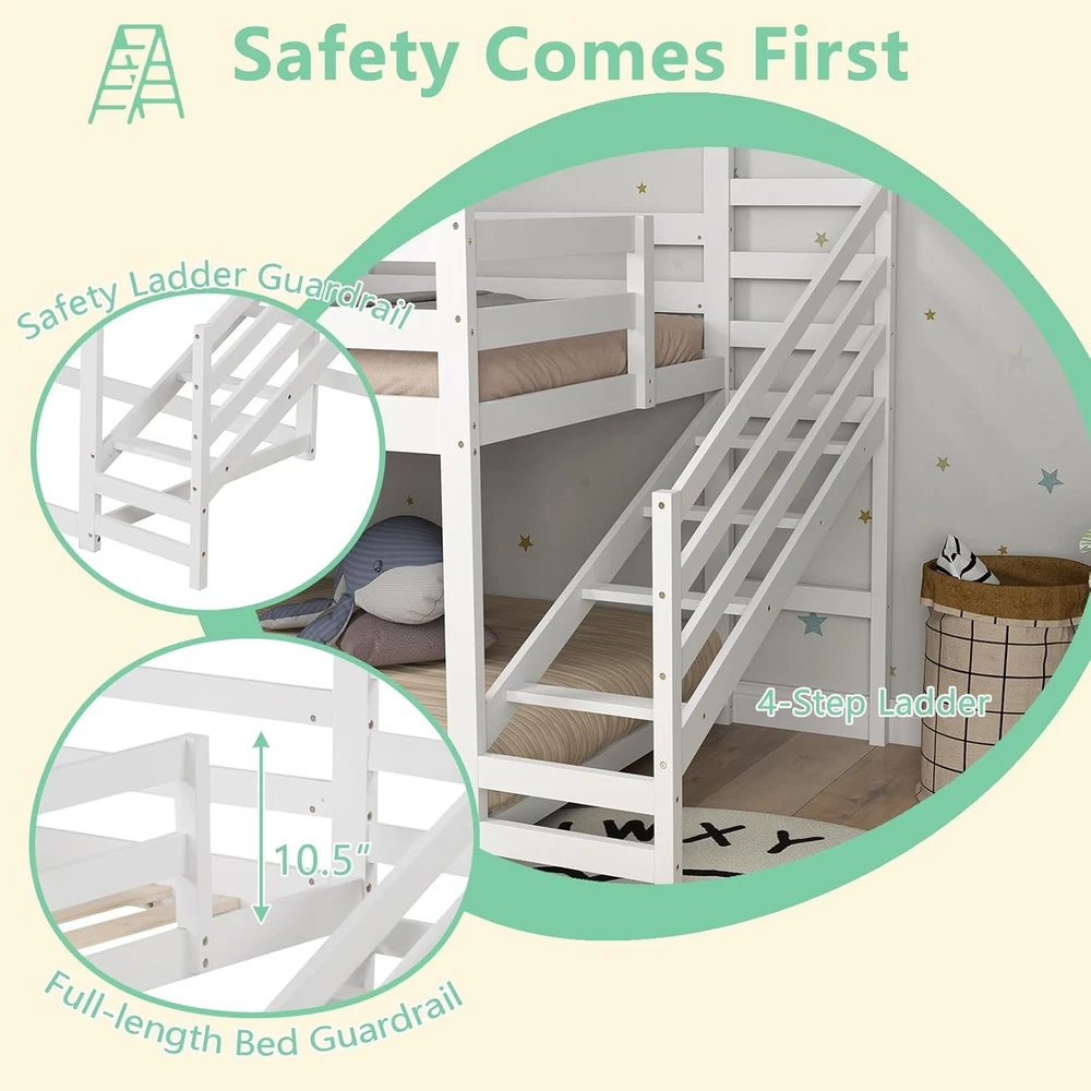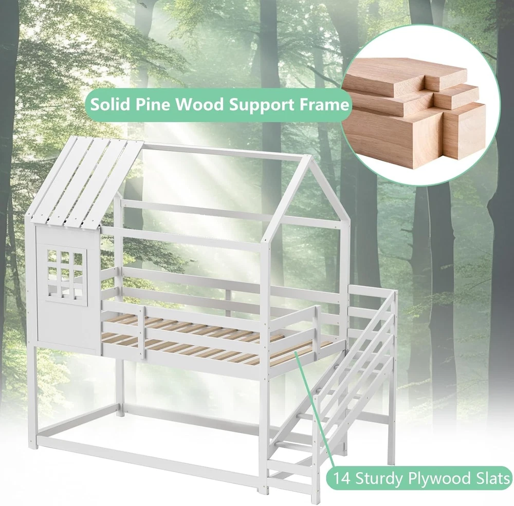 Product Description About this item Creative House Bed: This twin-over-twin bunk bed features a house-shaped frame complete with a roof and window, offering a playful and imaginative sleeping space for children. It can be further enhanced with decorative lights and other items to create a personalized and cozy environment. Versatile Under-Bed Area: The space beneath the upper bunk measures 26” in height. It can be used either as a slat-free floor bed providing an additional sleeping option or as a play center, perfect for storing and organizing kids’ toys and furniture. Sturdy-Built Wooden Frame: Made from solid pine wood and robust plywood, this house bed is built to last. The 14-slat platform boasts the strength to support up to 330 lbs, ensuring stability and safety for children. Safe & Convenient Access: Equipped with 4-step stairs and a full-length safety guardrail, this kids’ bed prioritizes both convenience and safety, making it easy for children to climb up and down while minimizing the risk of falls. Roomy Dimensions: Measuring 92" x 42.5" x 86" (L x W x H), this low loft bed accommodates standard 6" twin size mattresses without the need for a box spring. Coupled with sleek finish, it will be the perfect addition to kids’ rooms. Description Discover the magic of dreamland! Transform your child’s bedroom into a charming cottage with our creative house bed! Designed as a captivating twin-over-twin bunk bed, it features a whimsical house frame with a roof and window, perfect for inspiring playful imaginations. Underneath lies a versatile space perfect for sleeping or playtime adventures, easily customized with lights and decorative items for a personal touch. Crafted with sturdy pine wood and strong enough to support up to 330 lbs, this bunk bed ensures safety with a solid 14-slat platform and a handy 4-step ladder guarded by a full-length rail. Fits standard twin mattresses and adds a sleek, magical touch to any room, no box spring required! Make bedtime exciting and safe with this enchanting loft bed! Feature Decorative house frame with roof and window enhances the appeal Upper bunk with 14 sturdy plywood slats can support up to 330 lbs Surrounded by full-length safety guardrail to prevent falling accidents 4-step stairs with guardrail ensure easy access to the upper bunk 26” under-bed space serves different purposes, like sleeping or playing Crafted from high-quality wooden material for long-lasting support Space-efficient design makes it suitable for smaller rooms Specification Color: White Material: Pine Wood, Plywood, MDF Overall Dimensions: 92" x 42.5" x 86" (L x W x H) Height of Guardrails: 10.5" Height of Under-bed Space: 26" Width of Ladder: 13" Weight Capacity: 330 lbs Net Weight: 108 lbs Package Includes: 1 x House Bunk Bed 1 x User Manual