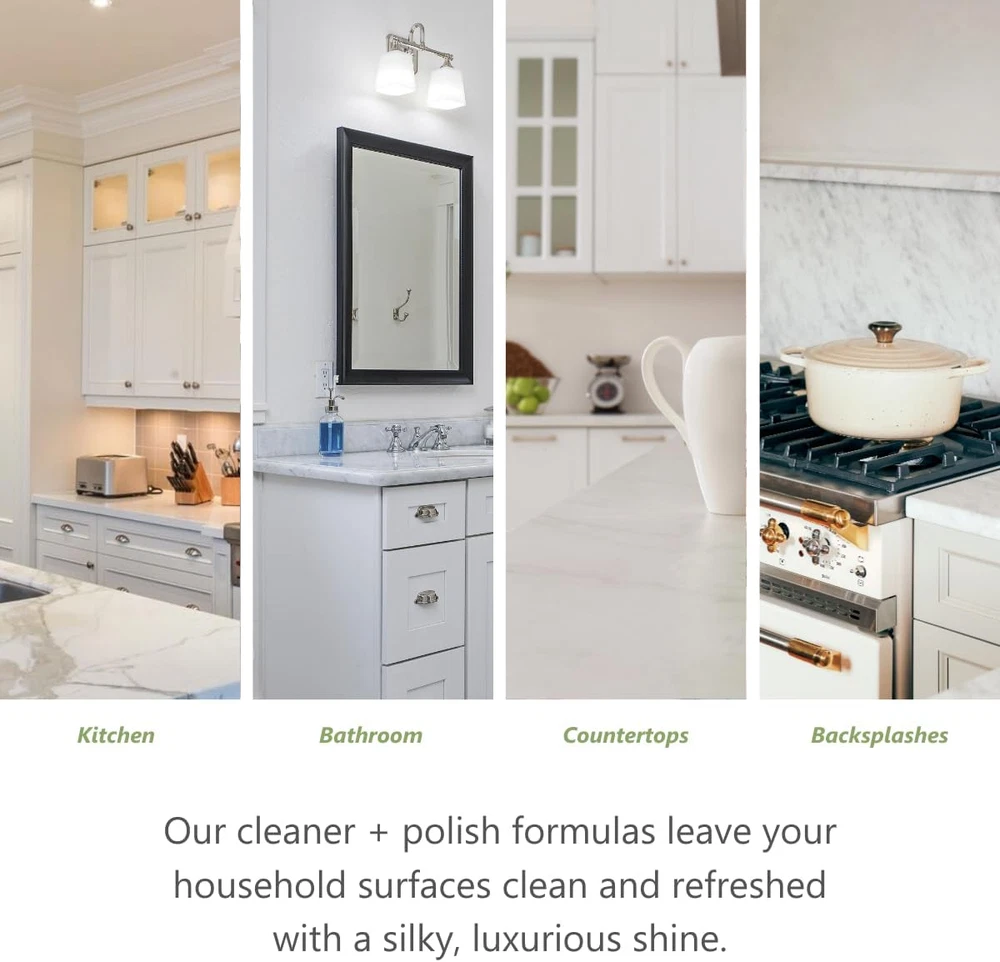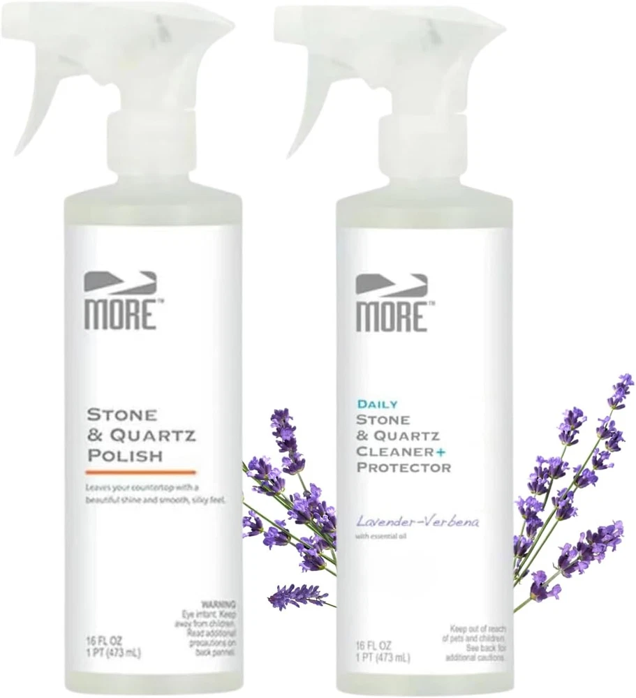 TWIN PACK - Stock your home with a twin pack of our best-selling products, MORE Stone & Quartz Cleaner + Protector and MORE Stone & Quartz Polish. This twin pack is sold together, but in two separate bottles. CLEANER + PROTECTOR - MORE Stone & Quartz Cleaner + Protector protects and cleans your countertops, including marble, quartzite, granite, limestone, travertine, onyx, basalt, sandstone, concrete, quartz, and many other natural stones and tile. POLISH - Our MORE Stone & Quartz Polish is a high-performance, spray and wipe polish that is specifically designed for natural stone and quartz surfaces. This spray will improve the gloss level of the surface and give it a smooth and silky feel. EFFECTIVE FORMULAS - Unlike competitors who try to mix a polish and a cleaner into one product, we have separated the two and offer MORE Stone & Quartz Cleaner + Protector and MORE Stone & Quartz Polish in this twin pack. Because these products are separate, you can be sure your surface gets cleaned and polished as each spray has their own effective ingredients. MORE - MORE Surface Care brings a fresh, new approach to stone and tile care. Every product in the MORE line is manufactured in the USA and formulated specifically to work seamlessly together to care for and protect your natural stone, ceramic, porcelain, and concrete surfaces. Our products are safer and easier to use, without sacrificing quality or results. Product Description More from MORE Surface Care Add to Cart Add to Cart Add to Cart Add to Cart Add to Cart Add to Cart Customer Reviews 4.5 out of 5 stars 1,068 4.5 out of 5 stars 717 4.4 out of 5 stars 85 4.2 out of 5 stars 153 4.5 out of 5 stars 198 4.1 out of 5 stars 15 Price $18.99 $ 18 . 99 $27.99 $ 27 . 99 $28.99 $ 28 . 99 $53.99 $ 53 . 99 $59.99 $ 59 . 99 $18.99 $ 18 . 99 Compatible Surfaces Marble, Granite, Quartzite... Vinyl Tile, Vinyl Plank Marble, Granite, Travertine Int./Ext. Quartz Surfaces Granite, Marble, Limestone... All Stainless Steel Surfaces Where to Use Kitchen, Countertops, Bathroom Living Room, Kitchen, Etc. Grout & Floor Kitchen, Exteriors, Floors Kitchen, Exteriors, Floors Kitchen, Outdoor Appliances Scent Lavender-Verbena Essential Oil Unscented Unscented Unscented Unscented Peppermint-Thyme Essential Oil Streak-Free ✔ ✔ ✔ ✘ ✘ ✔ Water-Based Formula ✔ ✔ ✔ ✔ ✔ ✔ Air Friendly and Low VOC ✔ ✔ ✔ ✔ ✔ ✔ Professional Grade Easy to Use ✔ ✔ ✔ ✔ ✔ ✔