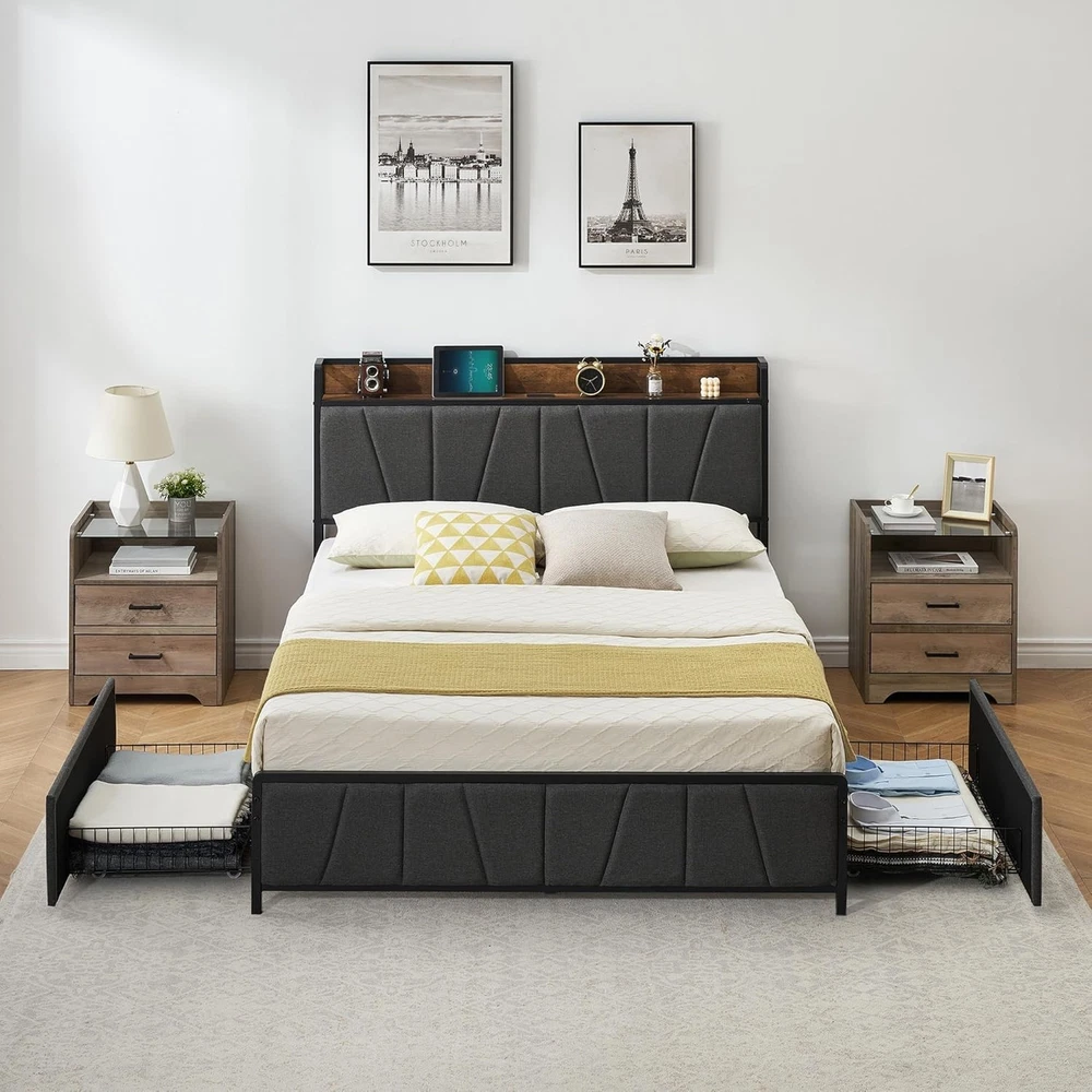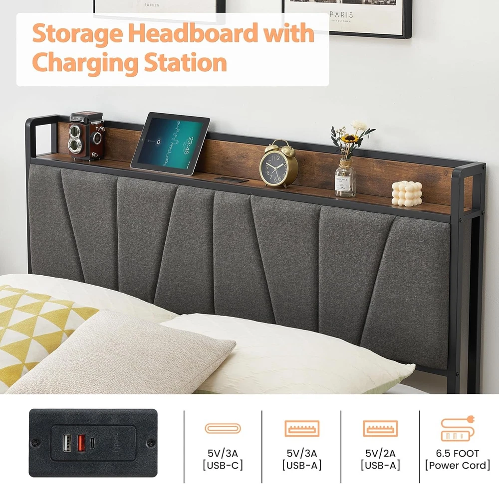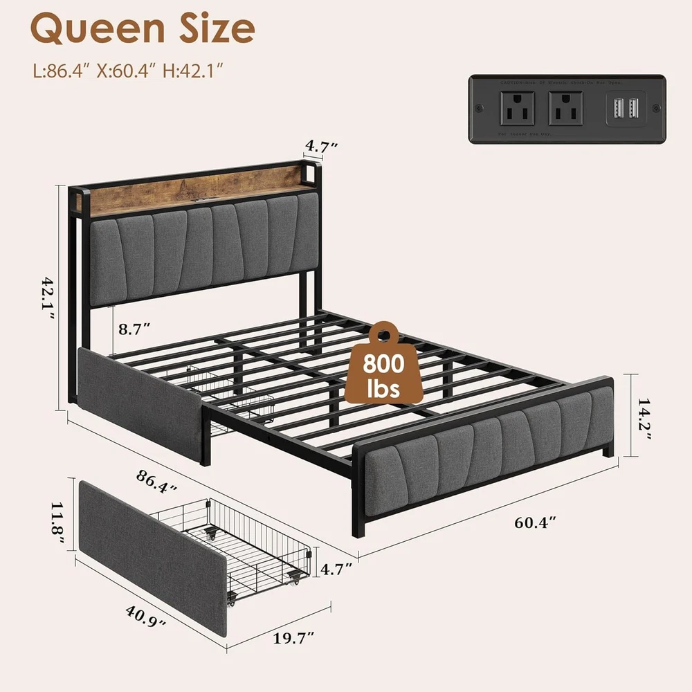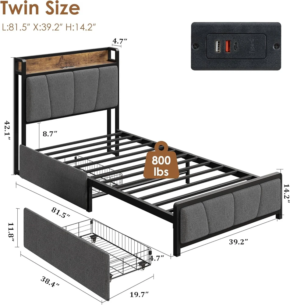 Product description 【Storage Headboard with Charging Station】This bed frame with storage headboard allows you to easily store small items such as phones, glasses and books. It is equipped with 2 USB ports and 1 Type-C port, providing a maximum of 5v/3a for fast charging efficiency. The linen upholstered headboard not only adds a stylish touch to your room, but also allows you to comfortably lean back to read books or use your phone. 【Twin Size Bed Frame with 2 Storage Drawers】This bed frame comes with 2 spacious storage drawers with smooth wheels, perfect for storing clothes or bedding. The screw lock prevents the drawers from sliding out. Additionally, the extra 10.6-inch space under the bed can be used to store shoes, boxes, or suitcases, making the most of the under bed space. 【Ideal for Placement Against the Wall】You have the flexibility to choose the placement of the two drawers under the bed. Placing both drawers on one side allows the other side to be placed against the wall, avoiding wasted drawer space. This feature is particularly suitable for families with kids or limited room space, as placing the bed against the wall prevents children from falling off the bed, providing extra safety. 【More Space for Nightstand】If you have a need for nightstand, you can choose to place a drawer on each side of the foot of the bed, as placing drawers at the head of the bed may be obstructed by nightstand. If you have these requirements above, our bed frame is the perfect choice for you. 【Sturdy Structure & Noise-Free】This bed frame is constructed with 12 high-quality metal slats and 8 heavy-duty support legs, ensuring both comfort and stability. It can withstand a maximum weight capacity of 800 pounds. With no need for a box spring and the use of noise-reducing cotton, you can enjoy a quiet and comfortable sleeping environment. 【Easy Assembly】All the parts and tools of our platform bed frame are marked out in the manual. Clear assembly instruction helps people with zero assembly experience. It only takes around 60 minutes to complete the installation. Any problems with this bed frame, please feel free to contact us, we will provide you with 24 hours professional customer service. Twin/Twin-XL Size Bed Frame with 2 Storage Drawers Twin Size Bed Frame with 2 Storage Drawers and Charging Station Charging Station with USB Ports & Outlets Soft Linen Backrest The comfortable Linen backrest has a soft fexture, is resistant to sinking, and offers great bounce. The bed has stable frame with noise-free design & easy to install. Functions 1 2 Large Drawers 2 Stable Frame 3 Under-Bed Storage A Gift for Kids Specification Size Option TWIN/TWIN-XL/FULL/QUEEN/KING Fabric Linen Drawers 2 (Can be placed anywhere) Charging Station Yes Noise Free Yes Easy to Install Yes All Day Customer Serivice Yes Color Yes GAOMON High Quality Bed Frames Customer Reviews 4.0 out of 5 stars 1 — 4.0 out of 5 stars 2 4.8 out of 5 stars 23 Price $99.99 $ 99 . 99 $221.07 $ 221 . 07 — $169.99 $ 169 . 99 Color Pink / White White / Grey White / Grey Pink / White / Blue Available Size Twin Full / Queen / King Full / Queen / King Twin/Twin XL/Full Soft Headboard Charging Station Storage Drawer Easy to Assemble Noise Free Weight Capacity 1000 lbs 1000 lbs 1000 lbs 1000 lbs From the brand Gaomon is committed to creating a comfortable residence for customers that meets their style and needs space. We pursue excellent craftsmanship quality and fashionable design, integrating them with modern aesthetics to give customers diverse choices and unparalleled value and satisfaction. GaoMon hopes to become the first choice channel for customers to find ideal furniture while pursuing a high-quality life road brand. Farmhouse Cabinet Bed Frame Makeup Vanity Farmhouse Console Table Bathroom Storage Series What is our brand value? our mission is to improve people's living spaces and improve their overall quality of life. What is the direction of our efforts? GAOMON is committed to creating a comfortable living space for customers that suits their personal style and needs. What is our pursuit? We pursue excellent craftsmanship quality and fashionable design, integrating them with modern aesthetics to give customers diverse choices and unparalleled value and satisfaction.