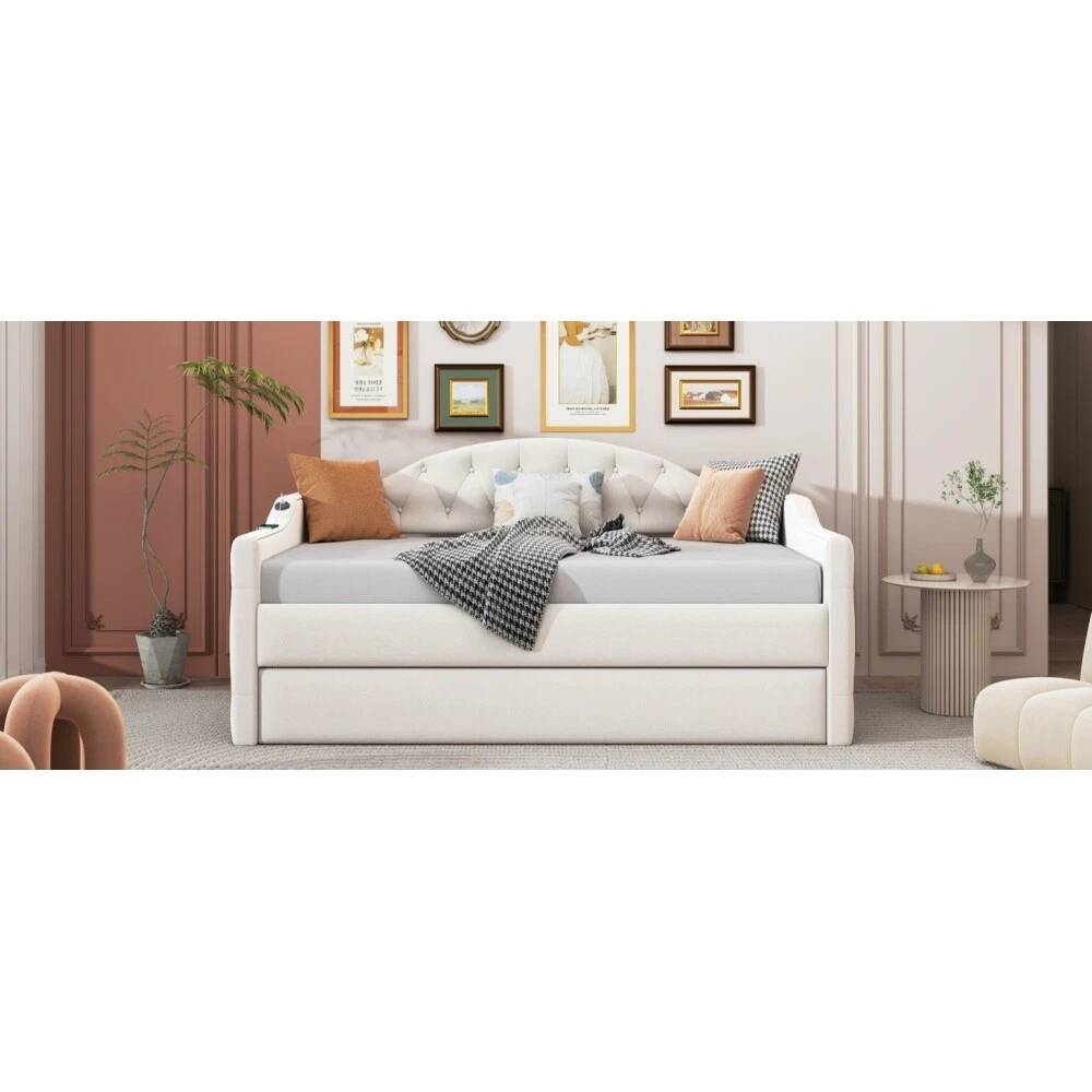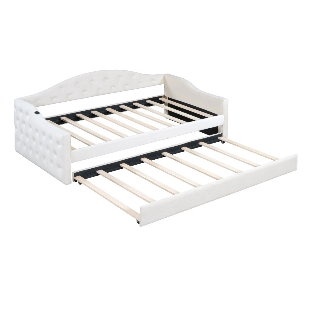 [Elegant design] This daybed features an elegant and generous design with tufted detailing, upholstered in luxurious velvet fabric. It comes with a backrest and two armrests. The backrest features a tufted design. With its stylish appearance and functional design, this daybed is an excellent addition to any modern living space. [Daybed Frame with Charging Station] This dual-purpose daybed accommodates two people comfortably, offering both seating and sleeping functionality. It is equipped with a charging station featuring USB&Type-C ports for added convenience. When you're lying on the daybed and your phone is running out of battery, you can conveniently charge it right away. [Maximized space] This daybed is designed with pull-out wheels, allowing for easy mobility and saving maximum space. It is perfect for accommodating overnight guests with its convenient and self-contained sleeping arrangement. Whether in a compact living room or a small guest room, this space-saving daybed offers comfort and functionality without compromising on style. [Solid Construction] Made of high-quality MDF, the frame of this bed is not easy to be affected by humidity change and lead to crack. The strong legs, wide boards and slats for bed and trundle,not only improve the weight capacity of the bed greatly but also ensure the stability. [Dimensions and Assembly] Overall Product Dimension: 80.2"L X 41.6"W X 33.2"H. Suitable for Twin size mattresses. Twin Size Tufted Upholstered Daybed with Trundle ,Velvet Sofabed with USB Charging Ports This daybed features an elegant and generous design with tufted detailing, upholstered in luxurious velvet fabric. It comes with a backrest and two armrests. The backrest features a tufted design. This dual-purpose daybed accommodates two people comfortably, offering both seating and sleeping functionality. It is equipped with a charging station featuring USB&Type-C ports for added convenience.With its stylish appearance and functional design, this daybed is an excellent addition to any modern living space.