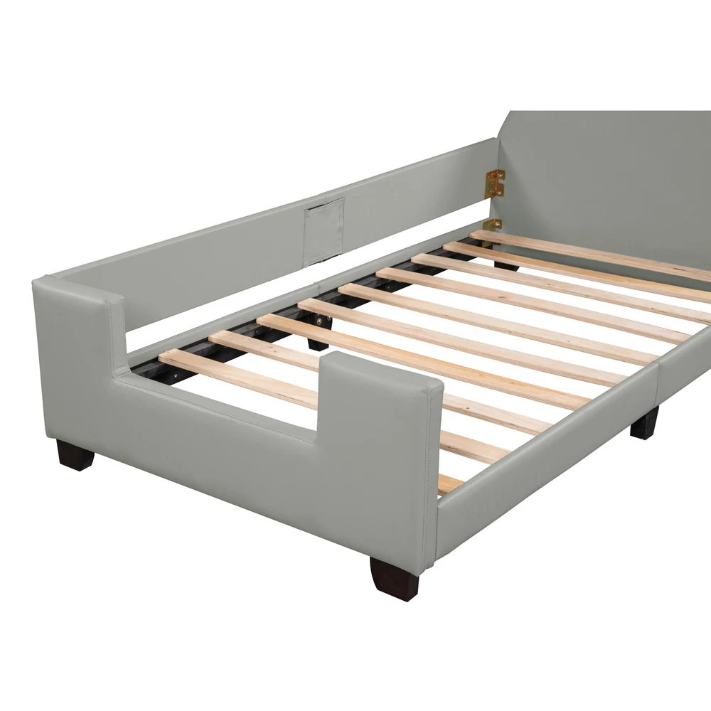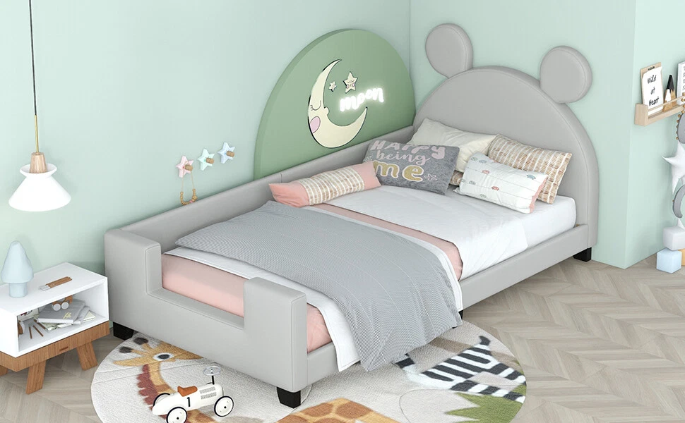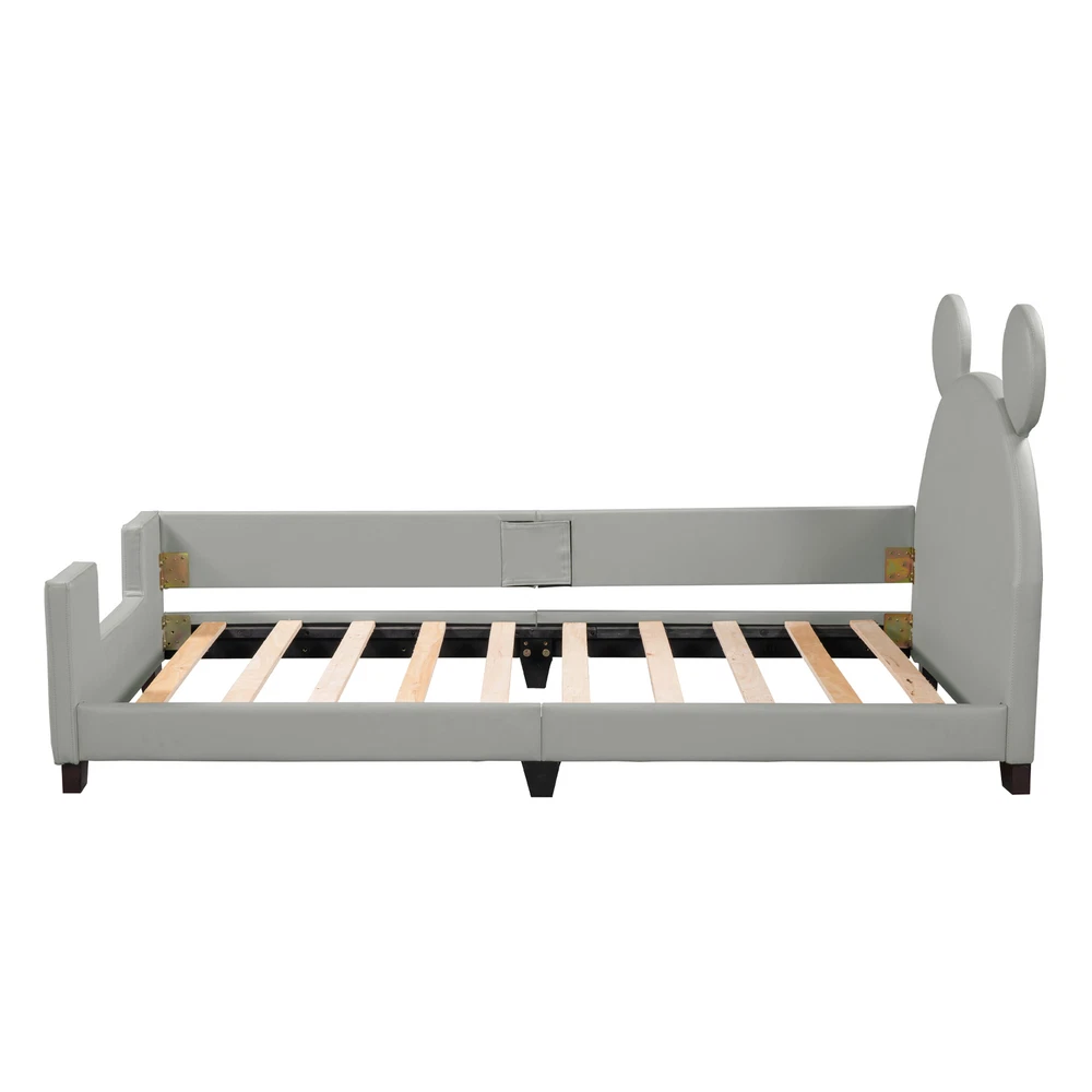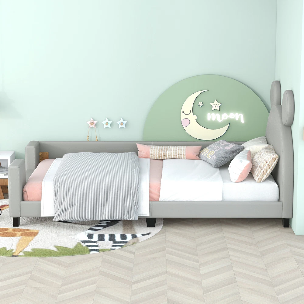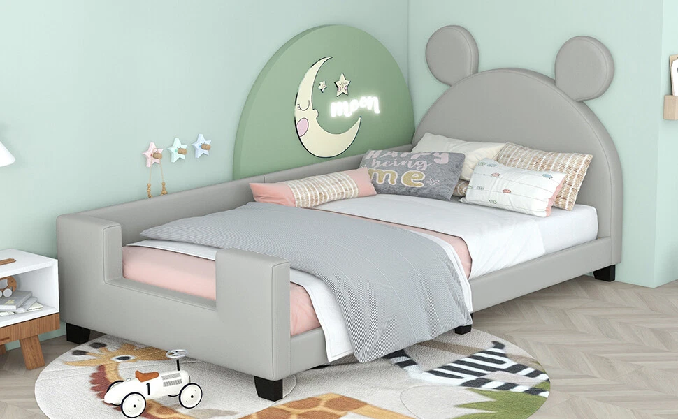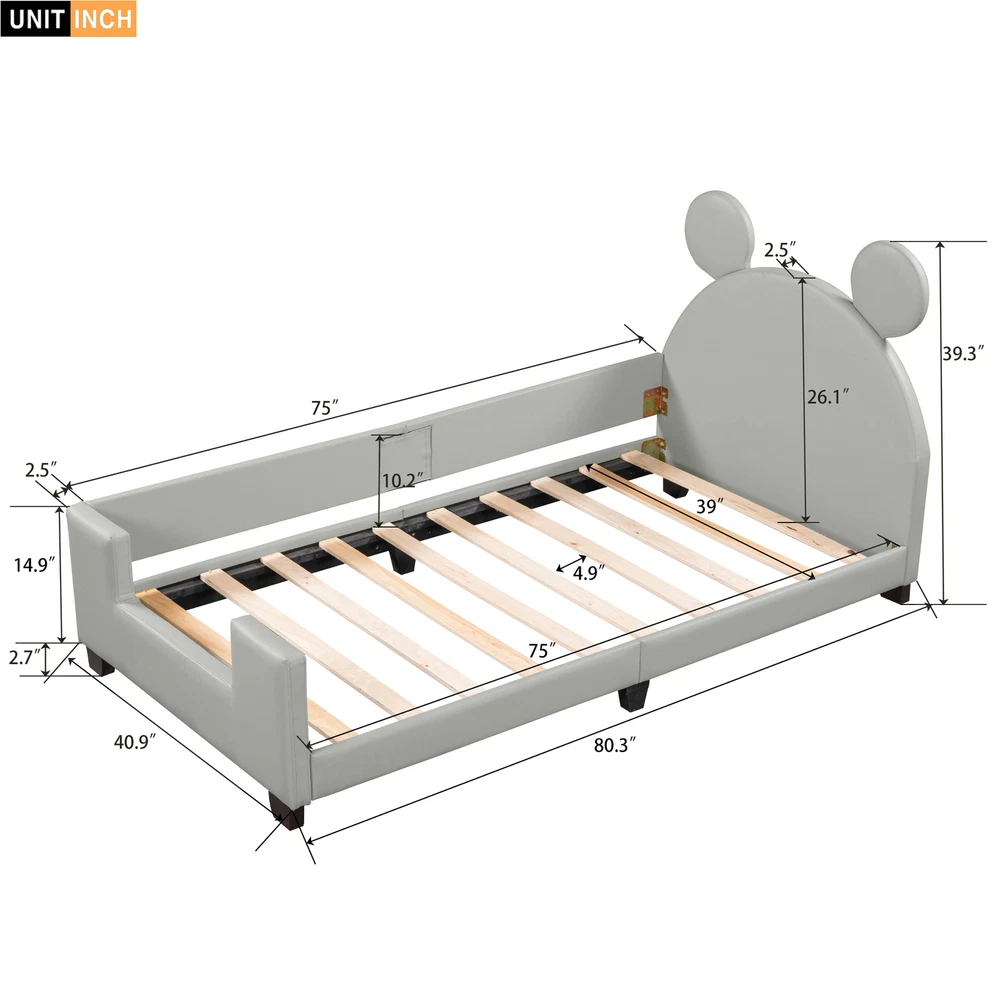 This platform bed showcases a low-profile silhouette and clean lines for a modern look in your bedroom or guest room. The frame is built from pine wood and, and it rests on splayed legs with a light finish. This bed is upholstered with a medley of colors to choose from that best suits your style. The headboard in the shape of carton ears provides you with a soft backrest which is cute and practical. ①[Sturdy Frame] Constructed with a durable wood frame with high-quality hardware that provides a strong and sturdy bed. ②[Convenient Design] Built low to the ground to help your little one get in and out of bed easily. Generous padding ensures-lasting comfort and support while sitting up to read or watch TV. ③[Lively Color] Perfect for your little one's bedroom, this twin daybed shows off lively color upholstery with a playful scalloped silhouette for a look both you and your little one will love. ④[Solid Construction] That's why all products are built with-lasting materials to ensure they stand up to years of jumping and playing.