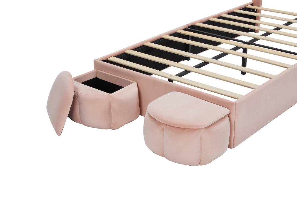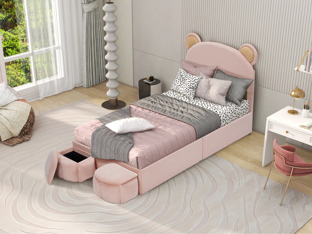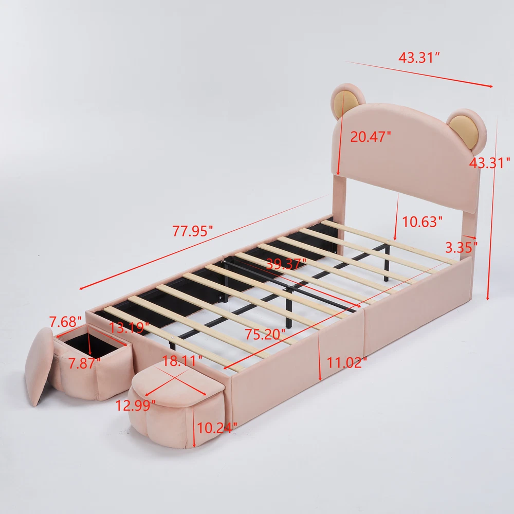 Brand Unbranded Item Length 50.39 Item Width 22.44 Item Height 7.87 Color Pink Frame Material MDF Metal,Velvet Type BED FRAME Compatible Mattress Size As described Diamond-ring-1 Simple life Twin Size Upholstered Platform Bed Frame with Cartoon Bear Ears Shaped Headboard for Kids Teens Bedroom, No Box Spring Needed 【Stylish Headboard】 Designed with an adorable bear-shaped headboard, this bed frame not only embody a sense of style to your bedroom but also provides comfortable back support. The headboard enhances the overall aesthetic while offering a cozy spot to sit up and read or watch TV. 【Durable Wooden Slats】 The bed frame includes sturdy wooden slats that offer excellent support for your mattress, eliminating the need for a box spring. This robust design ensures mattress stability and longevity, giving you a comfortable and reliable sleep surface. [Extra Storage Space] There are 2 small storage stools at the end of the bed, where you can store toys or bedding. The lid protects against dust very well. 【Easy Assembly】Assembly is a breeze with clear instructions and all necessary tools included. The straightforward setup allows you to quickly assemble your new bed frame and start enjoying its stylish design and practical features in no time, making it a premium choice for any bedroom. Dimension Overall Dimension 77.95"L x 43.31"W x 43.31"H Overall Weight 77.00 Lbs Package Number 1 Weight Capacity 300 LBS Specifications Product Name Upholstered Bear Headboard Bed Frame Size Twin Color Pink Frame Material Plywood Bed slat material Plywood Fabric Material Velvet Filling material Foam Box Spring Required No Numbers of Slats Included 10 Center Support Legs Yes Mattress Included No Assembly Required Yes Country of Origin China Item Specifics Brand Unbranded Item Length 50.39 Item Width 22.44 Item Height 7.87 Color Pink Frame Material MDF Metal,Velvet Type BED FRAME Compatible Mattress Size As described Payment Returns Diamond-ring-1 Simple life DESCRIPTION PAYMENT SHIPPING RETURN POLICY CONTACT US Shop Category Store Home Other Hot Item Delivery New List Item Help & Info Payment Policy Shipping Policy Return Policy FAQ About Us Twin Size Upholstered Platform Bed Frame with Cartoon Bear Ears Shaped Headboard for Kids Teens Bedroom, No Box Spring Needed 【Stylish Headboard】 Designed with an adorable bear-shaped headboard, this bed frame not only embody a sense of style to your bedroom but also provides comfortable back support. The headboard enhances the overall aesthetic while offering a cozy spot to sit up and read or watch TV. 【Durable Wooden Slats】 The bed frame includes sturdy wooden slats that offer excellent support for your mattress, eliminating the need for a box spring. This robust design ensures mattress stability and longevity, giving you a comfortable and reliable sleep surface. [Extra Storage Space] There are 2 small storage stools at the end of the bed, where you can store toys or bedding. The lid protects against dust very well. 【Easy Assembly】Assembly is a breeze with clear instructions and all necessary tools included. The straightforward setup allows you to quickly assemble your new bed frame and start enjoying its stylish design and practical features in no time, making it a premium choice for any bedroom. Dimension Overall Dimension 77.95"L x 43.31"W x 43.31"H Overall Weight 77.00 Lbs Package Number 1 Weight Capacity 300 LBS Specifications Product Name Upholstered Bear Headboard Bed Frame Size Twin Color Pink Frame Material Plywood Bed slat material Plywood Fabric Material Velvet Filling material Foam Box Spring Required No Numbers of Slats Included 10 Center Support Legs Yes Mattress Included No Assembly Required Yes Country of Origin China Item Specifics Brand : Unbranded Item Length : 50.39 Item Width : 22.44 Item Height : 7.87 Color : Pink Frame Material : MDF Metal,Velvet Type : BED FRAME Compatible Mattress Size : As described Payment Returns All rights reserved.
