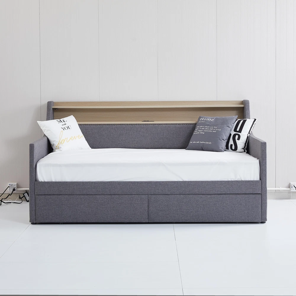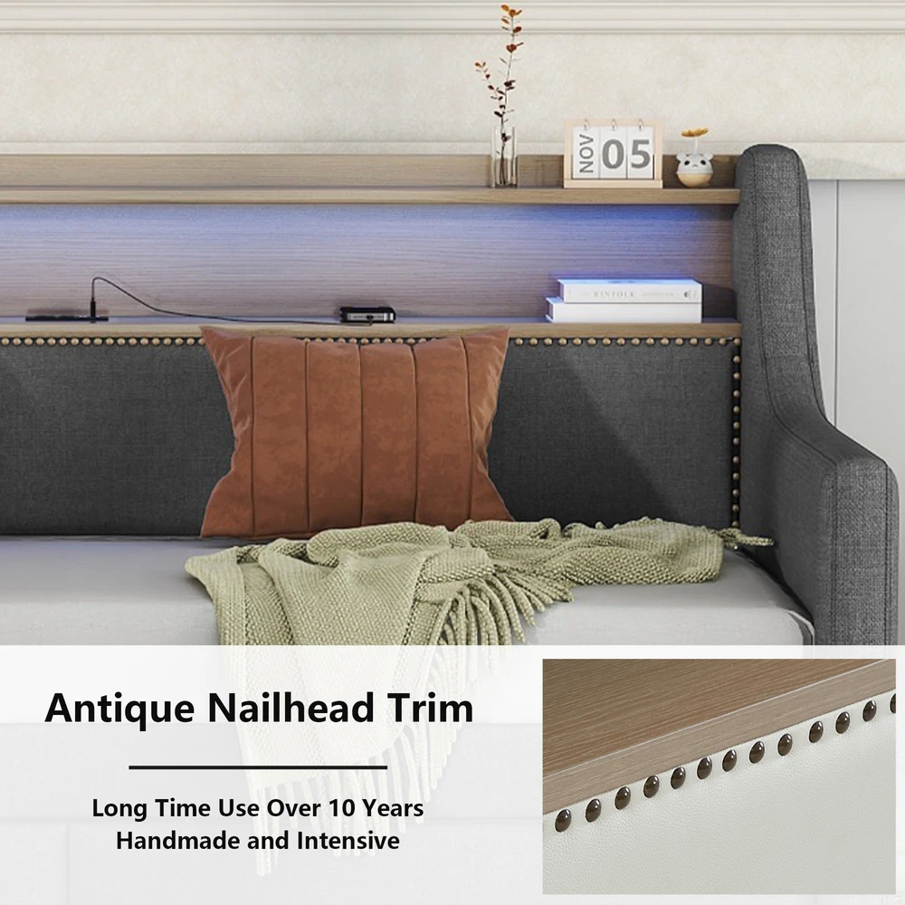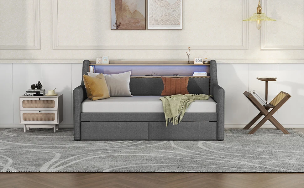 Twin Size Daybed with Storage Drawers, Upholstered Daybed with Charging Station Features Stylish and Elegant Design--Our daybed with drawer is made of Linen fabric. With high backrest which lying more comfortable, two armrests make your hands free. Bronze nail head trim make this twin daybed more stylish and classic. A timeless design concept combined with a thick padded back and four side foam filled makes our daybed stand out from ordinary bed frame and brings you a comfort experience and soft touch. Charging Station--The built-in power socket comes with 2 USB ports and 2 outlets, allowing you to easily charge your electronic device while relaxing your body and mind. LED RGB Light--The LED light with a remote control offers 16 static colors and speed adjust and brightness adjust provide personalized lighting atmosphere for your night. Choose the color you like and completely immerse yourself in the beautiful night time. Storage Headboard--The headboard storage provides you with an extra place to store magazines, phones, beloved photos and decorations which is very practical. 2 Storage Drawers--This twin size daybed frame come with 2 drawers with wheels offers ample space for off-season clothing, bed sheets, etc. keeping your bedroom organized & clutter-free. Durable Frame--Our daybed frame is made of solid MDF and plywood, with dense and strong support to withstand the weight of 330 lbs. Recommend max mattress thickness 8 inch. This sturdy construction ensures that the frame is strong and the backrest will not wobble but also ensures lifetime usage. Description Description Upgrade your room with this simple and modern style, with bronze nailhead for decoration. 2 drawers for storage, with LED light and charging station which will look luxurious in your room. Description & Dimensions Overall Product Dimension 79.5"L x 45.3"W x 36.2"H Size Twin Color Gray Numbers of Package 2 Overall Product Weight 105.6LBS Weight Capacity 330LBS Mattress Thickness 8" Product Material Linen Box Spring Required No