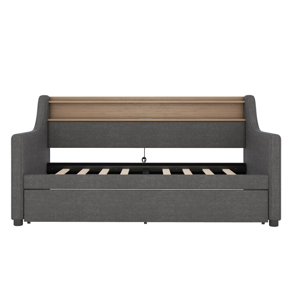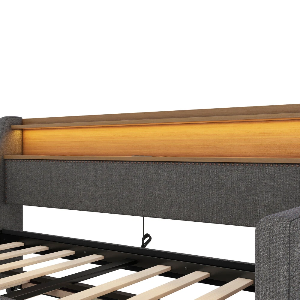 Twin Size Daybed w/ Trundle Bed, Upholstered Daybed w/ Charging Station and LED Features Stylish and Elegant Design--Our daybed with trundle is made of PU leather. With high backrest which lying more comfortable, two armrests make your hands free. Bronze nail head trim make this twin daybed more stylish and classic. A timeless design concept combined with a thick padded back and four side foam filled makes our daybed stand out from ordinary bed frame and brings you a comfort experience and soft touch. Charging Station--The built-in power socket comes with 2 USB ports and 2 outlets, allowing you to easily charge your electronic device while relaxing your body and mind. LED RGB Light--The LED light with a remote control offers 16 static colors and speed adjust and brightness adjust provide personalized lighting atmosphere for your night. Choose the color you like and completely immerse yourself in the beautiful night time. Storage Headboard--The headboard storage provides you with an extra place to store magazines, phones, beloved photos and decorations which is very practical. Space Saving Trundle: The daybed come with a twin trundle bed equipped with smooth casters, serves as an additional sleeping space for guests or sleepovers to maximize your room space. Durable Frame--Our daybed frame is made of solid MDF and plywood, with dense and strong support to withstand the weight of 330 lbs. This sturdy construction ensures that the frame is strong and the backrest will not wobble but also ensures lifetime usage. Description Description Upgrade your room with this simple and modern style, with bronze nailhead for decoration. A twin trundle bed, with LED light and charging station which will look luxurious in your room. Description & Dimensions Overall Product Dimension 79.5"L x 45.3"W x 37.4"H Size Twin Color Gray Numbers of Package 2 Overall Product Weight 119.05LBS Weight Capacity 330LBS Mattress Thickness 8 inch for daybed, 4-5 inch for trundle bed Product Material Linen Box Spring Required No