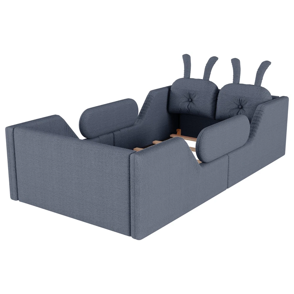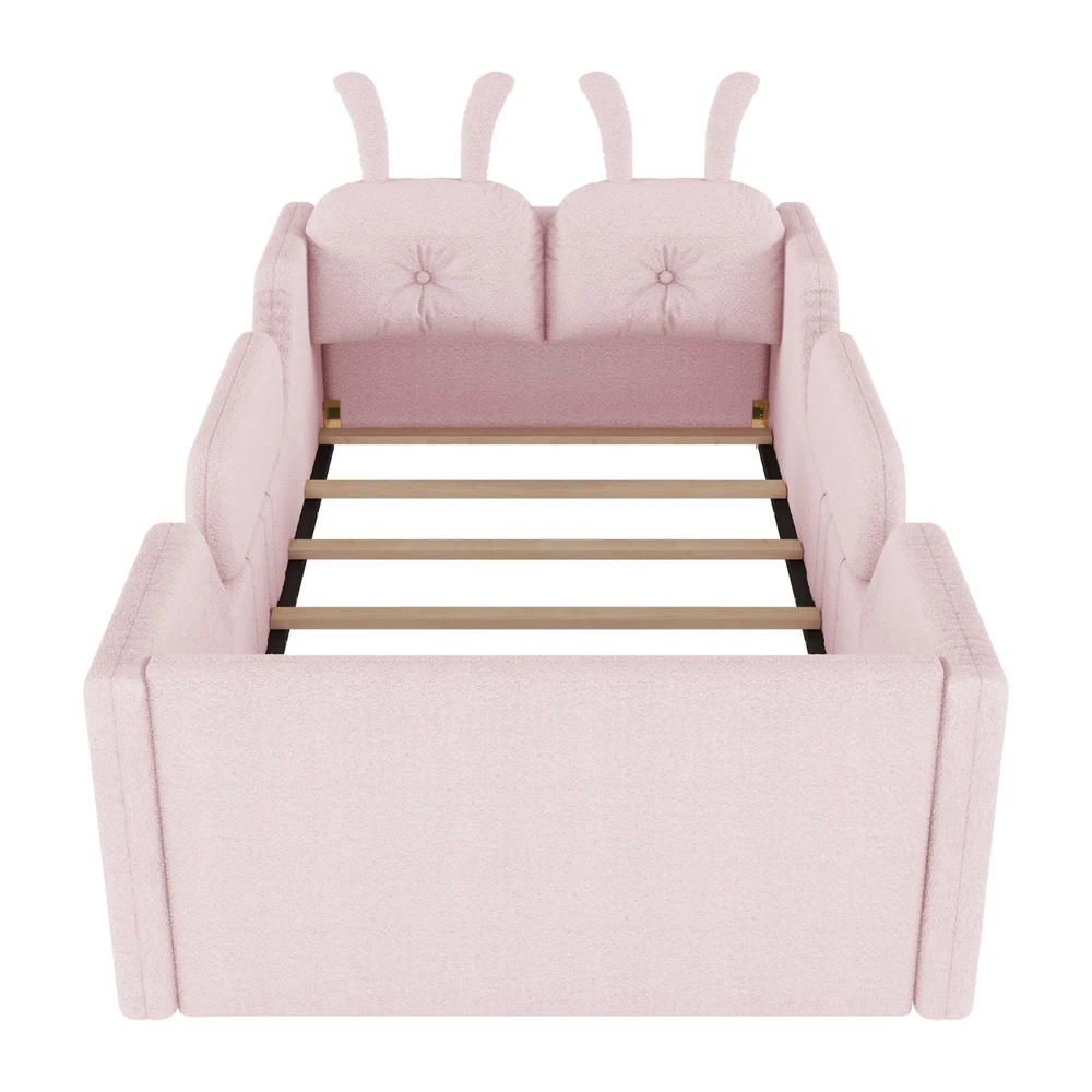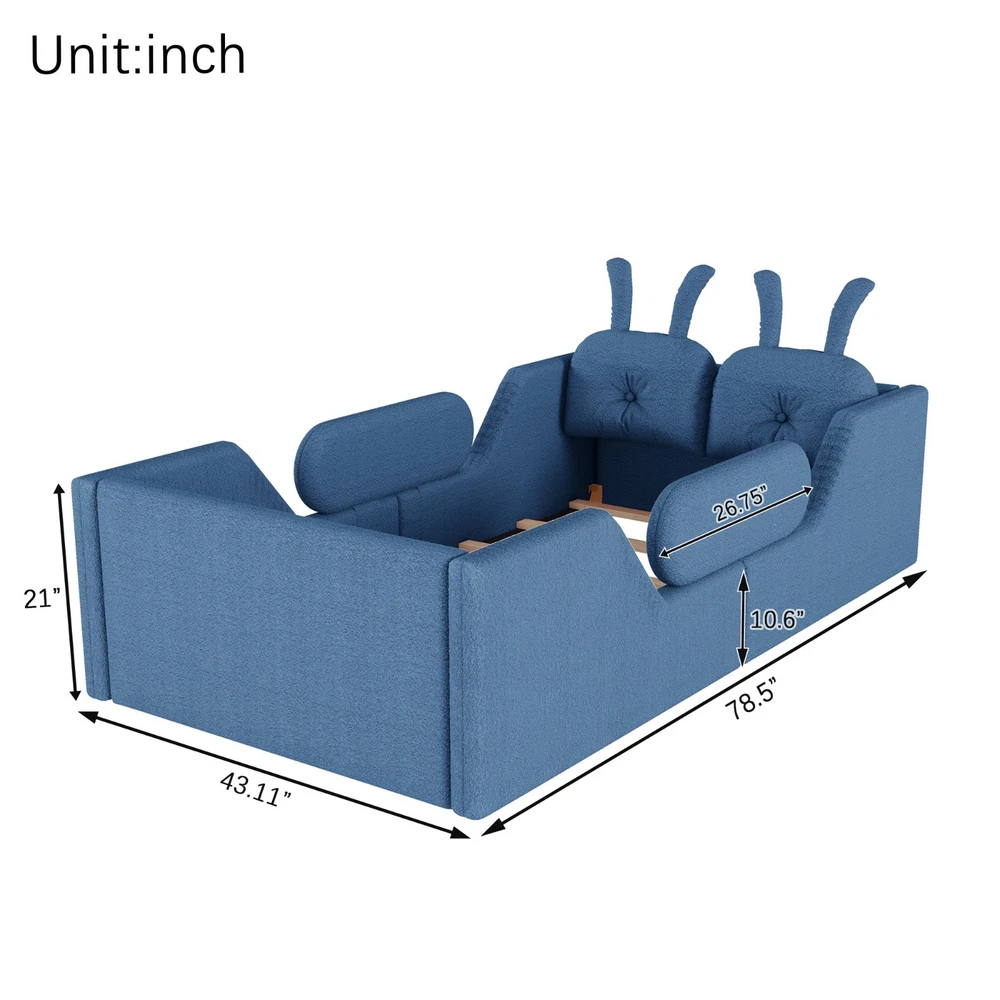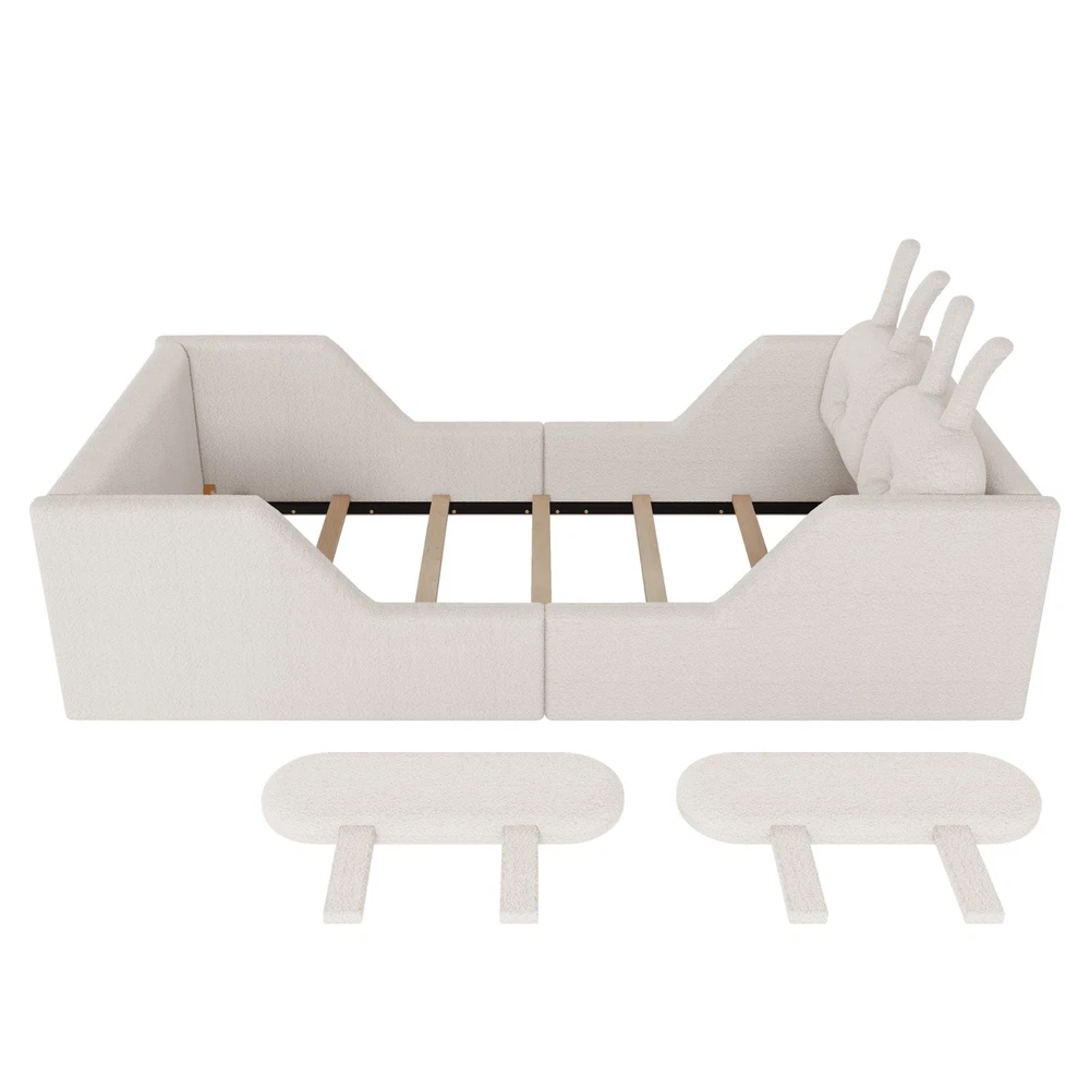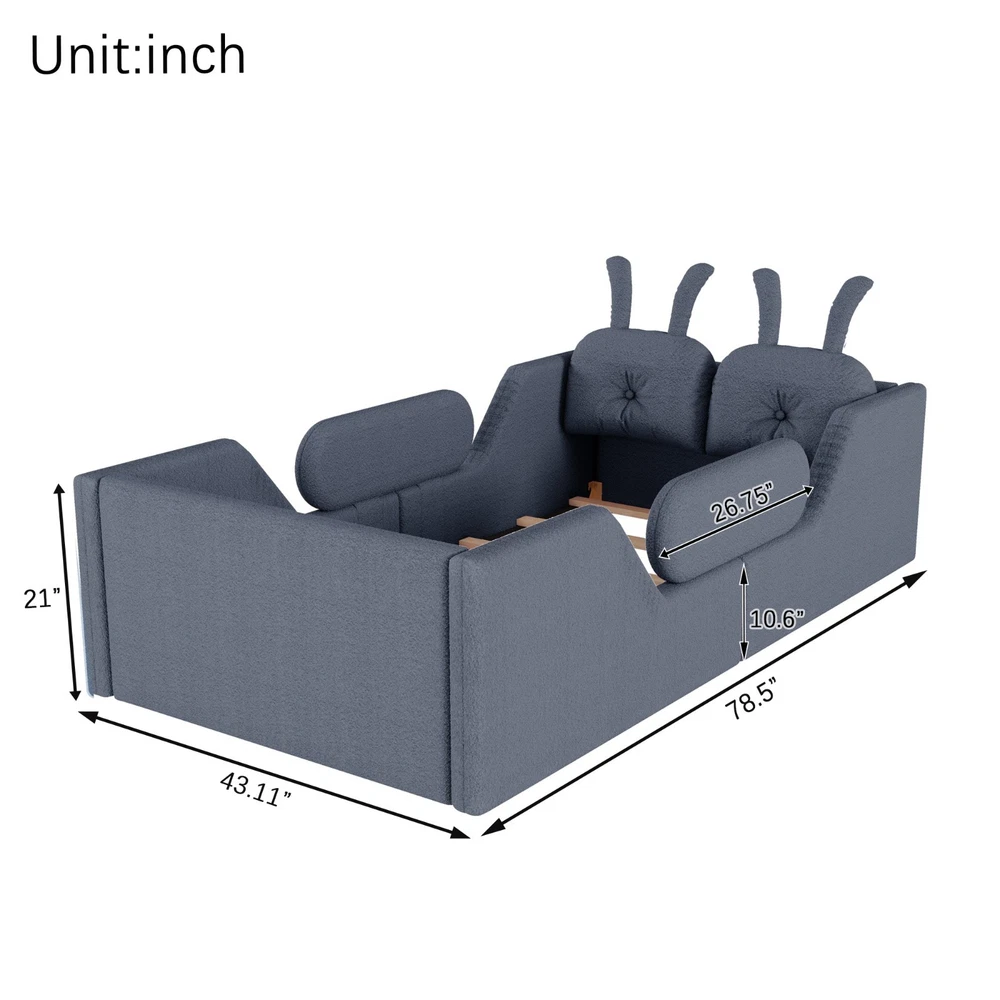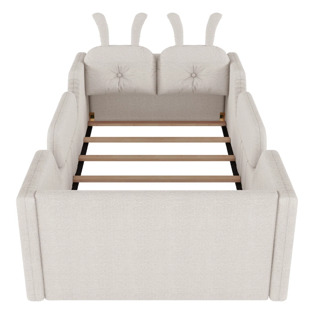 Product Feature [High Guardrails]-The 21” inch height of kids floor bed suitable for mattresses of various thicknesses to improve the safety of children's activities. Also eliminates the risk of any nasty falls and bumps, designed to create a safe space to roam and sleep for kids. [Whole Soft Design]-Kids floor bed is made from soft Teddy fabric and filled by high quality foam which get soft hand feeling and protect your kids away from hurt. [Removable Side Rails]-There are 2 small safety side rails come with this kids upholstered bed. The extra safety rails could avoid your kids fall down from bed during the time they are sleeping, more safety for little kids. And the rails can be removed if no need after growing up. [Rabbit Cushions]-Feature with 2 rabbit-shaped back cushions at headboard and fix with velcro. Can be removed for washing. The cushions is vacuum-packed. You just need to take off the packing and fluff in minutes. [No Need Box Spring]-No need box spring, height is deeper than most children’s beds so that you can choose 8 inch mattress. Instruction and tools included for easy assembly. Product Description Twin Size Upholstered Platform Bed with Rabbit Cushion 21 inch height for 8 inch thicker mattress, included the rabbit cushion make this bed more cute, and removable side rails for safety, teddy fabric with foam padding for soft feeling and avoid your kids from hurt. Description & Dimensions Color: White Material: Teddy Fabric Overall Dimensions: 78.5*43.11*21” (L x W x H) Size: Twin Recommended Mattress Thickness 8”(not included) Weight Capacity: 250LBS Net Weight: 97 lbs Gross Weight 105.6 lbs Box Spring Required No Country of Origin Vietnam
