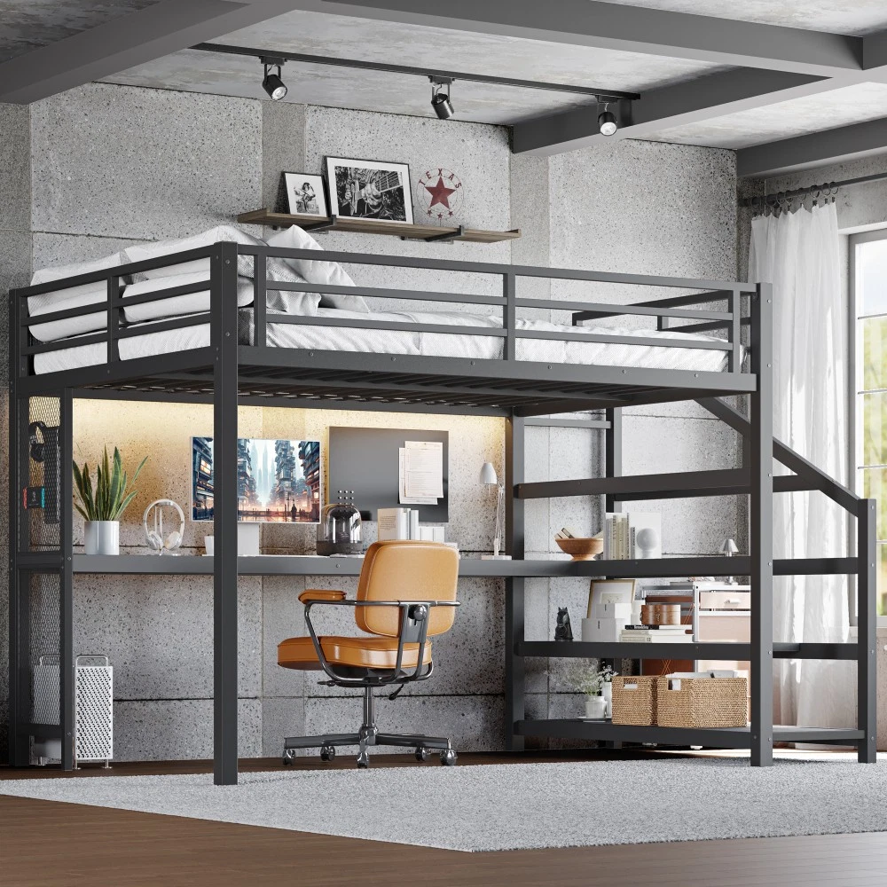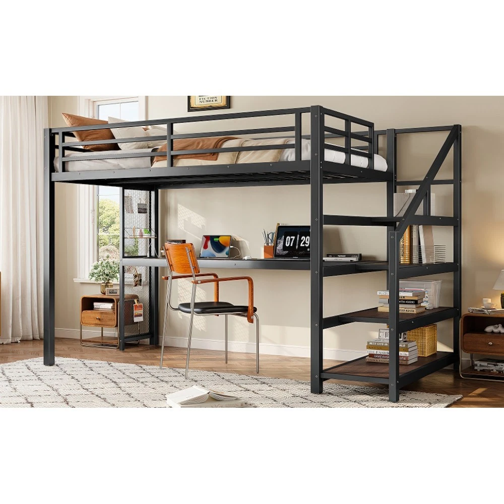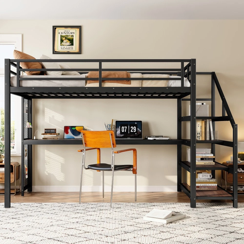 Twin XL Loft Bed with Desk & Storage Stairs, Metal Frame with LED Lights & USB Ports, Noise-Free Black Upgrade your small space with this multifunctional Twin XL loft bed—perfect for apartments, dorms, or family bedrooms! Combining a sturdy sleeping area with a built-in desk, storage stairs, and thoughtful tech features, this bed maximizes every inch of your room while blending style and practicality. Crafted from durable metal and MDF, it offers reliable stability, quiet comfort, and all the functionality you need for studying, working, and relaxing. Space-Saving & Multifunctional Design : This loft bed transforms your room into a versatile living space by integrating a built-in desk, storage stairs, and unique iron nets. The desk provides a dedicated workspace for studying or working, while the stairs offer convenient access to the upper bed (no shaky ladders!) and extra storage options. The iron nets let you hang photos, calendars, or small accessories, adding a personalized touch to your space and keeping essentials within reach. Built-In LED Lights & USB Ports : Stay cozy and connected with built-in LED lights and convenient USB ports. The soft LED lighting creates a warm, inviting atmosphere—ideal for reading or relaxing before bed—while the USB ports let you charge your phone, tablet, or laptop without messy cords. It’s the perfect blend of comfort and tech convenience for modern living. Durable & Stable Metal Frame : Constructed from premium steel with a rust-resistant finish, this loft bed frame ensures long-lasting durability and reliable stability. It supports up to 500 LBS for the upper bed, providing a safe sleeping space for daily use. The combination of metal and MDF materials adds sturdiness, making it a durable addition to your home. Noise-Free Sleep Experience : Designed with noise-reducing rubber plugs, this loft bed minimizes squeaks and friction caused by movement. Enjoy quiet, restful sleep every night without disruptions—perfect for light sleepers or shared living spaces. Easy Assembly Process : All parts are clearly labeled and come with detailed illustrated instructions and a complete tool kit. You can assemble this loft bed quickly and securely without professional help or hassle, getting your new space set up in no time. Key Product Specifications : Color: Black; Material: Metal + MDF; Bed Size: Twin XL; Overall Dimensions: 98.43"L × 41.73"W × 64.96"H; Overall Product Weight: 117.73 LBS; Weight Capacity: 500 LBS (Upper Bed); Recommended Mattress Thickness: 6" (Box Spring Not Required); Product Type: Metal Loft Bed. Package Information : This combo item ships in 2 separate boxes for safe delivery: Box 1 (W1580P407712): 44.49"L × 17.13"W × 5.71"H, 61.51 LBS; Box 2 (W1580P407710): 83.86"L × 14.96"W × 4.92"H, 69.89 LBS. All hardware and assembly tools are included. Important Notes : All pictures are taken from actual samples. Slight chromatic aberration may occur due to lighting conditions or differences in display devices. Please refer to the actual product for the most accurate details. Worry-Free Purchase Guarantee : We stand behind the quality of this Twin XL loft bed with a 1-Year Warranty. If you’re not completely satisfied with your purchase for any reason, we offer a 30-Day Free Return & Exchange Policy. Shop with confidence, knowing you’re getting a stylish, functional, and durable solution for your small space!