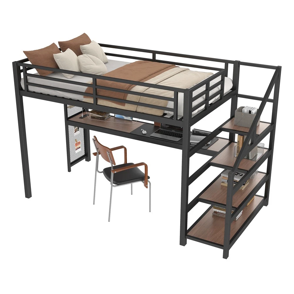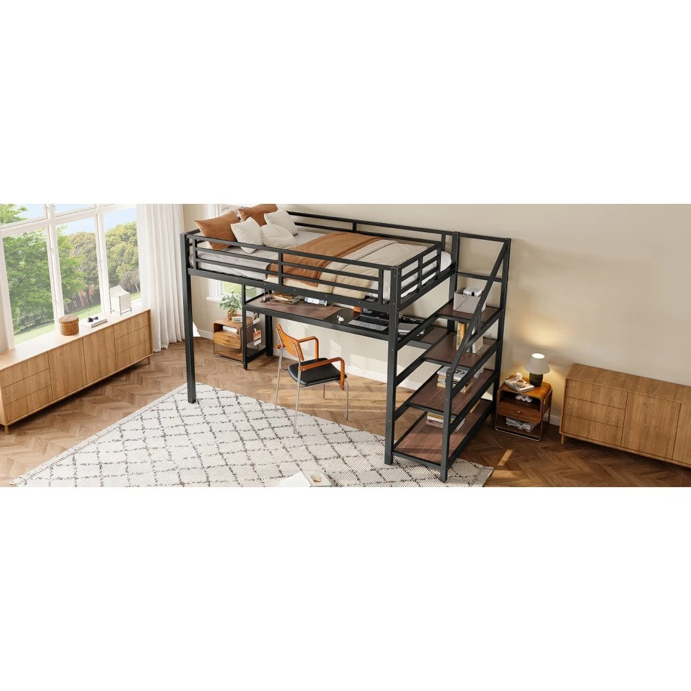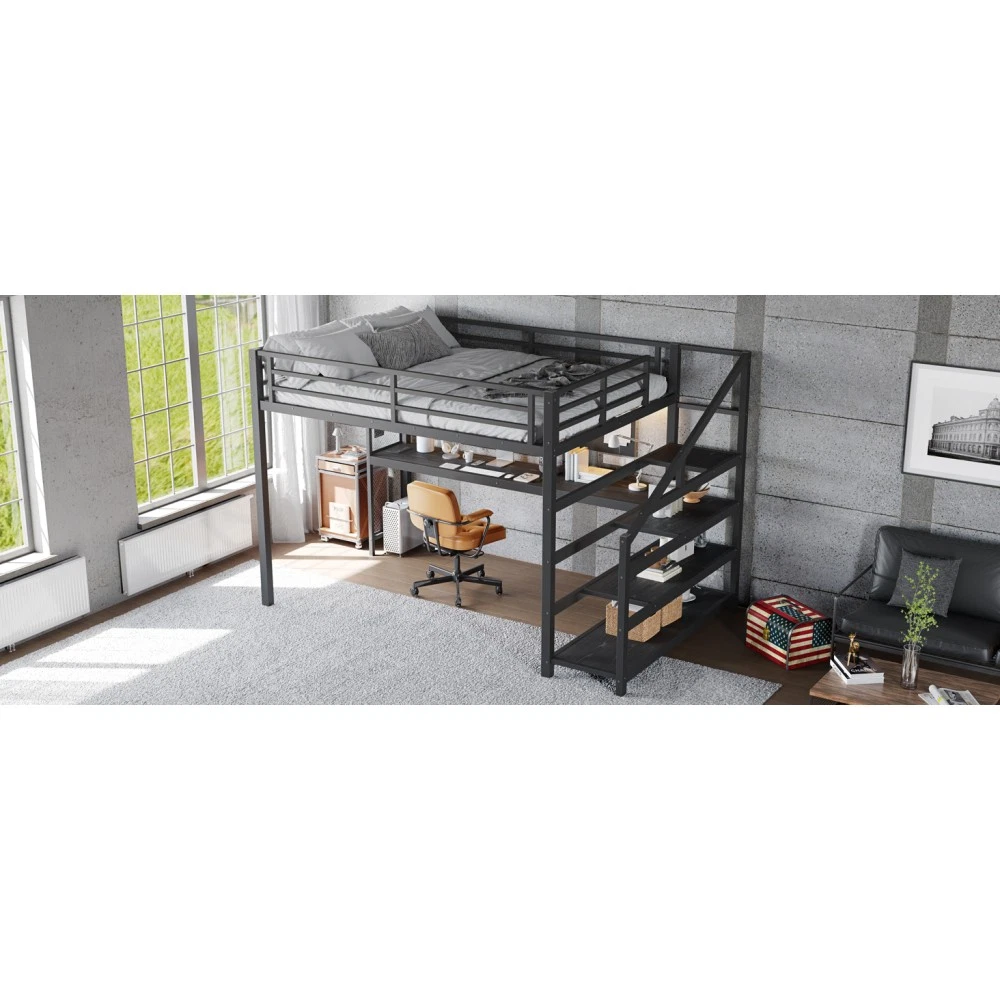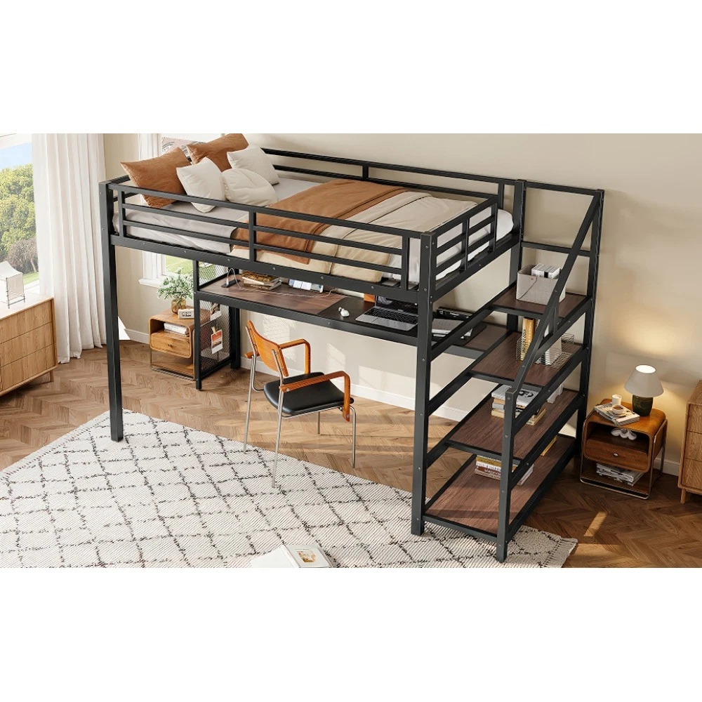 Twin XL Loft Bed with Desk & Storage Stairs, Metal Frame with LED Lights & USB Ports, Noise-Free Black Upgrade your small space with this multifunctional Twin XL loft bed—perfect for apartments, dorms, or family bedrooms! Combining a sturdy sleeping area with a built-in desk, storage stairs, and thoughtful tech features, this bed maximizes every inch of your room while blending style and practicality. Crafted from durable metal and MDF, it offers reliable stability, quiet comfort, and all the functionality you need for studying, working, and relaxing. Space-Saving & Multifunctional Design : This loft bed transforms your room into a versatile living space by integrating a built-in desk, storage stairs, and unique iron nets. The desk provides a dedicated workspace for studying or working, while the stairs offer convenient access to the upper bed (no shaky ladders!) and extra storage options. The iron nets let you hang photos, calendars, or small accessories, adding a personalized touch to your space and keeping essentials within reach. Built-In LED Lights & USB Ports : Stay cozy and connected with built-in LED lights and convenient USB ports. The soft LED lighting creates a warm, inviting atmosphere—ideal for reading or relaxing before bed—while the USB ports let you charge your phone, tablet, or laptop without messy cords. It’s the perfect blend of comfort and tech convenience for modern living. Durable & Stable Metal Frame : Constructed from premium steel with a rust-resistant finish, this loft bed frame ensures long-lasting durability and reliable stability. It supports up to 500 LBS for the upper bed, providing a safe sleeping space for daily use. The combination of metal and MDF materials adds sturdiness, making it a durable addition to your home. Noise-Free Sleep Experience : Designed with noise-reducing rubber plugs, this loft bed minimizes squeaks and friction caused by movement. Enjoy quiet, restful sleep every night without disruptions—perfect for light sleepers or shared living spaces. Easy Assembly Process : All parts are clearly labeled and come with detailed illustrated instructions and a complete tool kit. You can assemble this loft bed quickly and securely without professional help or hassle, getting your new space set up in no time. Key Product Specifications : Color: Black; Material: Metal + MDF; Bed Size: Twin XL; Overall Dimensions: 98.43"L × 41.73"W × 64.96"H; Overall Product Weight: 117.73 LBS; Weight Capacity: 500 LBS (Upper Bed); Recommended Mattress Thickness: 6" (Box Spring Not Required); Product Type: Metal Loft Bed. Package Information : This combo item ships in 2 separate boxes for safe delivery: Box 1 (W1580P407712): 44.49"L × 17.13"W × 5.71"H, 61.51 LBS; Box 2 (W1580P407710): 83.86"L × 14.96"W × 4.92"H, 69.89 LBS. All hardware and assembly tools are included. Important Notes : All pictures are taken from actual samples. Slight chromatic aberration may occur due to lighting conditions or differences in display devices. Please refer to the actual product for the most accurate details. Worry-Free Purchase Guarantee : We stand behind the quality of this Twin XL loft bed with a 1-Year Warranty. If you’re not completely satisfied with your purchase for any reason, we offer a 30-Day Free Return & Exchange Policy. Shop with confidence, knowing you’re getting a stylish, functional, and durable solution for your small space!