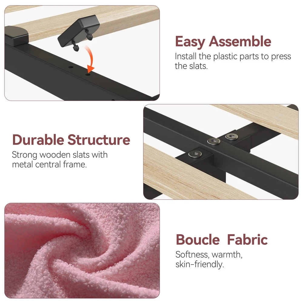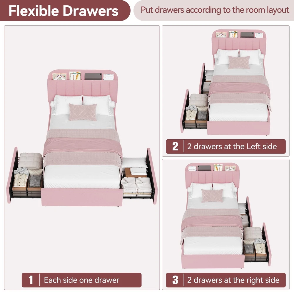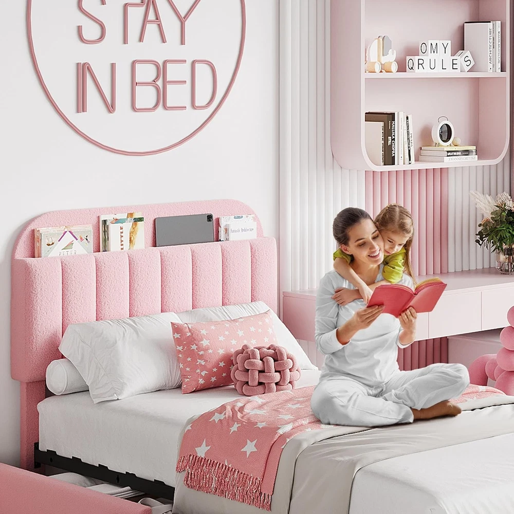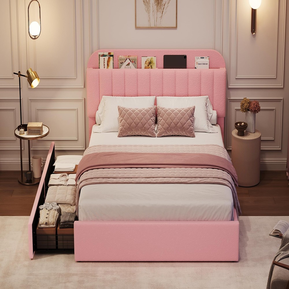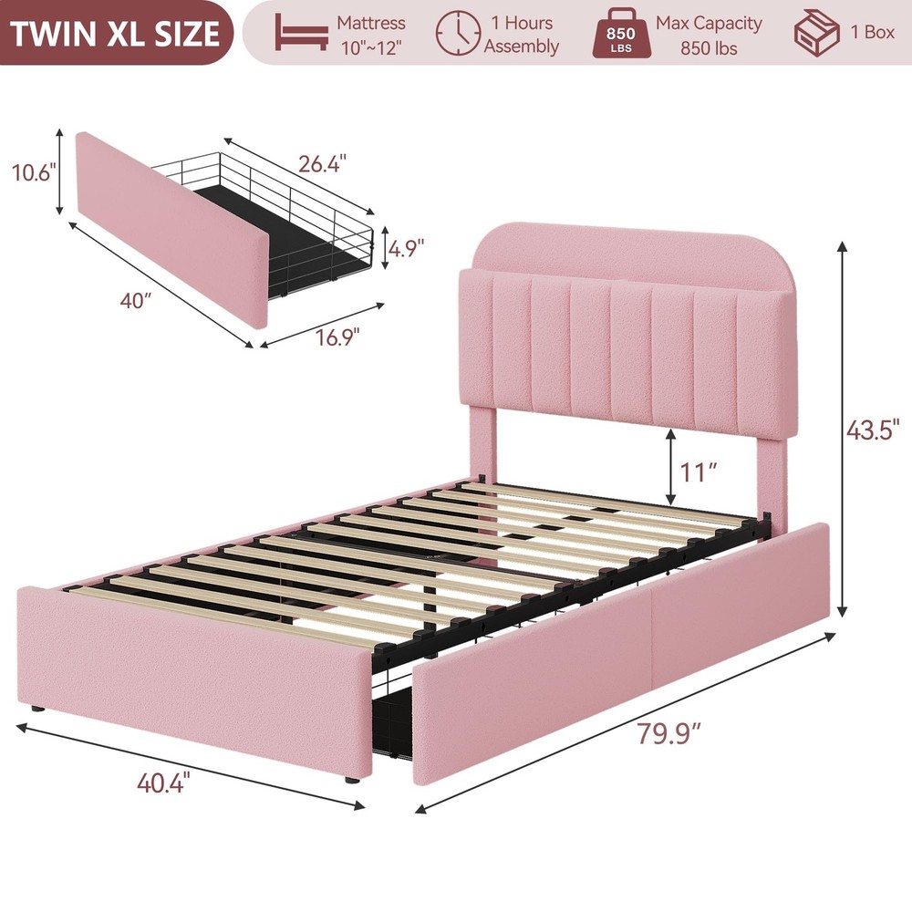 About this item FUNCTIONAL HEADBOARD: Stay organized with the innovative storage headboard featuring vertical space for books and personal items. The twin xl bed frame with soft padded design provides comfortable support for lounging, making it easy to enjoy your favorite reads or relax FLEXIBLE DRAWERS: This modern kids bed frame features 2 rolling storage drawers that can be placed on either side to meet your needs. Perfect for storing extra bedding or personal belongings, these drawers keep your space clutter-free and tidy LUXURIOUS UPHOLSTERY: Enjoy cozy sleep with the soft, warm teddy velvet upholstery of this twin xl size platform bed frame. Its luxurious texture boosts comfort and adds a stylish touch to your bedroom decor, making every night a delightful retreat STURDY AND NOISE-FREE: Constructed with a heavy-duty metal frame and sturdy wooden slats, this noise-free bed frame offers the stability needed for a restful night's sleep, with a load capacity of 850LBs. Enjoy peace and quiet without requiring a box spring SIMPLE ASSEMBLY: With a modern finish and vertical channel pattern, this upholstered bed frame complements any bedroom decor effortlessly. Clear instructions and labeled parts make assembly straightforward, allowing you to enjoy your new bed quickly Package Included Bed Frame Installation Tool User Manual Payment Delivery details Terms of sales About us Contact us Payment We accept payment either via PayPal or any of the following credit cards; Visa, MasterCard, Discover, and American Express. Delivery details 1. We will delivery out at the handing time when we receive the payment. 2. The delivery time is 3-5 business days to US by usually time.The parcel maybe delay 1-2day of the weekend.Due to the bad weather,Holidays,Hot Season ect.the parcel maybe delay,If you have any problems,mssage us,we will try our best to solve it. 3. We ship to your eBay address. Please make sure your eBay address is correct before you pay. 4. If you want to change the shipping address,message us before our send out. Terms of sales If you are not satisfied with the item for any reason, please do not quick to leave negative/neutral feedback even open request and case without any communication with us. We devote ourselves making EVERY CUSTOMER in 100% Satisfactory and resolve any problem. Thank you for your understanding and recognition,we are always leave positive feedback to all our customers. About Reply: All replies will be sent to your email box, if you do not get response within 24 hours (Sat. & Sun. excluded) please check your eBay My Messages in case that our emails will be filtered automatically by your settings. About us automobilee-01 is a brand new store but we are one of North America’s top online suppliers of specialized, high-quality aftermarket online retailers and suppliers, committed to developing new markets. We primarily offers tool sets, auto parts, home goods, etc..With over 20 years of product selection and manufacturing experience, we delivers unparalleled quality, value, service and satisfaction. Our highly-trained, professional staff offer in-depth knowledge and personalized assistance for customers worldwide. Providing our customers with a simple, hassle-free experience with best-in-class customer service is more than a goal. Contact us Any problem please rest assure to contact us by eBay message first. We will reply you as soon as we can. We will deal with it within 24hs on working days. Brand Unbranded Compatible Mattress Size Twin XL Frame Material Engineered Wood, Metal Type Bed Frame Features Sturdy and Durable, With 2 Storage Drawers, Bookcase Headboard Room Bedroom Manufacturer Warranty 5 Years Color Pink Assembly Required Yes Shape Rectangular Style Contemporary/Modern Mattress Included No Department Adults Model Twin XL Size Bed Frame MPN Does not apply Item Length 79.9 in Item Width 40.4 in Item Height 43.5 in Product Dimensions 79.9"L x 40.4"W x 43.5"H Care Instructions Easy Care Number of Drawers 2 Maximum Weight 850 Pounds