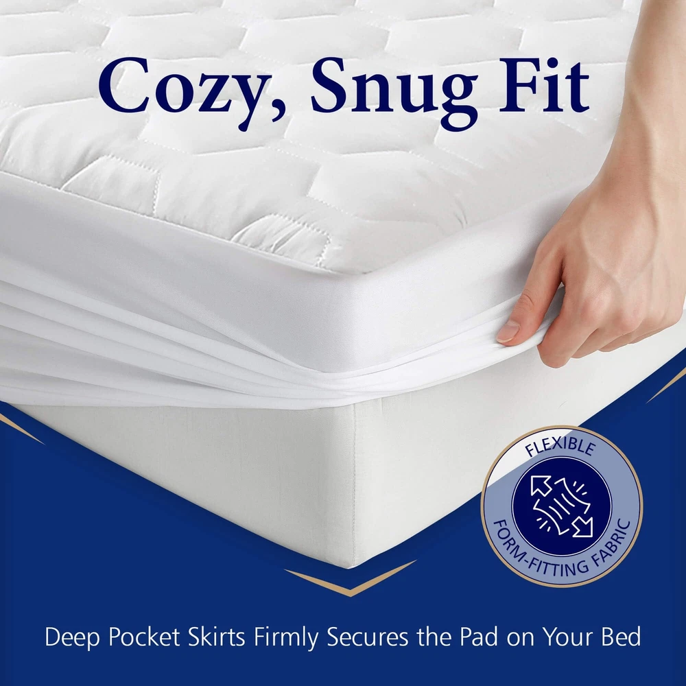 Fantastic Protection: Our top quality mattress cover effectively Protects your mattress from dirt, dust and dander. This mattress pad is surely a grand one! Hypoallergenic, Comfortable to sleep on. Without any Plastic Noise When Moving Around. Fits Perfectly Well, Deep Pockets, Came In a Clear Plastic Carrying Case That Will Be Great for Storage and Travel. The nice stitching pattern gives it that fine touch. Keeps everything together and in place, It will not slip off of your bed... All Sizes: Twin: 39x75x10”. The 12" skirt will stretch to fit a mattress up to 14" deep! Twin XL: 39x80x10”. The 16" skirt will stretch to fit a mattress up to 14" deep! Full: 54x75x12". The 12" skirt will stretch to fit mattress up to 16" deep! Full XL: 54x80x12”. The 16" skirt will stretch to fit mattress up to 16" deep Queen: 60x80x14". The 16" skirt will stretch to fit a mattress up to 18" deep! King: 78"x80x14". The 15" skirt will stretch to fit a mattress up to 18" deep! Cal King: 72 x 84x14". The 16" skirt will stretch to fit a mattress up to 18" deep! Style: Quilted, Fitted. Top fabric: 50% cotton/50% polyester. Back: 100% polyester. Skirt: 100% polyester. Fill: 100% polyester. MATTRESS PROTECTOR: Mattress Pad will not only restore your mattress’ look to a beautiful appearance, but it will protect your current mattress from any further damage. By acting as a protective barrier, mattress pad helps shield your mattress from spills, stains, and general wear and tear, effectively prolonging its lifespan. SOFT & SMOOTH POLY-COTTON MATERIAL: mattress pad combines two of the best materials for bedding; cotton and polyester. The Mattress pad has the softness and smoothness that polyester offers and the comfort and coolness is delivered by the high quality cotton we material. HYPOALLERGENIC: Made from high quality cotton and polyester has been designed from hypoallergenic materials to ensure a comfortable and easy sleep. DURABLE AND LONG LASTING: Mattress Cover is made from high quality material ensuring it will not fade or fall apart even after years of use. QUICK AND EASY TO FIT ON BED: Simply slip our mattress pad over your mattress, secure it with the elasticized skirt, and enjoy instant comfort and protection.