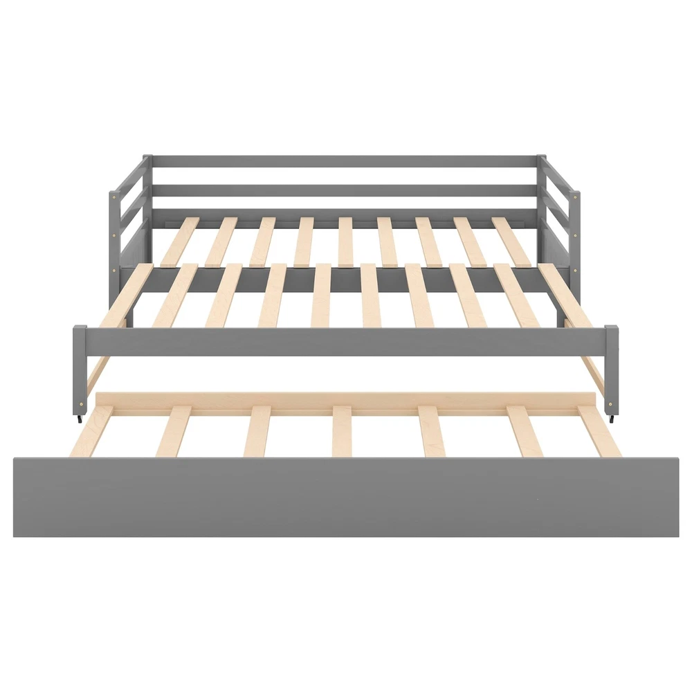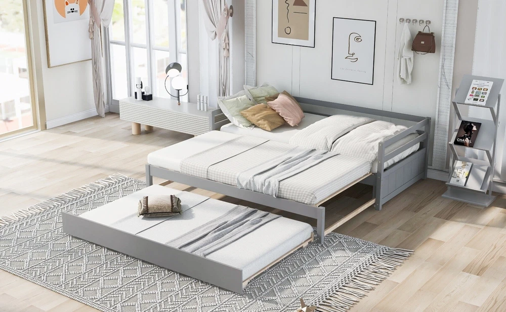 You may like Metal Floor Bunk Bed, Twin XL over Queen, Black New $294.74 Free shipping & Free return Twin Size Rabbit-Shape Upholstered Princess Bed with Headboard & Footboard New $246.91 Free shipping & Free return Metal Floor Bunk Bed, Twin over Full,White(OLD SKU:MF193244AAK) New $278.27 Free shipping & Free return Twin Storage House Bed for kids with Bedside Table, Trundle, White New $260.28 Free shipping & Free return King Size Canopy Platform Bed with Headboard and Support Legs, Grey Wash New $354.36 Free shipping & Free return Ceres Metal Bed, Black with Walnut Wood Headboard&Footboard, Queen New $172.23 Free shipping & Free return Bed frame with charging station queen size,87.80'' L x 61.80'' W x 39.2'' H New $184.45 Free shipping & Free return Full Size Metal & Wood Platform Bed with Headboard & Footboard, White New $185.07 Free shipping & Free return Wood Daybed with Three Drawers ,Twin Size Daybed,No Box Spring Needed ,White New $368.15 Free shipping & Free return Twin Bed with Trundle,Bookcase,Grey New $296.31 Free shipping & Free return Platform Bed with Twin Size Trundle, Twin Size Frame, Espresso New $280.15 Free shipping & Free return Twin Size Upholstered Velvet Platform Bed with Shell-Shaped Headboard, Blue New $220.22 Free shipping & Free return Full Size Upholstered Bed Frame with LED, Velvet Platform, Tufted Headboard New $251.70 Free shipping & Free return Twin Size Upholstered Boucle Fabric Platform Bed with Cloud-Shaped Headboard New $219.81 Free shipping & Free return Twin Size Upholstered Velvet Platform Bed with Shell-Shaped Headboard, Pink New $220.22 Free shipping & Free return Full size Daybed, Wood Slat Support, with Bedside Shelf and Two Drawers, White New $467.43 Free shipping & Free return Twin Wood Platform Bed with All-in-One Cabinet & 8 Drawers, Gray New $963.61 Free shipping & Free return Twin Metal Platform Bed Frame w/ Wooden Headboard, Footboard & USB LINER New $143.24 Free shipping & Free return Twin Upholstered Bed with Strawberry Headboard & Footboard, Pink New $176.10 Free shipping & Free return Modern White Solid Wood King Platform Bed (old sku:WF283526AAK) New $367.15 Free shipping & Free return Metal Floor Bunk Bed, Twin XL over Queen, Black New $294.74 Free shipping & Free return Twin Size Rabbit-Shape Upholstered Princess Bed with Headboard & Footboard New $246.91 Free shipping & Free return Metal Floor Bunk Bed, Twin over Full,White(OLD SKU:MF193244AAK) New $278.27 Free shipping & Free return Twin Storage House Bed for kids with Bedside Table, Trundle, White New $260.28 Free shipping & Free return King Size Canopy Platform Bed with Headboard and Support Legs, Grey Wash New $354.36 Free shipping & Free return Specification Product Information Bed Size: Twin Bed Type: Daybeds Main Color: Gray Main Material: Pine Bed Frame Material: Wood Box Spring Requirements: Box Spring Not Required Product Dimensions Item Length (in.): 79.50 Item Width (in.): 118.10 Item Height (in.): 25.90 Weight (lbs.): 96.00 Package Size Length (in.): 80.31 Width (in.): 15.94 Height (in.): 6.10 Weight (lbs.): 100.31 Product Features [Simple Design] Twin or double twin daybed with trundle matches with any kind of decor and ideal for your bedroom or any small living spaces. [Twin or Double Twin] The twin size daybed can be pulled out as a double twin platform bed,and with the trundle,you can accommodate your friends or over-night guests. [Superior Quality] Our bed is is made of high-quality pine wood and MDF, with a modern look and solid structure, the design ensures strong stability and durability. [With Trundle] Fun and functional, our bed is the perfect addition to rooms of all design styles and it includes a trundle which can effectively utilize the room space. [Easy Assembly] Each order comes with a clear and detailed assembly instruction guide and all necessary tools are provided to get your bed assembled in no time. Description Twin or Double Twin Daybed with Trundle,Gray Give your the freedom to host friends in your own space with this versatile twin-sized daybed,featuring a rolling trundle bed underneath to accommodate overnight guests,and the twin daybed can be pulled out for a double twin size bed.Crafted from pine wood and MDF, this clean-lined design features an open frame in a clean finish with headboard and footboard. Thanks to this piece's neutral tones, it's sure to blend easily with any color palette your picks. Description Bed Frame Material Pine Wood+MDF Size Twin over Double Twin Color Gray Numbers of Package 1 Assembly Required Yes Dimensions Overall Product Dimension 79.5''L*118.1''W*25.9''H Daybed Dimension 76''x39.2'' (pull in) Daybed Dimension 76''x76.8'' (pull out) Trundle Dimension 74''x39.3'' Total Height 25.9'' Bed Weight Capacity 250lb Trundle Weight Capacity 250lb Overall Product Weight 96lb Slats of Daybed 9+10pcs Slats of Trundle 7pcs Recommend Daybed/Trundle Mattress Thickness 8-10''/6''