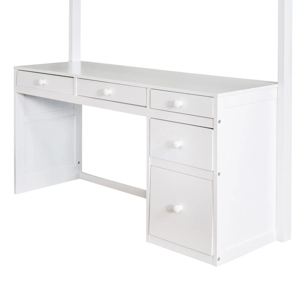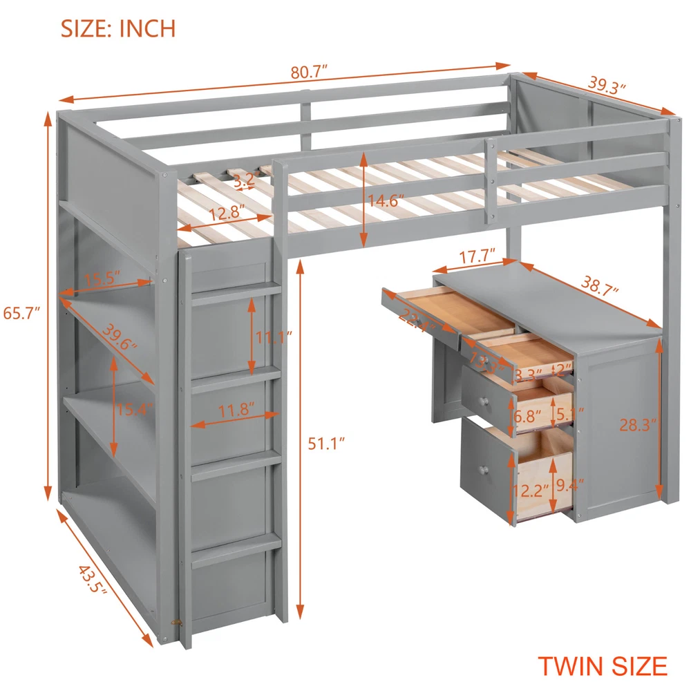 Description: If your family needs a bed that can sleep and study, this loft bed will be a good choice for you, it will have you saving space and maximizing functionality with a wide array of features. It is a perfect study area while also allowing space to store your belongings. Shelves and drawers under the bed can provide perfect space for individual creativity. The bed with comprehensive guardrails to ensure your sleep safety. You don't need to worry about its quality. The design of the bed is elegant and can fit into your bedroom well. Specification: [Maximized space] The space underneath the loft bed is a good place for you to read, do homework or play and create their own world to be explored. Total 3 shelves and 5 drawers provides maximum space for your decor, books. [Multi-function] We offer 2 different color schemes, which you can choose most suitable color matching your bedroom design. With unique design, this bed creates a fun and adorable space that not only serves as a comfortable sleeping area, but also double as a space for you to study or work. [Solid Construction] This muti-functional loft bed is crafted from a solid pine wood frame, with commercial grade MDF board for quality control and durability. Guardrails are solidly attached for added safety. [Health and Comfort] No box spring required, and without needing a foundation. The wood frame is sturdy and comes with slats for extra support and ensures air moves freely around your mattress to keep it fresh for years to come. Shipment We'll arrange orders in 1~2 working days, tracking number will be provided on eBay. For a few big items shipped by truck, need more handling time. Wholesale We offer better prices for wholesale customers Return 30-days return policy for any reason you are unhappy with your purchase.Return items must be in original condition. The cost of returning goods should be paid by your side. The return delivery cost will be paid by us if returning faulty/defective goods. Feedback Do contact with us for any quesiton , we will make you 100% satisfy for the purchase.