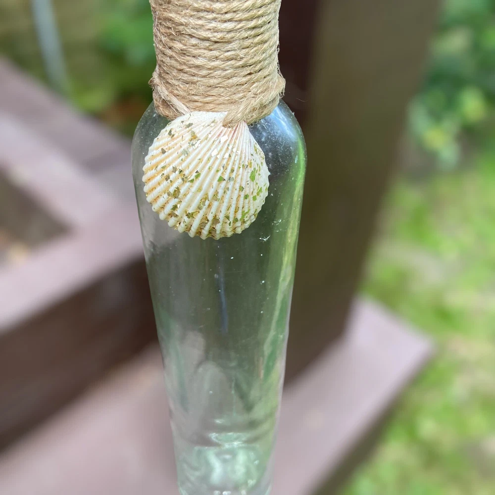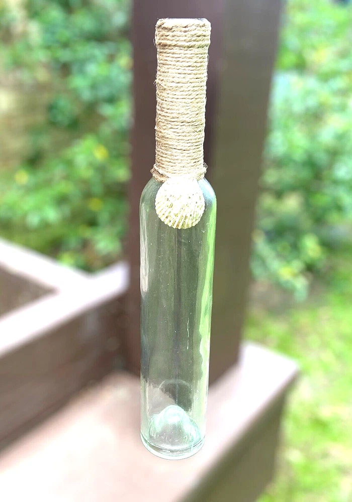 Twine Wrapped Cylinder Wine Bottle Decor. Crafted from clear glass, this decorative bottle features twine and a seashell and is perfect for any beach-themed room. Measuring 13 inches in height and 7 inches in diameter, this bottle is easy to care for and comes with a number of features that make it a great addition to your kitchen, living room, lounge, or dining room.
