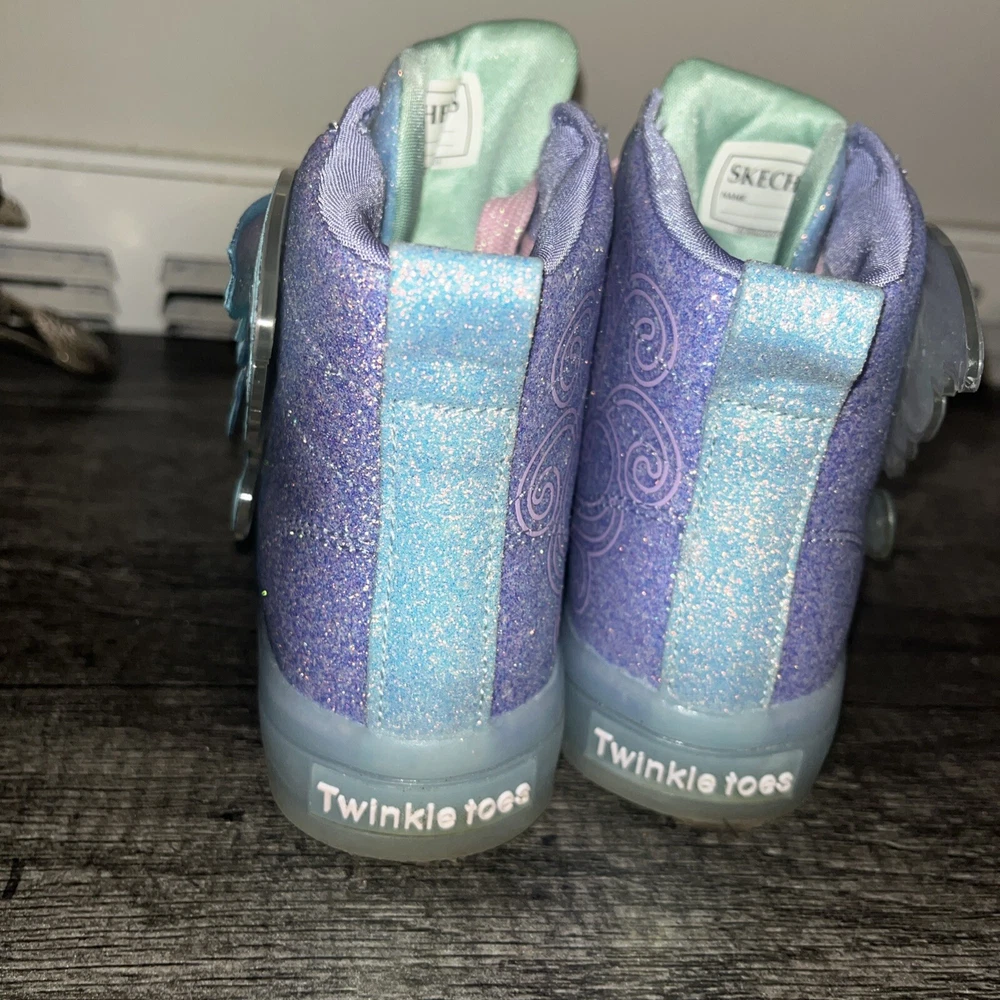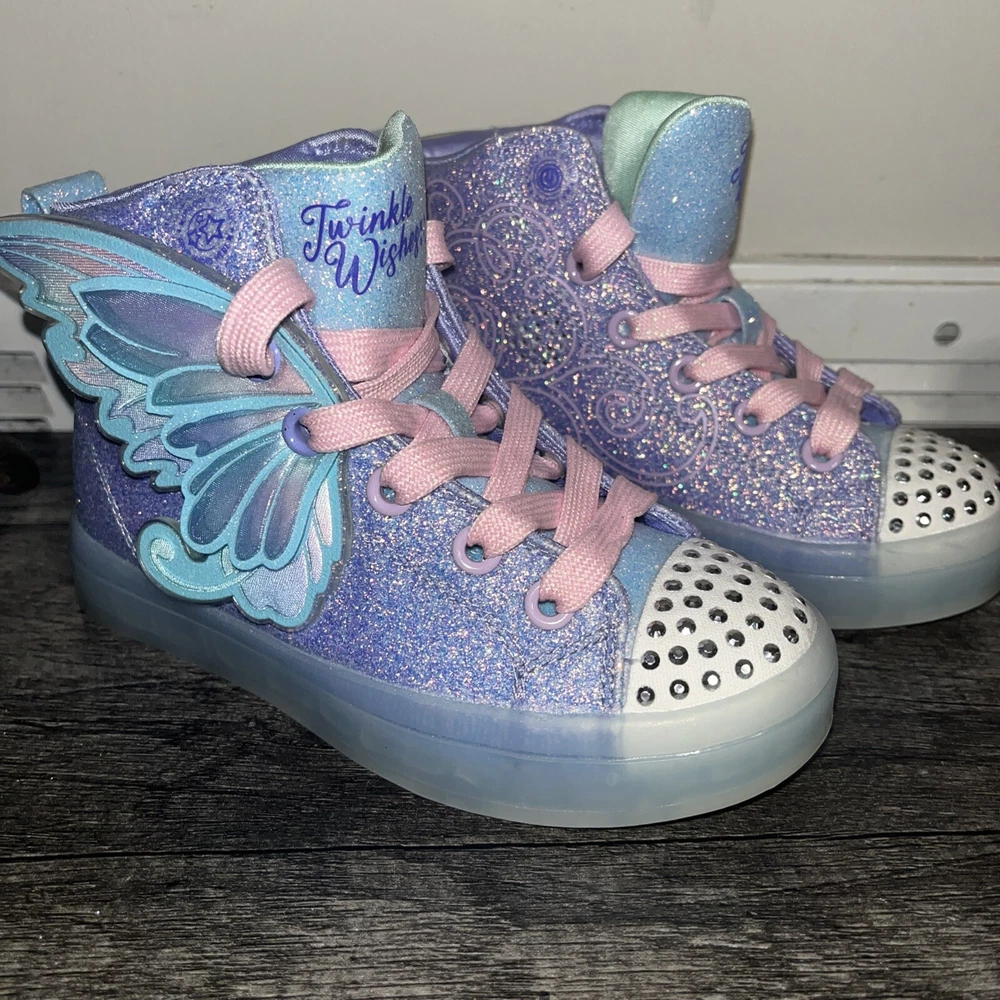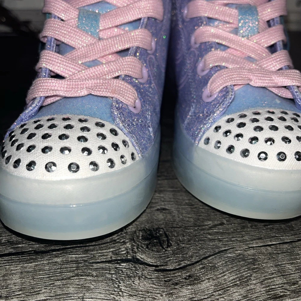 Twinkle Toes by Skechers Hightop Kids Sneakers in size 11 for girls are pink athletic shoes featuring the Twinkle Wishes and Twinkle Toes characters. The high-top style adds a trendy touch to these sneakers, making them both stylish and comfortable for young girls to wear.