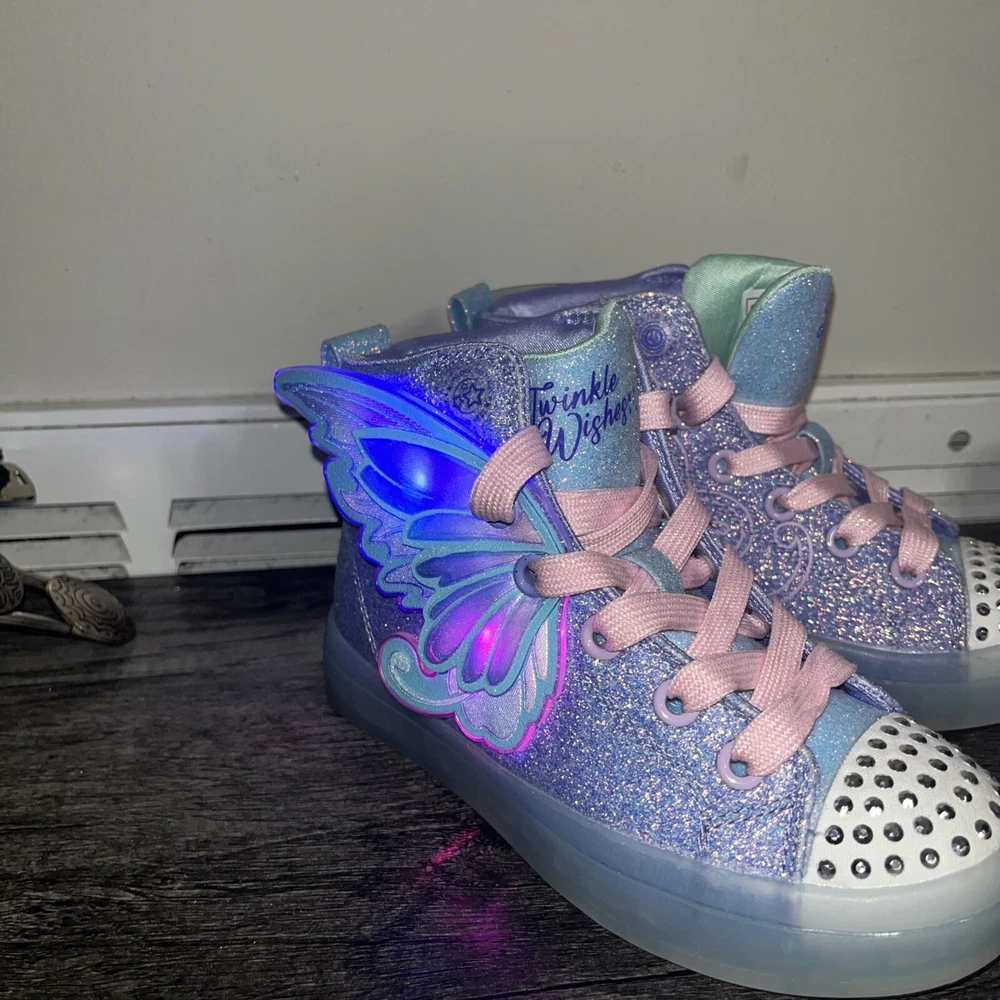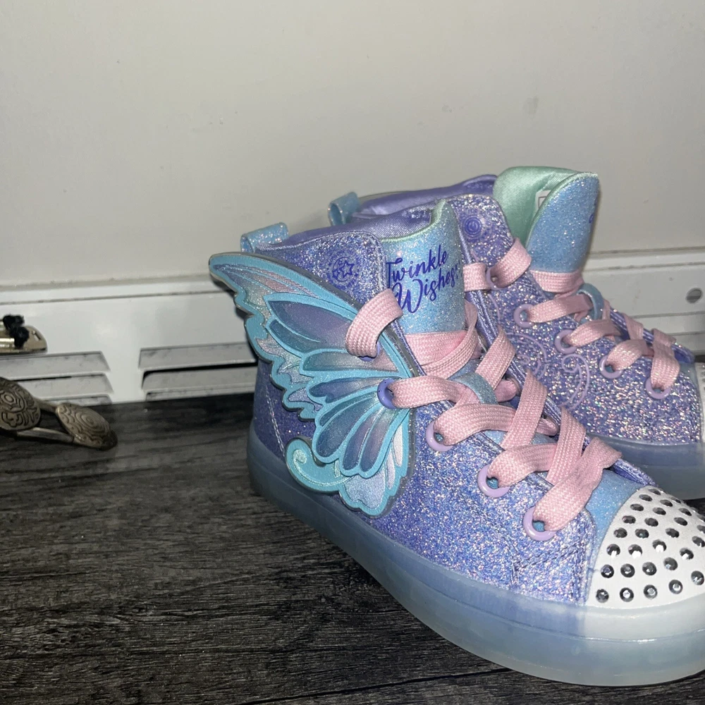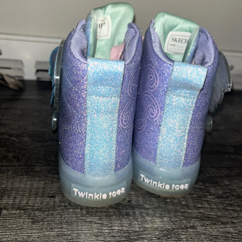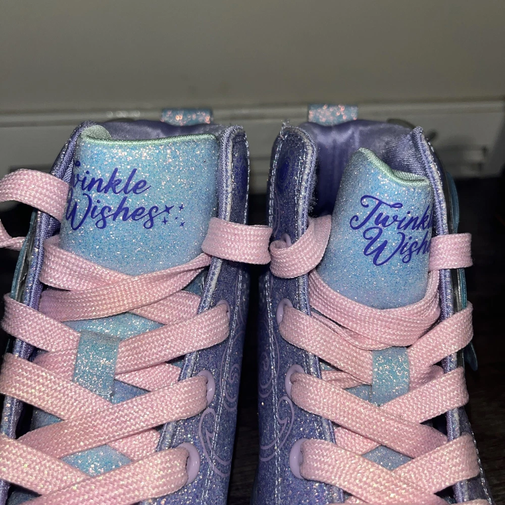 Twinkle Toes by Skechers Hightop Kids Sneakers in size 11 for girls are pink athletic shoes featuring the Twinkle Wishes and Twinkle Toes characters. The high-top style adds a trendy touch to these sneakers, making them both stylish and comfortable for young girls to wear.