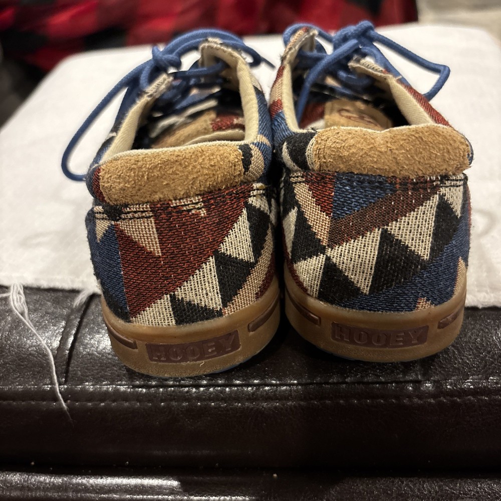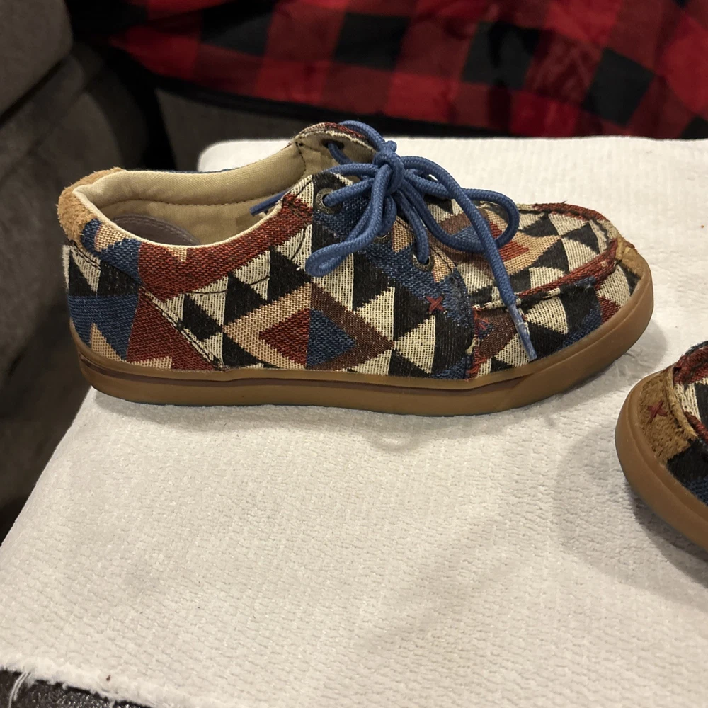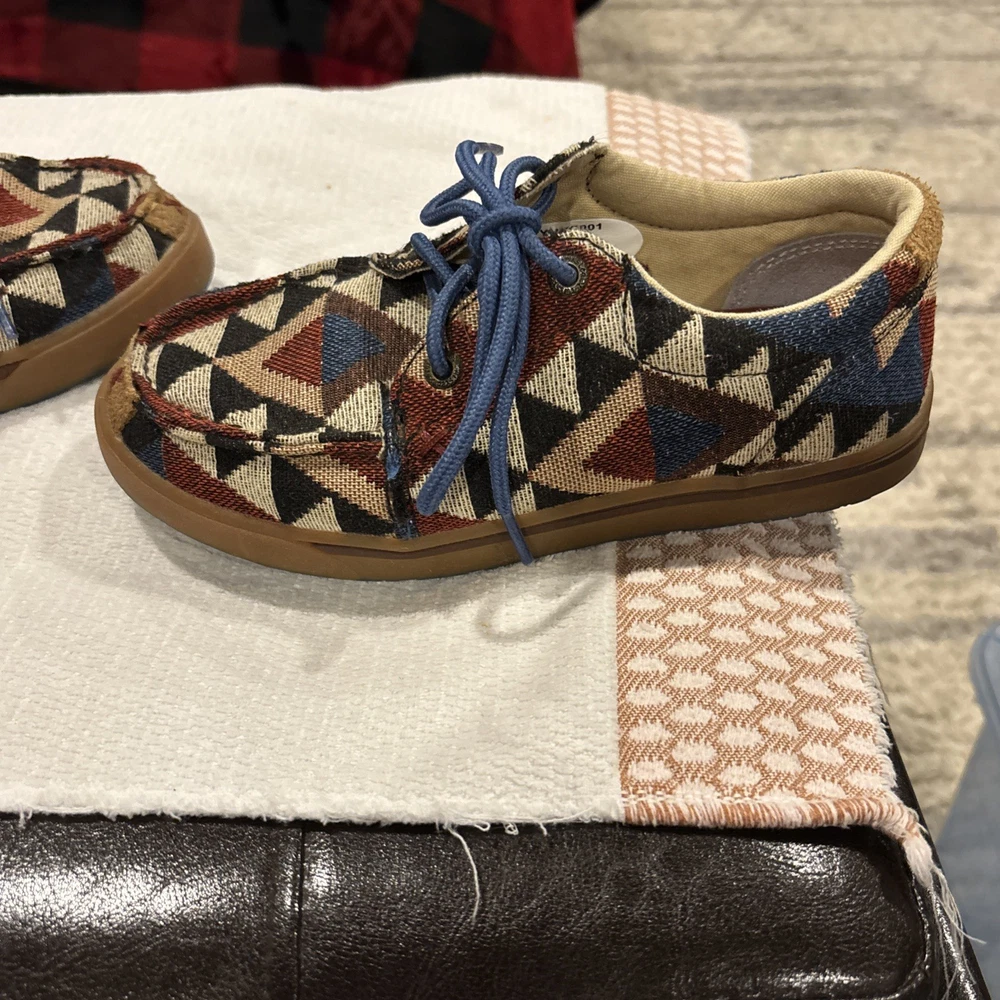 The Twisted X Hooey Loper Aztec Southwestern Canvas Mocs Shoes YHYC001 in size 1M are stylish and fun moccasins for boys. Featuring a colorful geometric Aztec pattern, lace-up closure, and comfortable canvas material, these shoes are perfect for everyday wear. The Twisted X Hooey brand ensures quality and durability, making these mocs a great addition to any young boy's wardrobe.