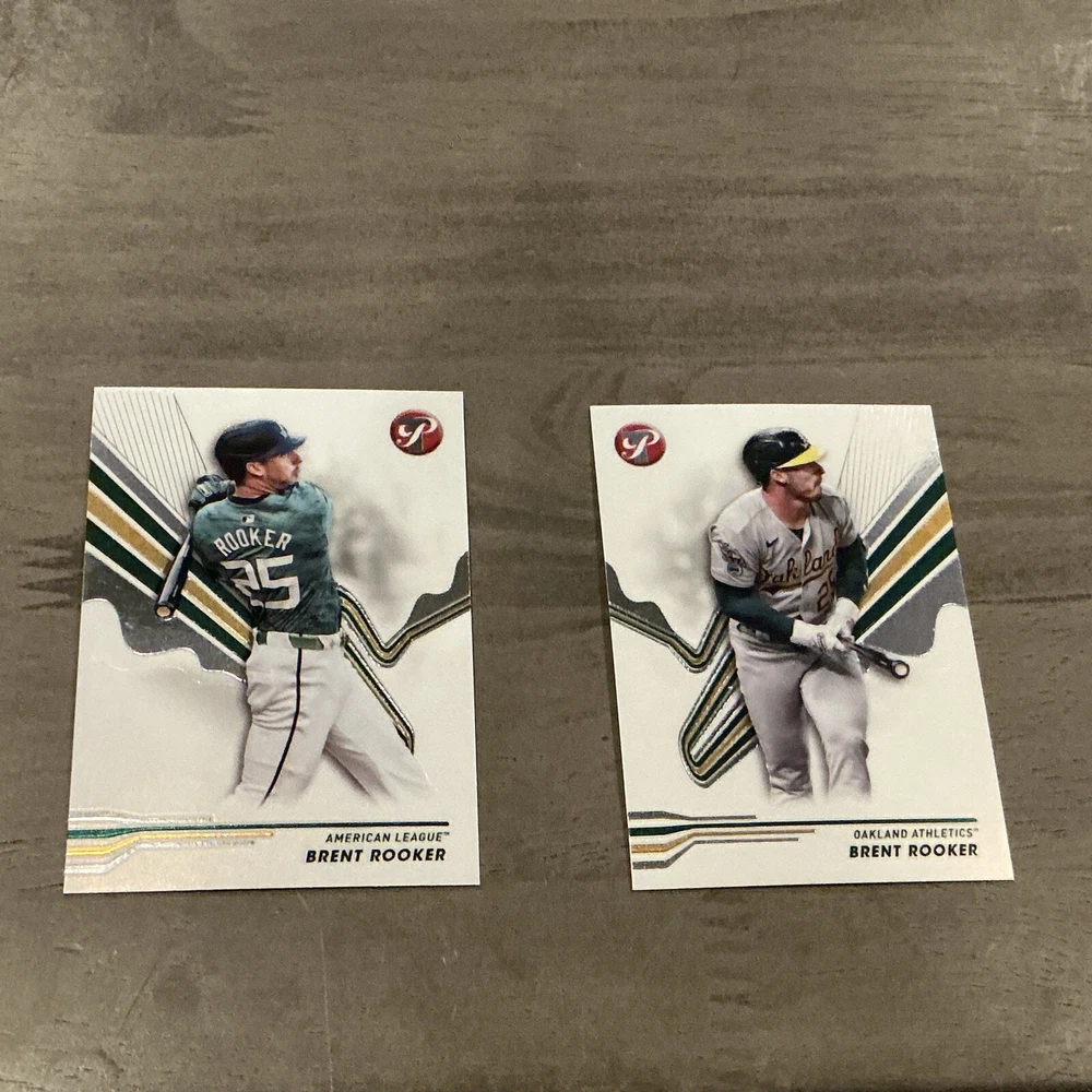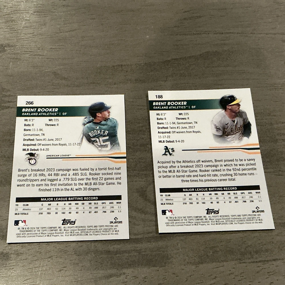 Elevate your baseball card collection with these 2024 Topps Pristine Brent Rooker cards. These two cards feature the Oakland Athletics' power hitter, capturing the essence of his performance on the field. The cards are numbered #188 and #266, each showcasing Brent Rooker in the vivid imagery that Topps is known for. The cards are part of the base set, offering fans and collectors a slice of Major League Baseball's 2024 season. As official Topps memorabilia, they are a must-have for enthusiasts of the sport and collectors alike. Add these pristine cards to your collection and hold a piece of the game's history in your hands.