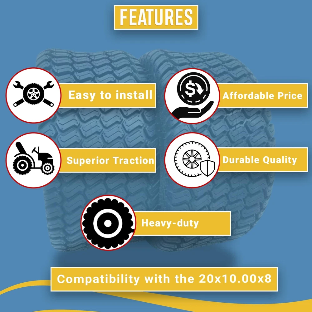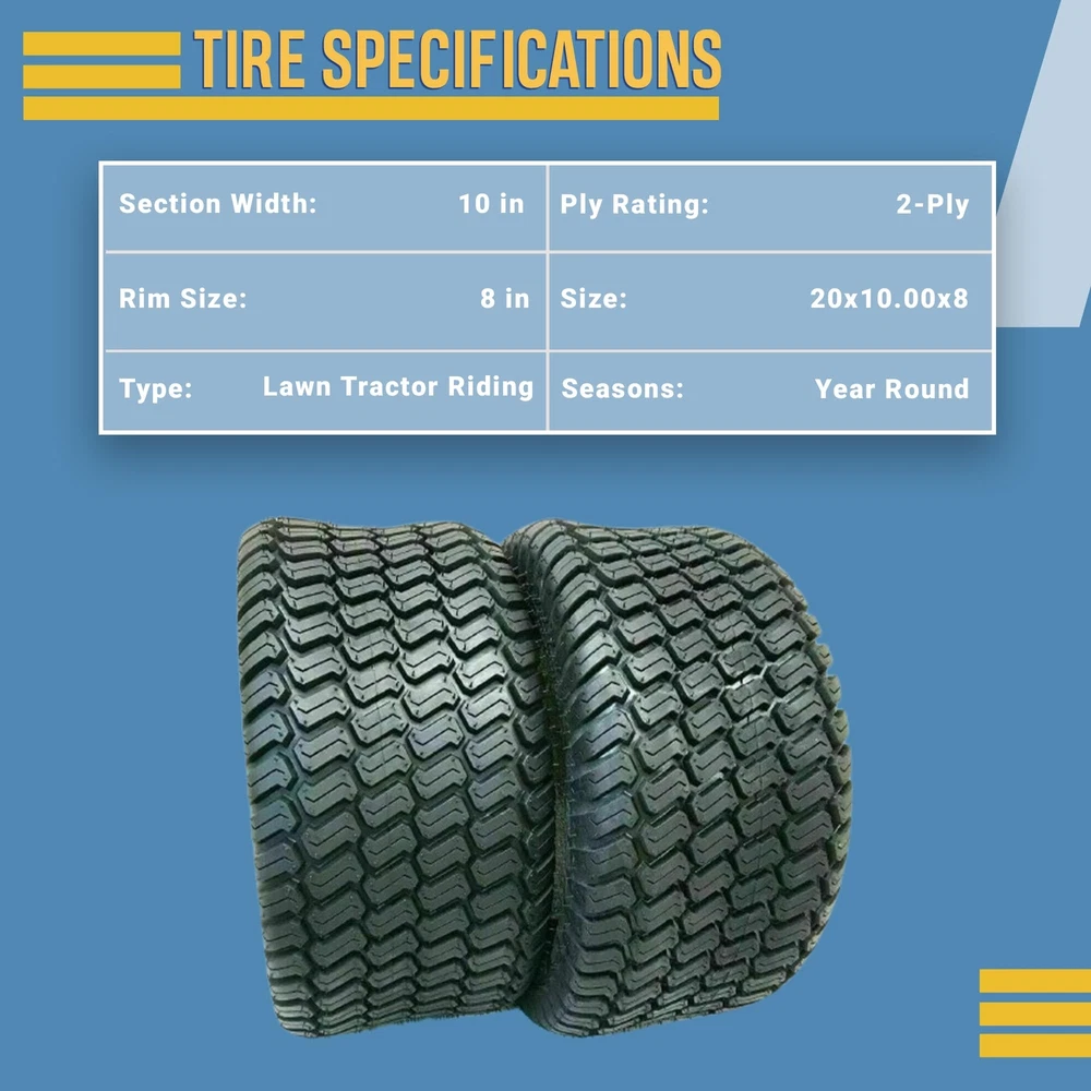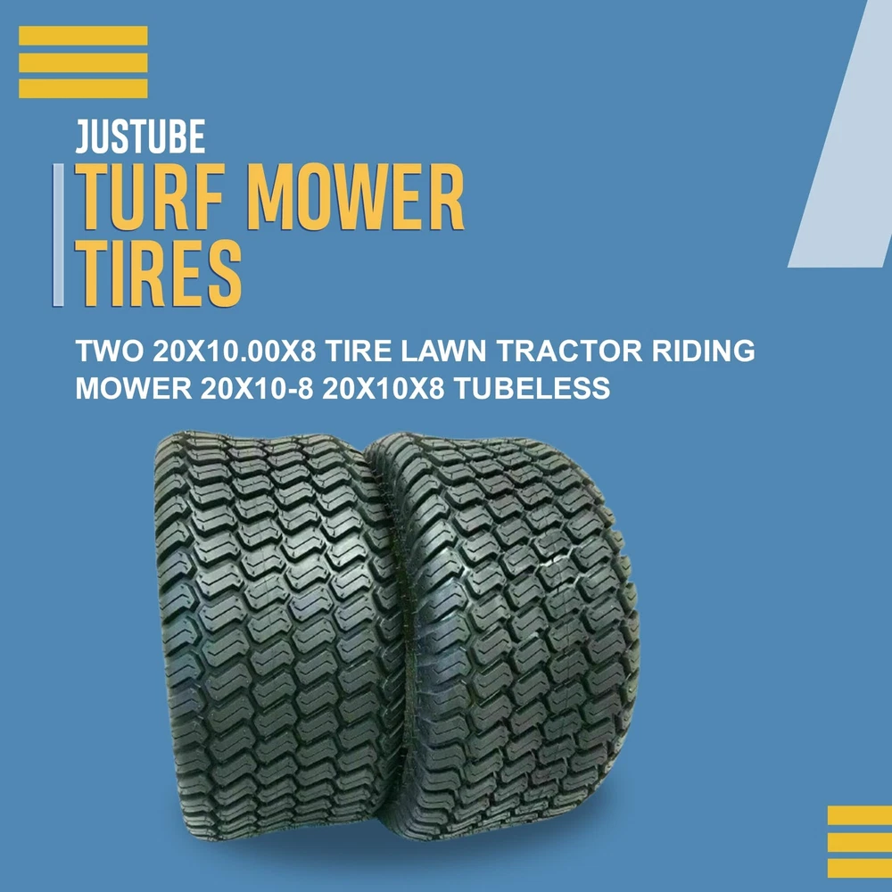 ADVANCED TRACTION TECHNOLOGY FOR OPTIMAL GRIP These two 20x10.00x8 tubeless tires are equipped with an advanced tread pattern designed to deliver superior traction, ensuring your lawn tractor maintains optimal grip on various terrains. TAILORED FOR RIDING MOWERS AND LAWN TRACTORS Specifically crafted to meet the demands of riding mowers and lawn tractors, these tires are engineered for high-performance functionality in lawn maintenance tasks. ROBUST TUBELESS CONSTRUCTION FOR DURABILITY Built with durability in mind, these tubeless tires are engineered to resist punctures and flats, providing a reliable and low-maintenance solution for your lawn tractor. PRECISION FIT WITH 20X10-8 SIZE The 20x10.00x8 size ensures a precise fit for your lawn tractor, contributing to stability and control during mowing and landscaping activities and enhancing the overall performance of your equipment. ENHANCED MANEUVERABILITY FOR EASY NAVIGATION Designed to improve the maneuverability of your lawn tractor, these tires make it easier to navigate through diverse landscapes with precision and control, ensuring efficient and effective lawn care